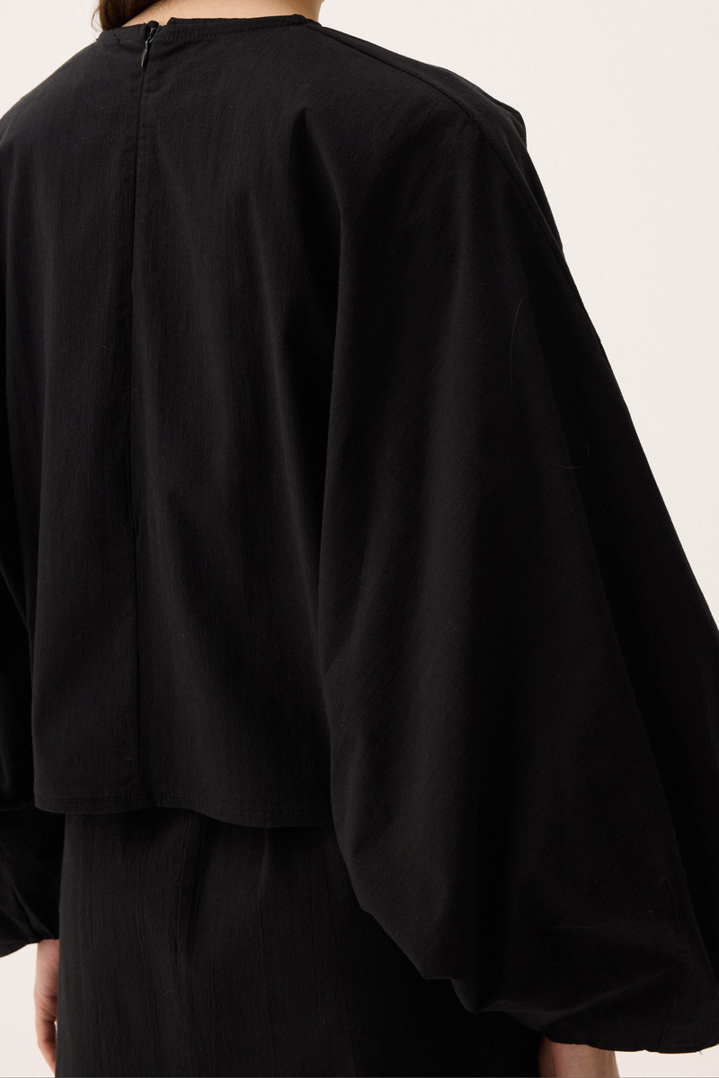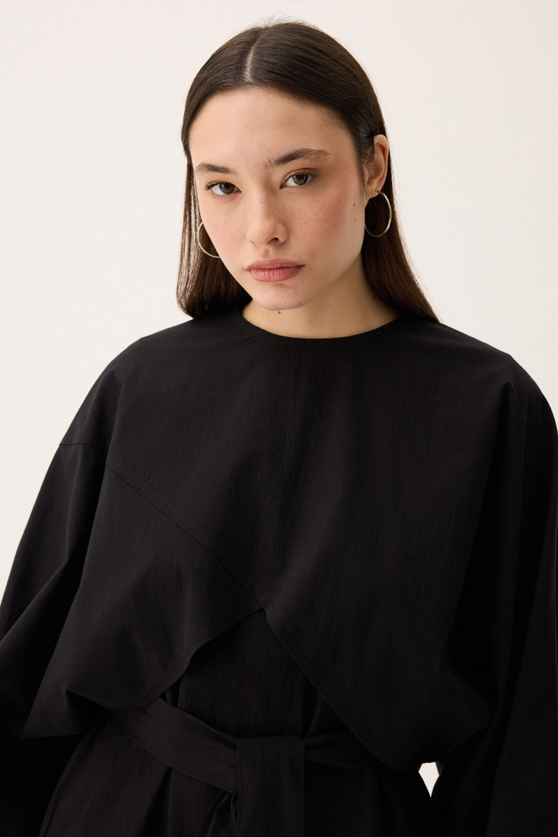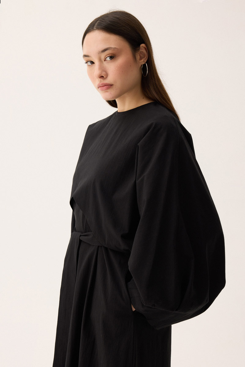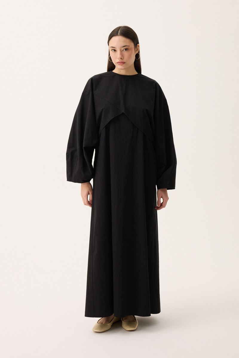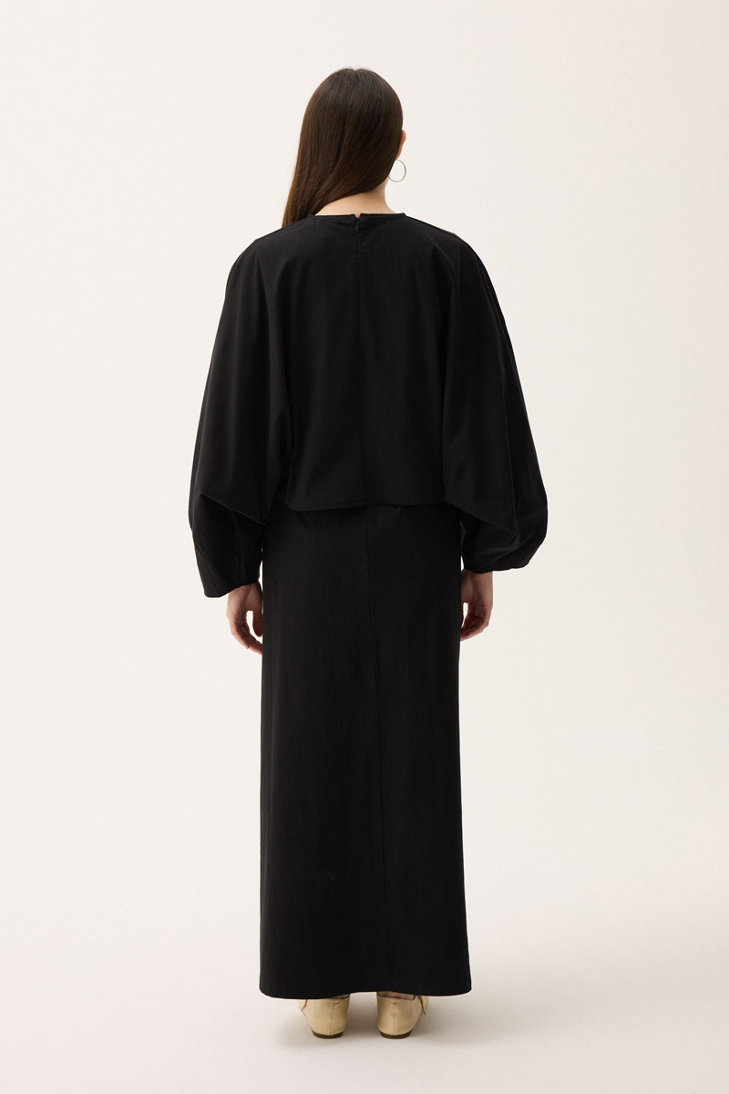 Croplu Elbise Takım Siyah. Crop bisiklet yakadır, düşük omuzludur, yandan cepli ve astarsızdır, iç jiledir, dış crop elbise takım kol ucu pens detaylı beli kusakli bol kalıptır, Günlük kullanım için uygundur.