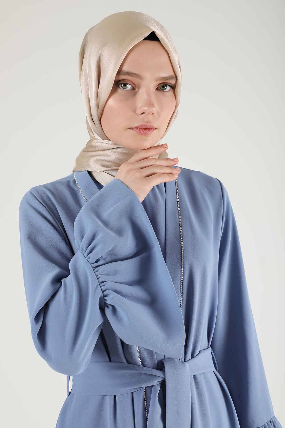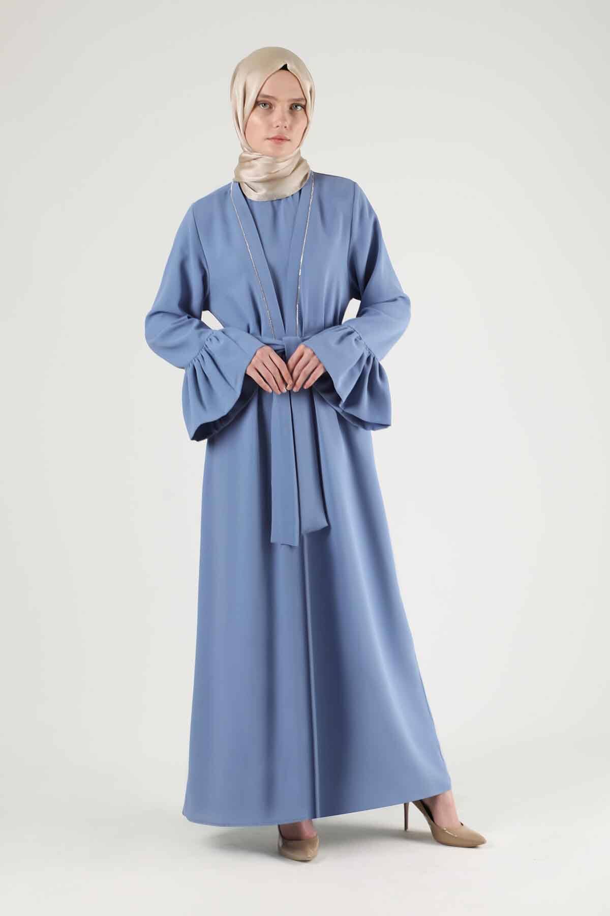 Cuff Flywheel Stone Abaya Suit Baby Blue. The sleeve mouth is flywheel. The inner dress has a dominant collar, and there is a stone detail under the collar, The inner dress has zero sleeves. It is belted. It has a zipper on the back, it is a normal pattern. You can choose it on your special days.