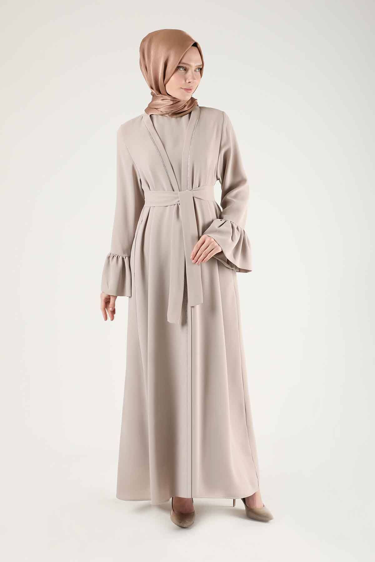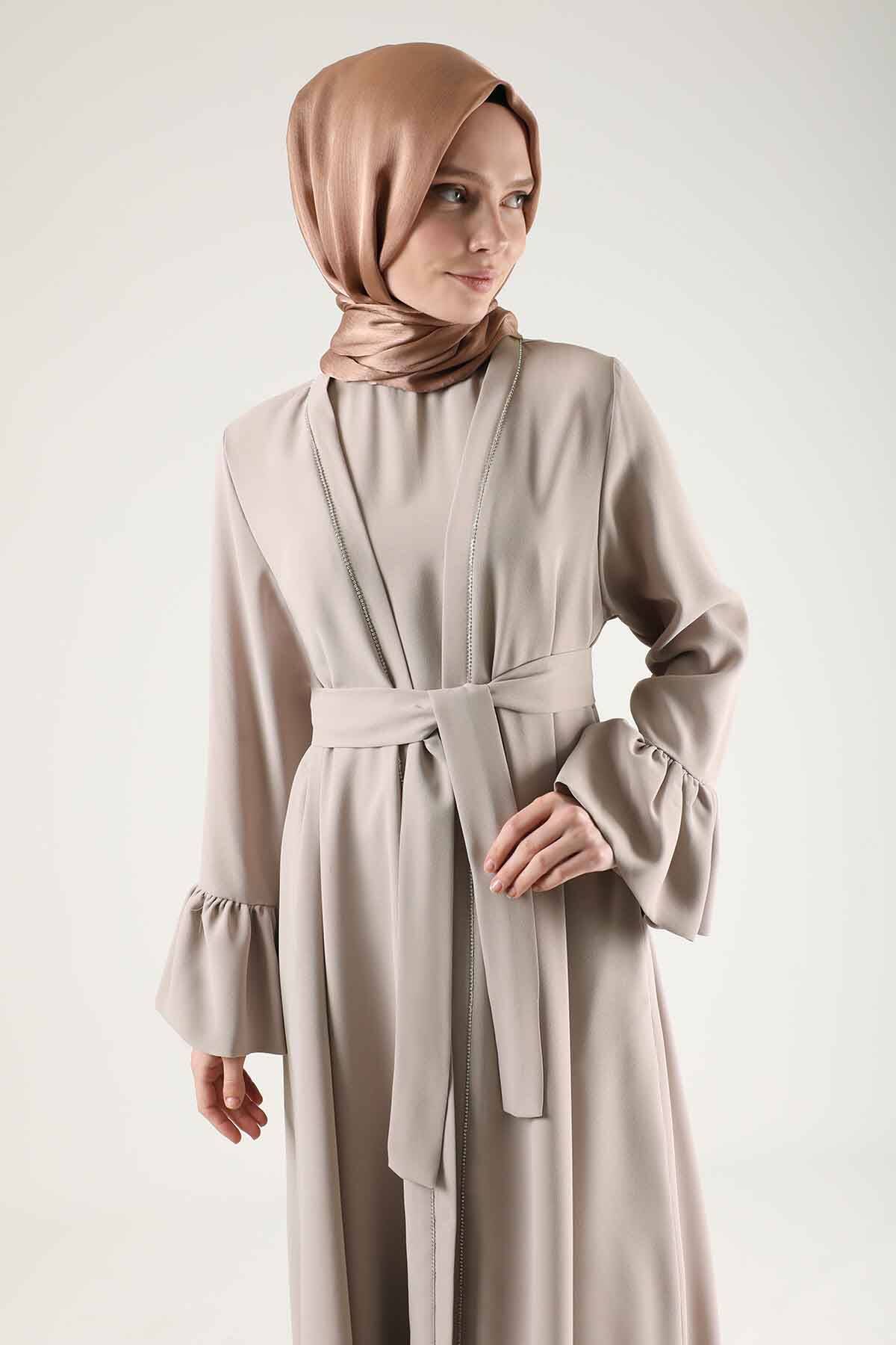 Cuff Flywheel Stone Abaya Suit Stone. The sleeve mouth is flywheel. The inner dress has a dominant collar, and there is a stone detail under the collar, The inner dress has zero sleeves. It is belted. It has a zipper on the back, it is a normal pattern. You can choose it on your special days.