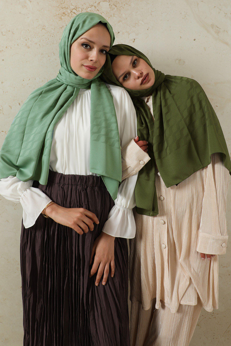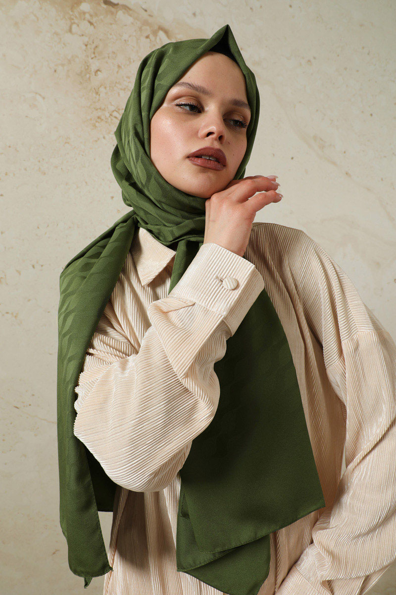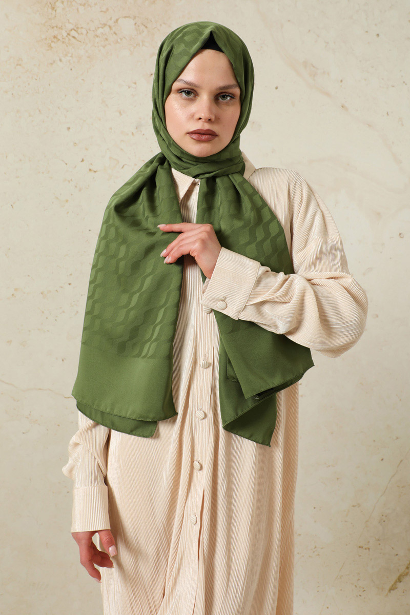 Dalga Desenli Şal Koyu Yeşil. Pratik oluşu ve kolay şekil alabilir. Tok duruşlu ve dökümlü yapısıyla çok tercih edilmektedir. Ağırlık yapmayan kumaş özelliği ile sık ve uzun süreli kullanıma uygundur. Dört mevsim kullanıma uygundur.