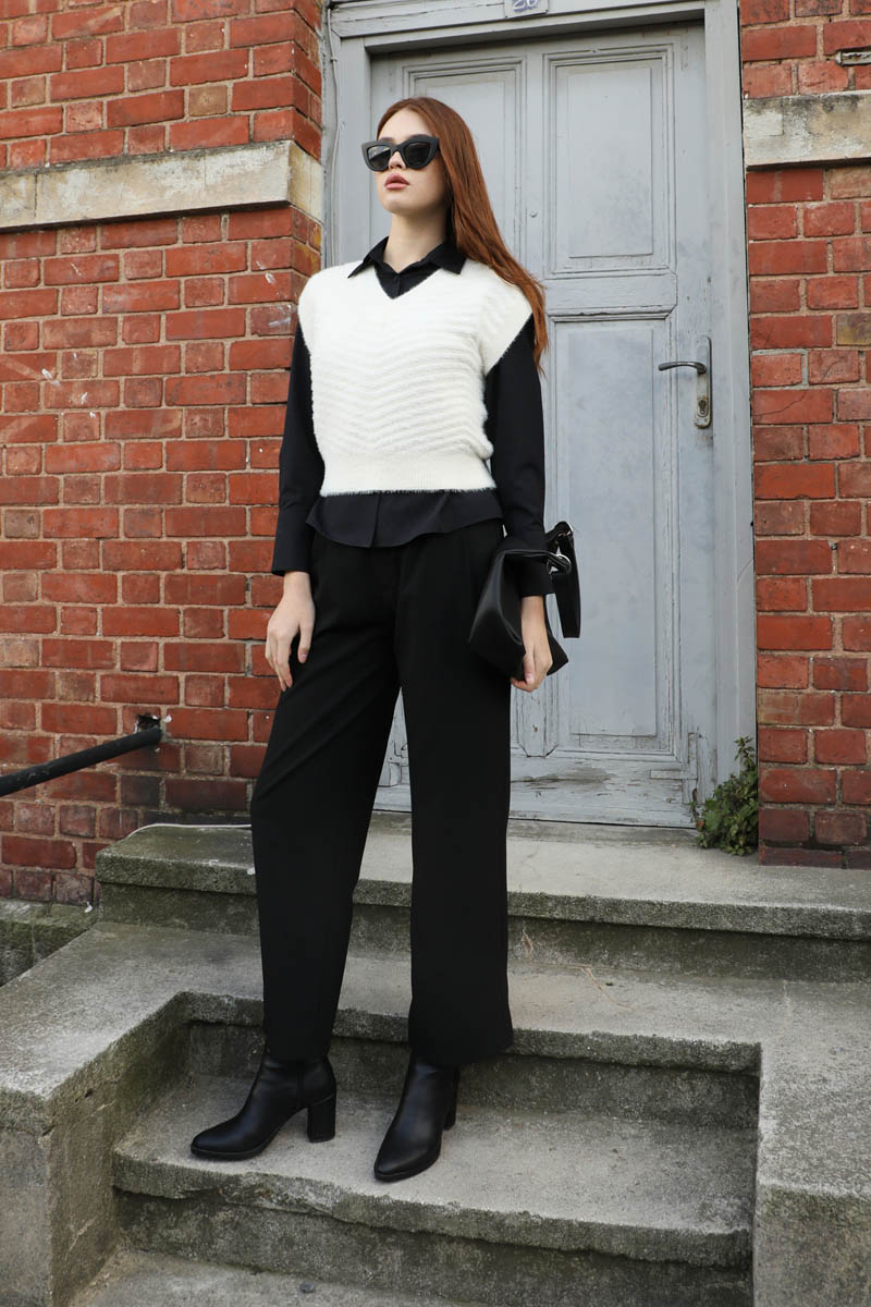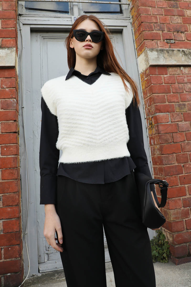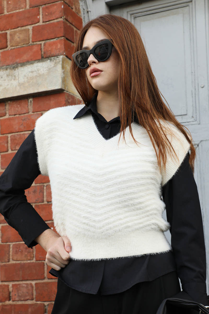 Dalga Desenli Süveter Ekru. V yakadır, akordiyon desenlidir, sısfır kolludur, etek ucu ribanalıdır. Günlük kullanım ve özel günlerinizde tercih edebilirsiniz.
