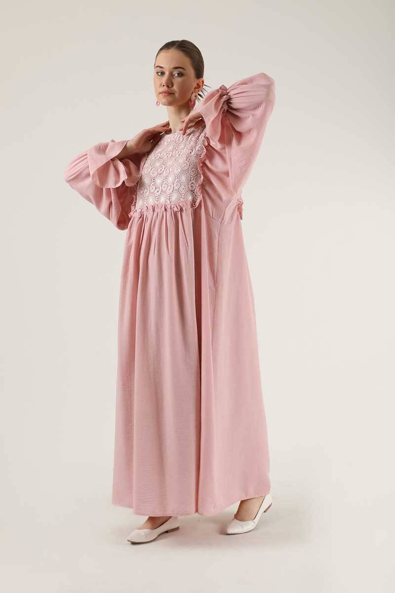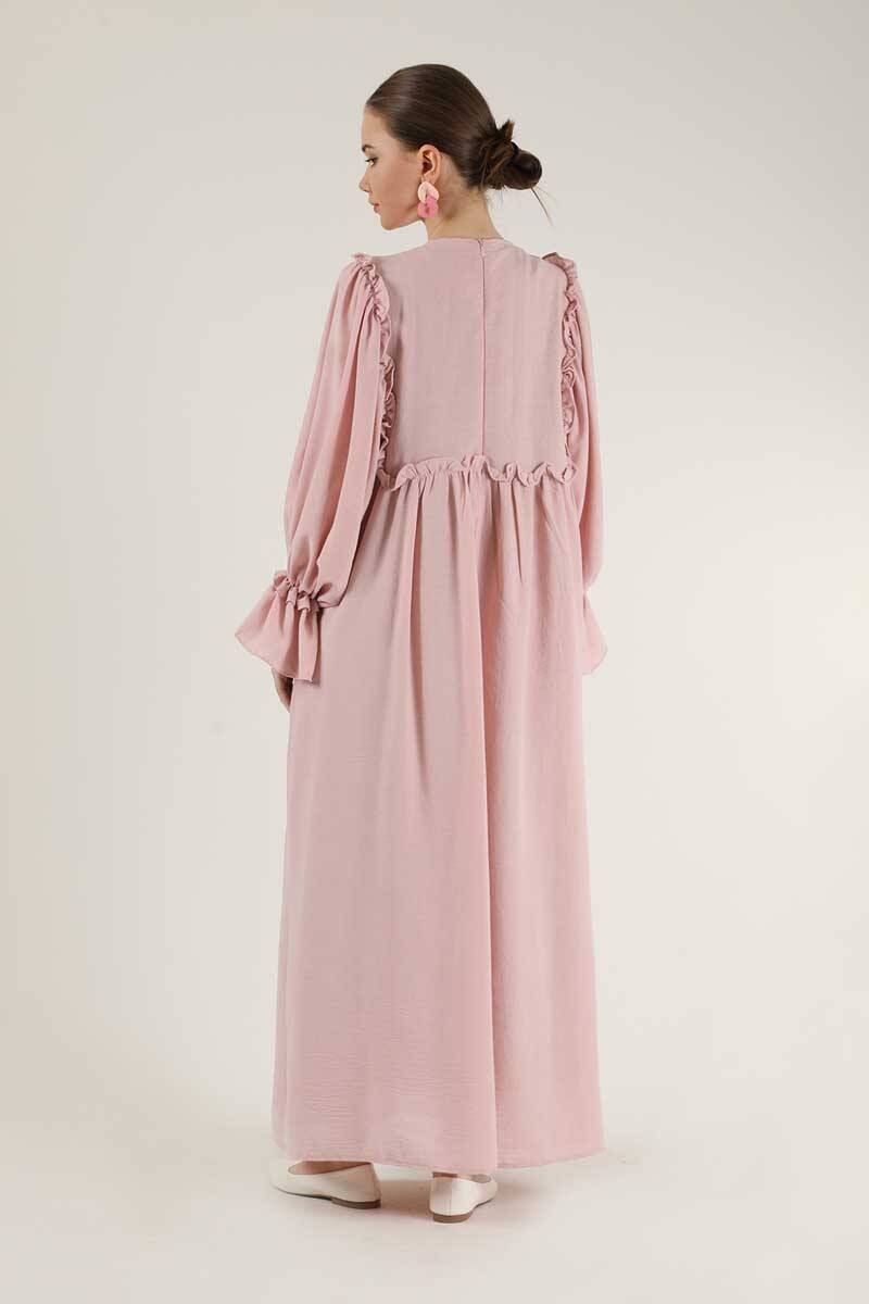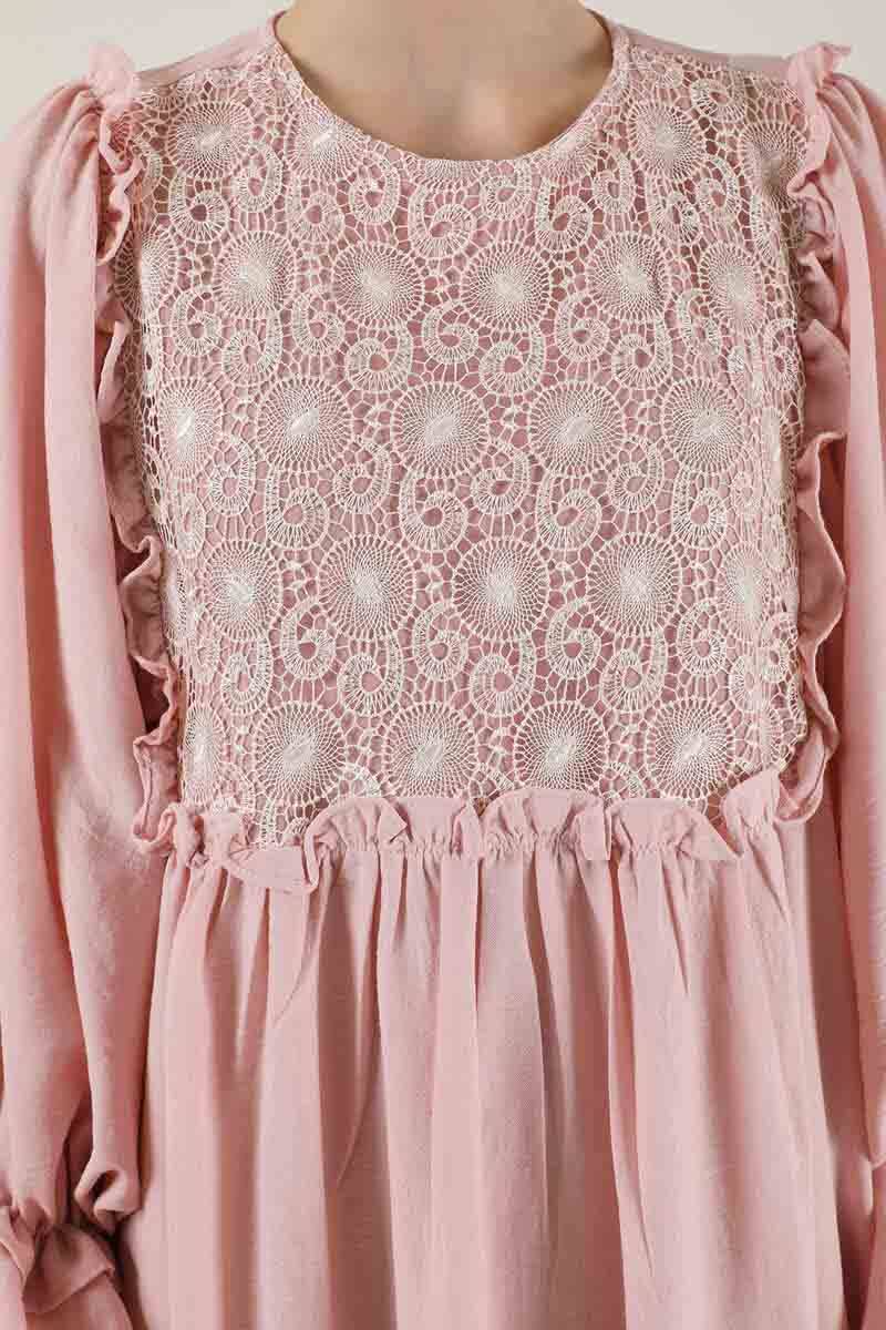 Dantel Detay Fırfırlı Elbise Pudra