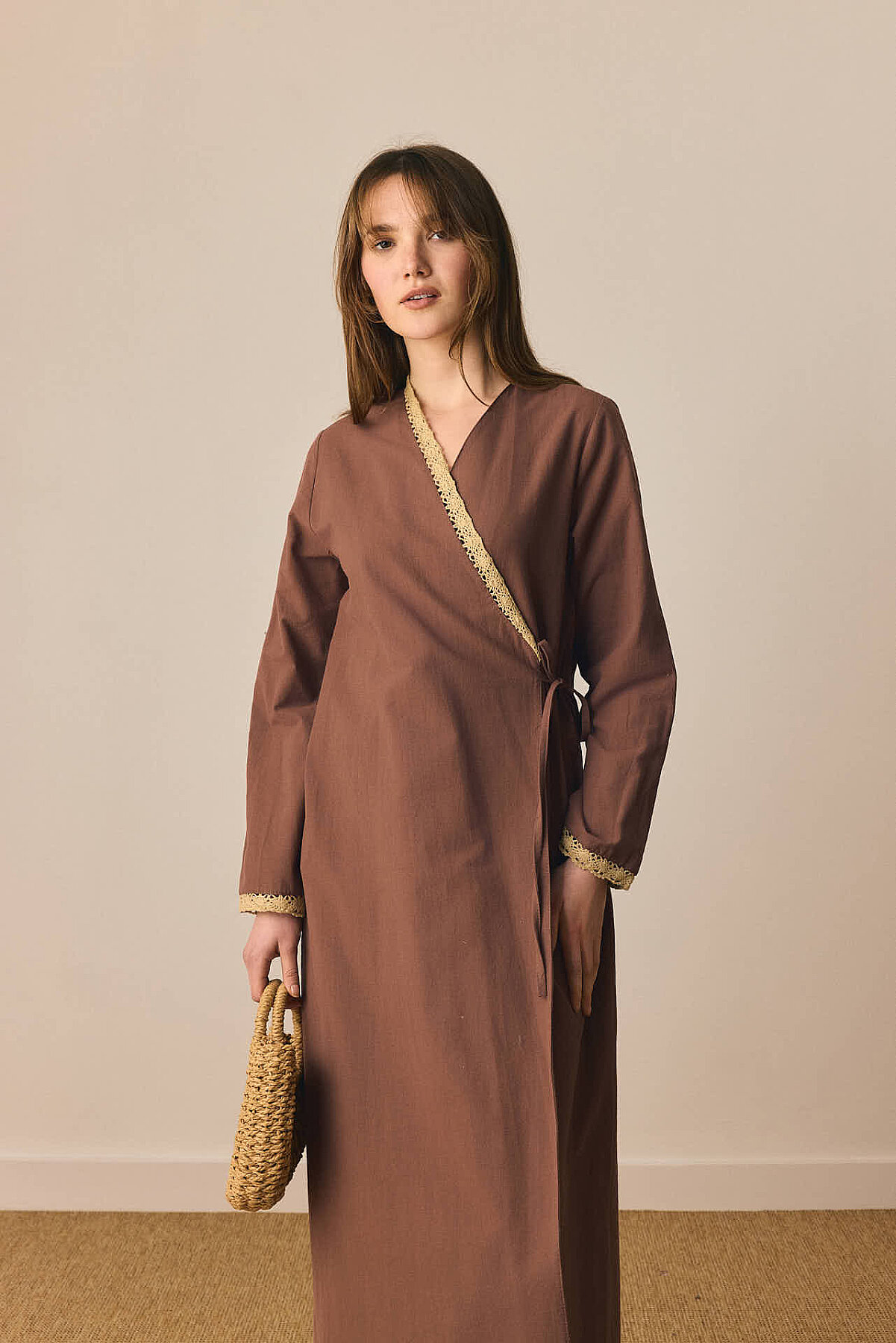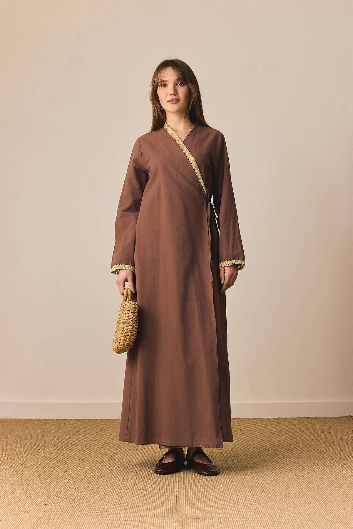 Dantelli Kruvaze Abaya Kahverengi, zarif dantel detaylarıyla klasik abaya formunu feminen ve rafine bir yorumla buluşturur. Kruvaze kapanışı dengeli ve akıcı bir duruş sunarken, ön beden ve kol uçlarında yer alan dantel şeritler tasarıma ince bir zarafet katar. Rahat kesimi gün boyu konfor sağlarken, bağlama detayı bele nazik bir form kazandırır. Günlük kullanımdan özel davetlere kadar farklı stillere kolayca uyum sağlayarak sade ama karakterli bir görünüm sunar.