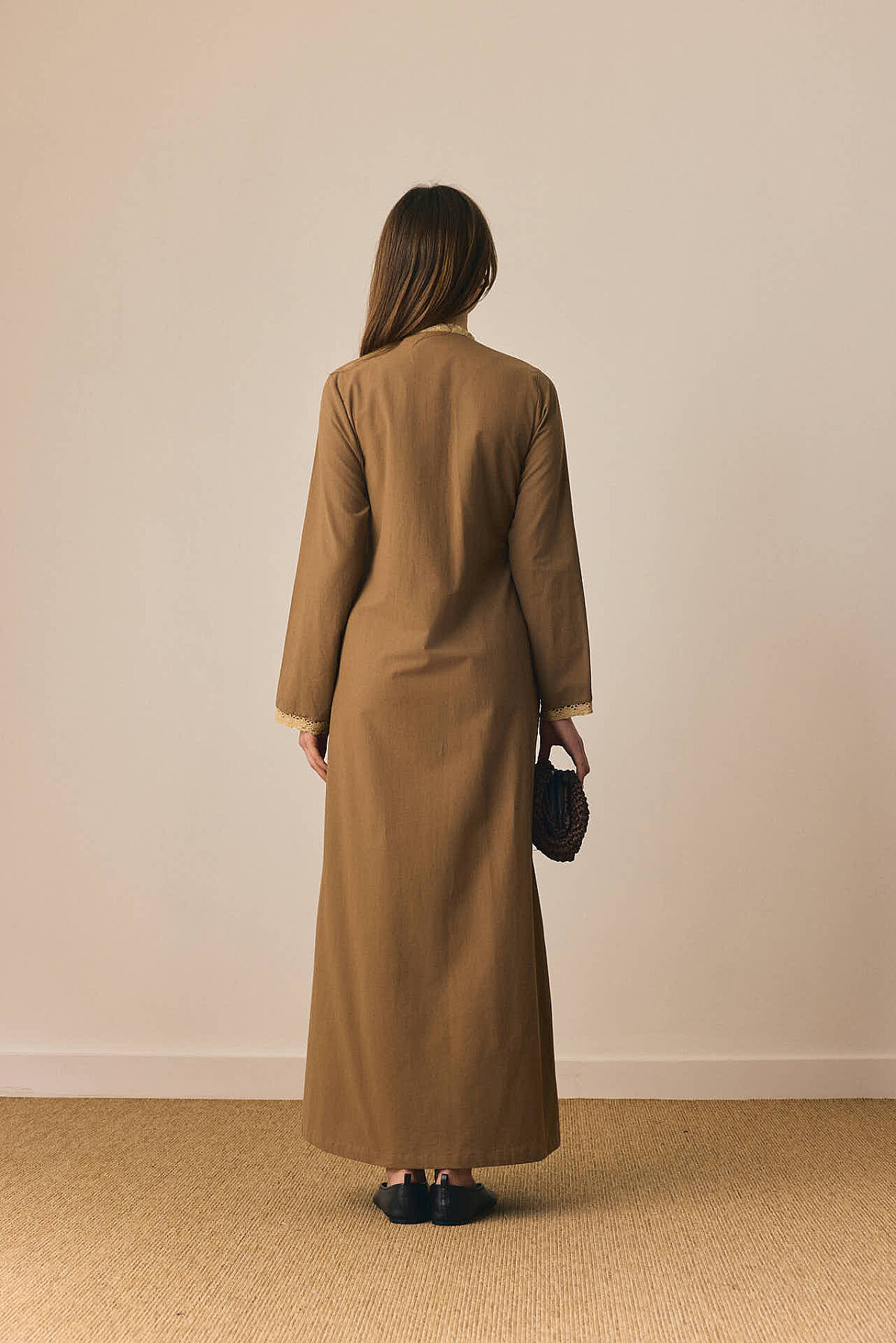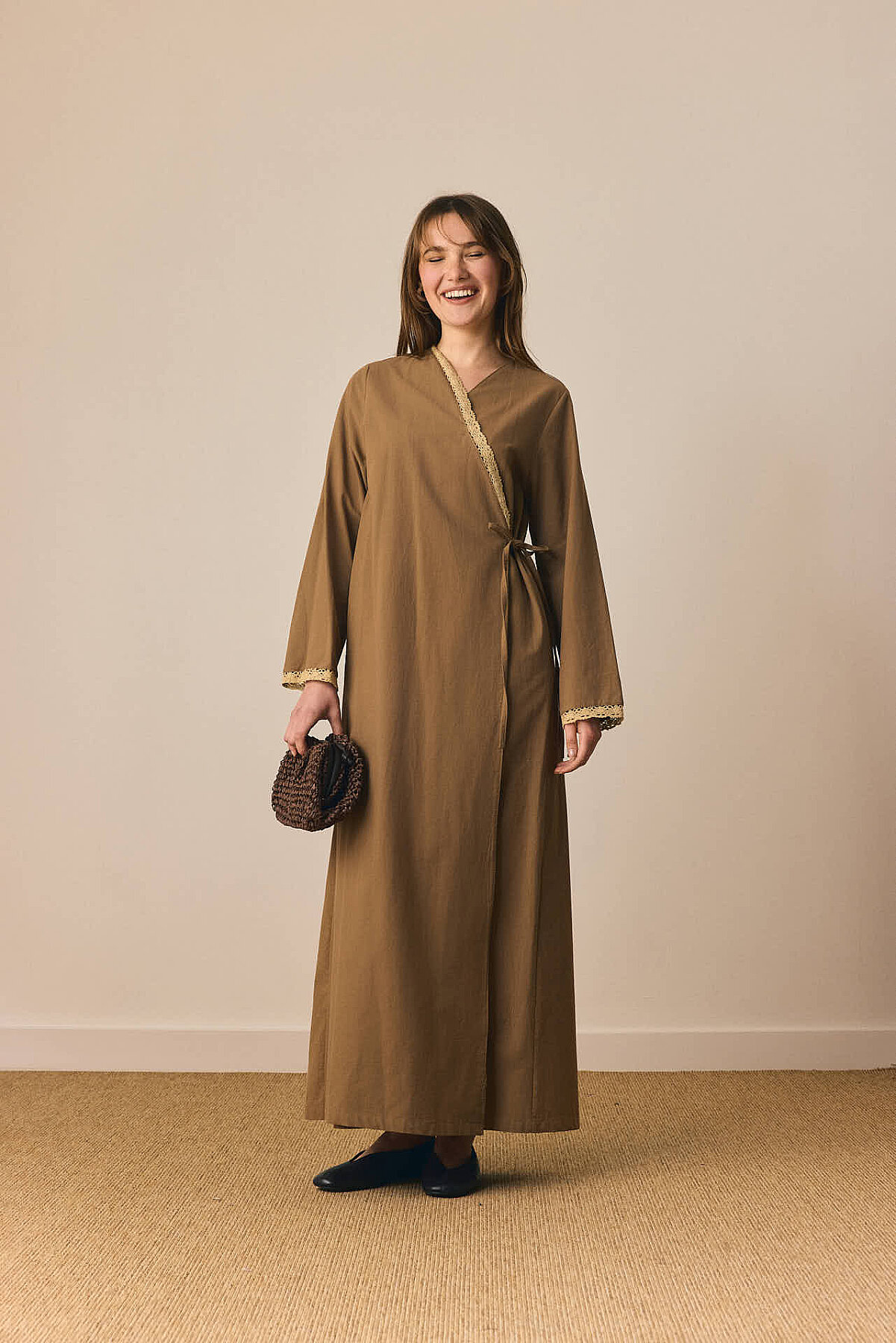 Dantelli Kruvaze Abaya Toprak, zarif dantel detaylarıyla klasik abaya formunu feminen ve rafine bir yorumla buluşturur. Kruvaze kapanışı dengeli ve akıcı bir duruş sunarken, ön beden ve kol uçlarında yer alan dantel şeritler tasarıma ince bir zarafet katar. Rahat kesimi gün boyu konfor sağlarken, bağlama detayı bele nazik bir form kazandırır. Günlük kullanımdan özel davetlere kadar farklı stillere kolayca uyum sağlayarak sade ama karakterli bir görünüm sunar.