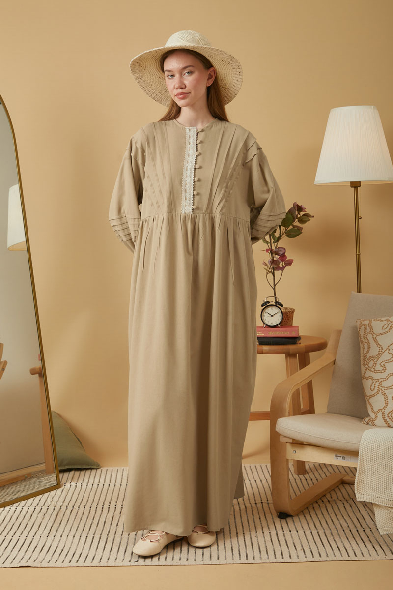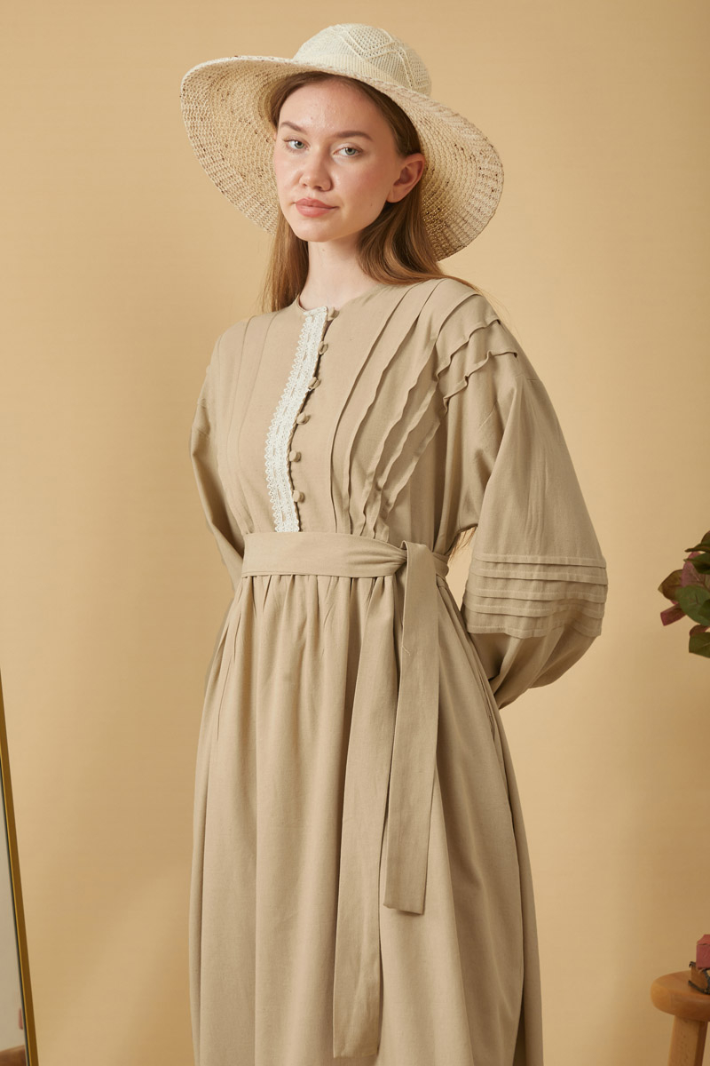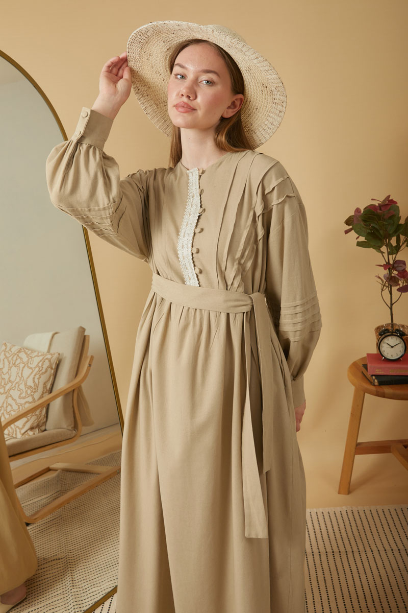 Dantelli Nervür Detaylı Elbise Bej,Vintage sevenler için ideal olan bu tasarım, doğal keten kumaştan üretilmiş zarif ve sade tarzı bir araya getiriyor. Önden dantel ve nervür detayları elbiseye nostaljik ve romantik bir hava katarken, dökümlü yapısı gün boyu konfor sağlıyor.