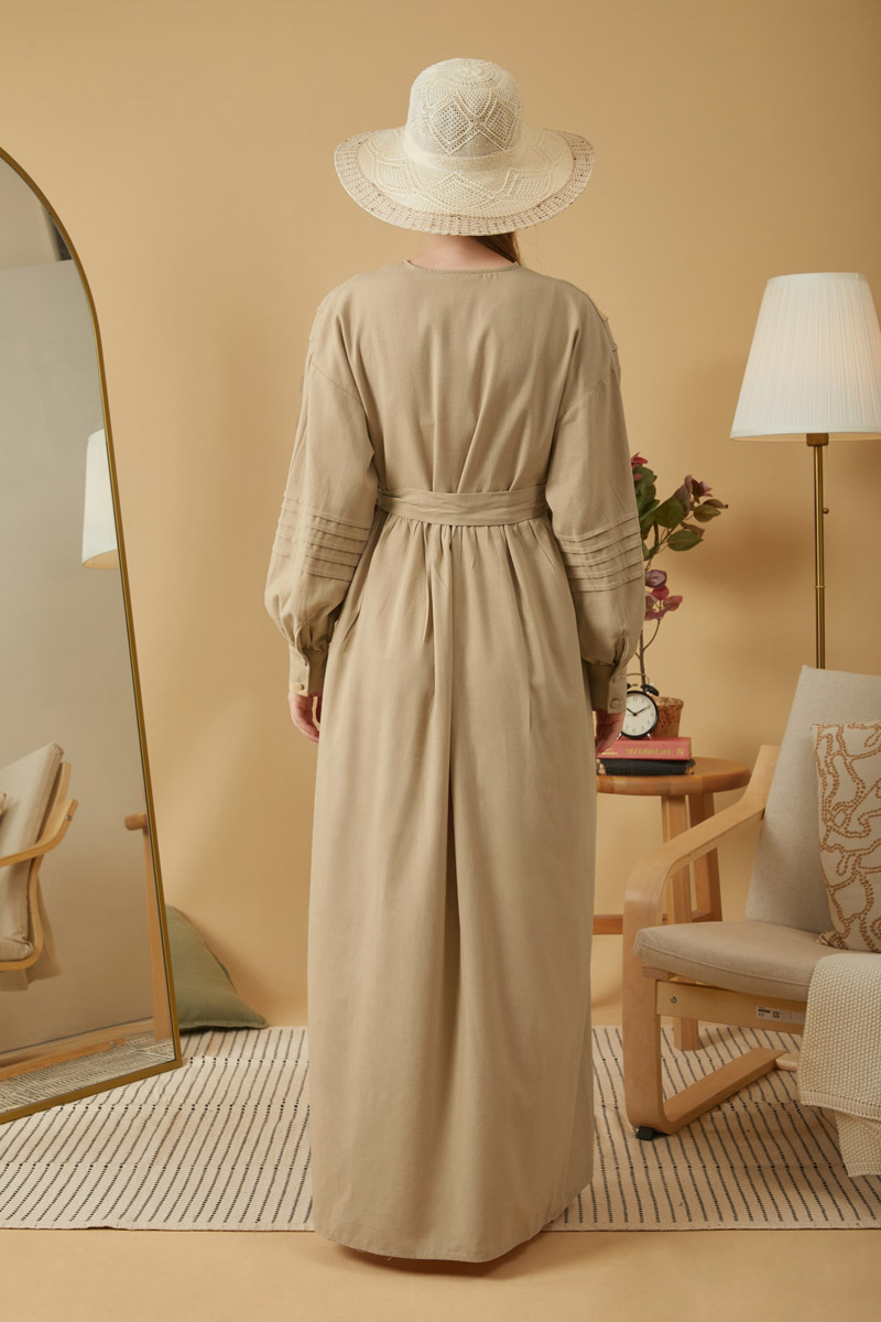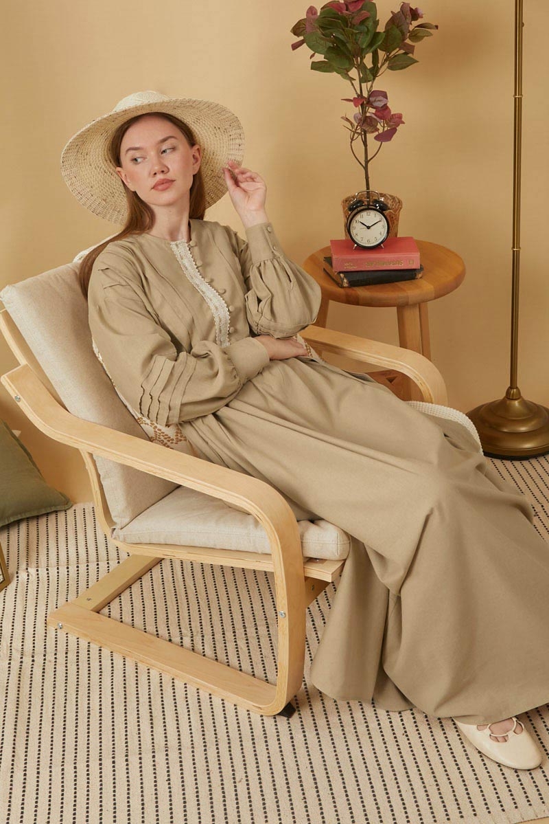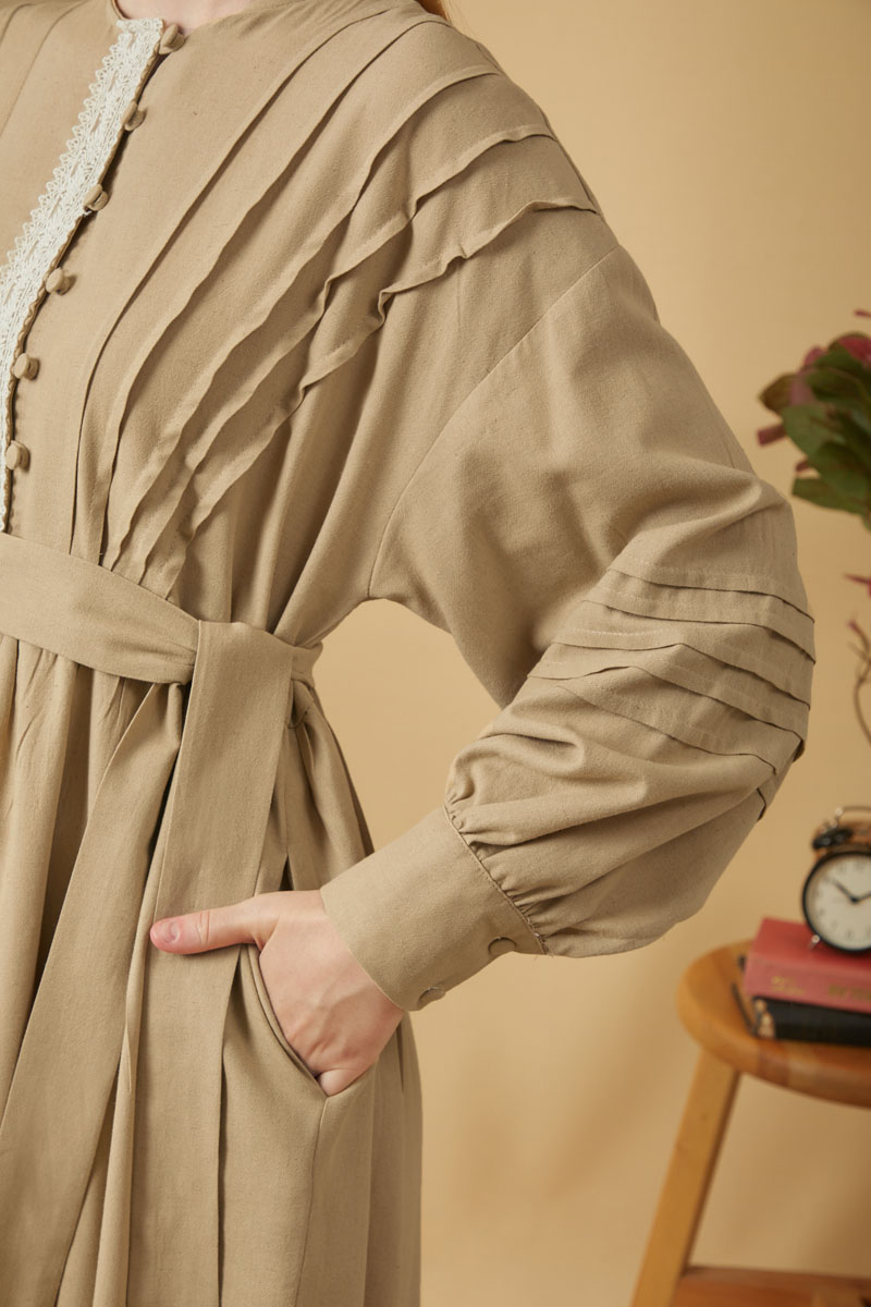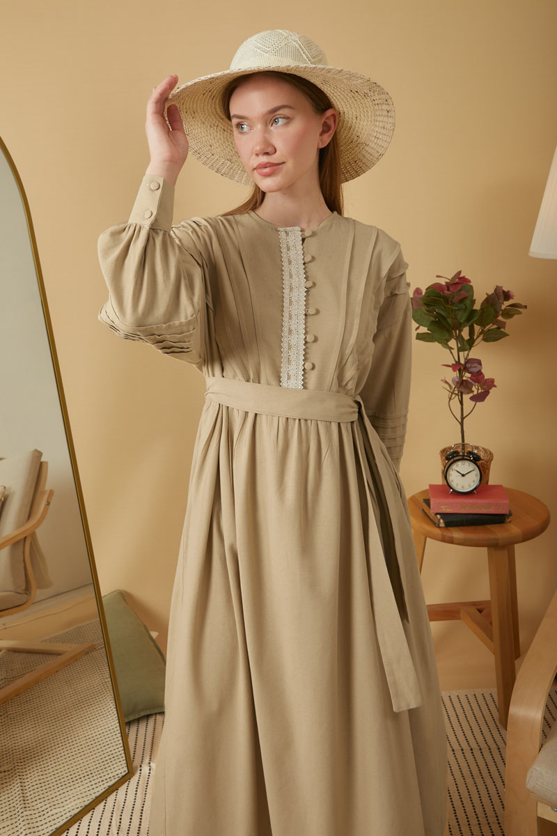 Dantelli Nervür Detaylı Elbise Bej,Vintage sevenler için ideal olan bu tasarım, doğal keten kumaştan üretilmiş zarif ve sade tarzı bir araya getiriyor. Önden dantel ve nervür detayları elbiseye nostaljik ve romantik bir hava katarken, dökümlü yapısı gün boyu konfor sağlıyor.