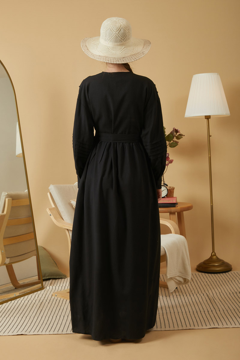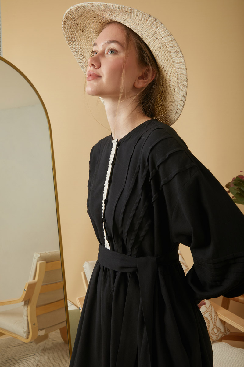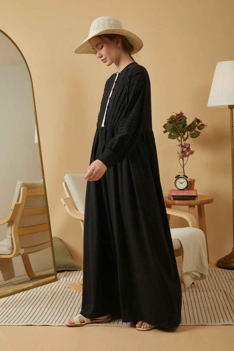 Dantelli Nervür Detaylı Elbise Siyah, Vintage sevenler için ideal olan bu tasarım, doğal keten kumaştan üretilmiş zarif ve sade tarzı bir araya getiriyor. Önden dantel ve nervür detayları elbiseye nostaljik ve romantik bir hava katarken, dökümlü yapısı gün boyu konfor sağlıyor.