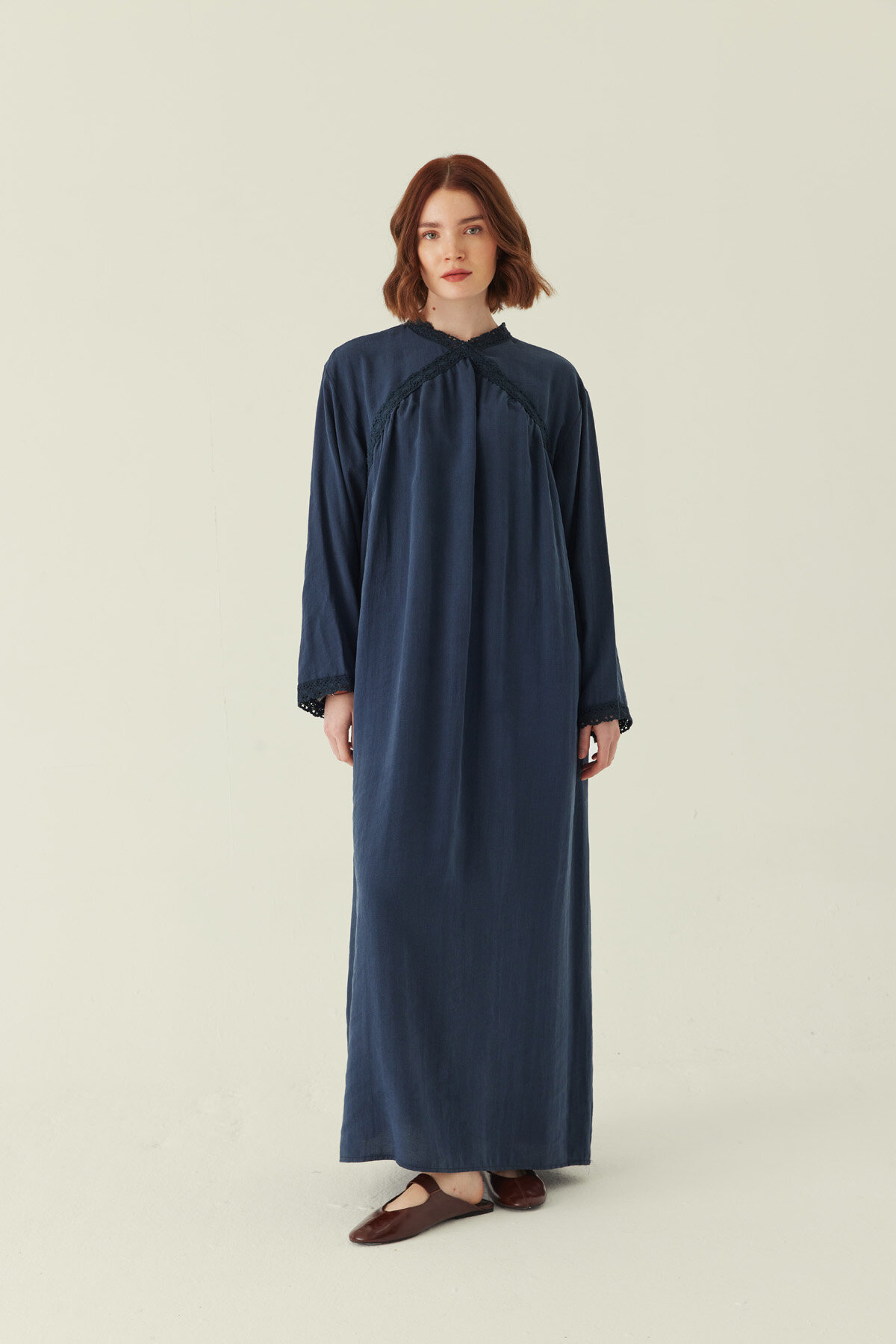 Zarif dantel dokunuşları ve yumuşak tensel yüzeyiyle öne çıkan Dantelli Tensel Elbise, sade şıklığı güçlü bir siluetle buluşturur. Akıcı yapısı sayesinde gün boyu konfor sunarken, geniş kalıbı rahat bir kullanım sağlar. Kuşak detayı bele form kazandırarak dengeli bir görünüm oluşturur. Günlük kombinlerden özel gün stiline kadar farklı kullanım alanlarına uyum sağlayan zamansız bir parçadır.