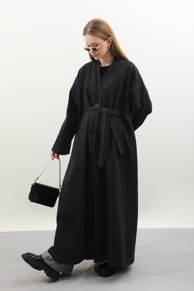 Denim Abaya Kap Siyah.Kruvaze yakadır, ön bedende fileto ilik detaylıdır, düşük kollu olup kol ucu apolet detaylıdır, yandan ceplidir, önden düğmelidir, astarsızdır, kuşaklıdır. Günlük kullanım ve özel günlerinizde tercih edebilirsiniz.