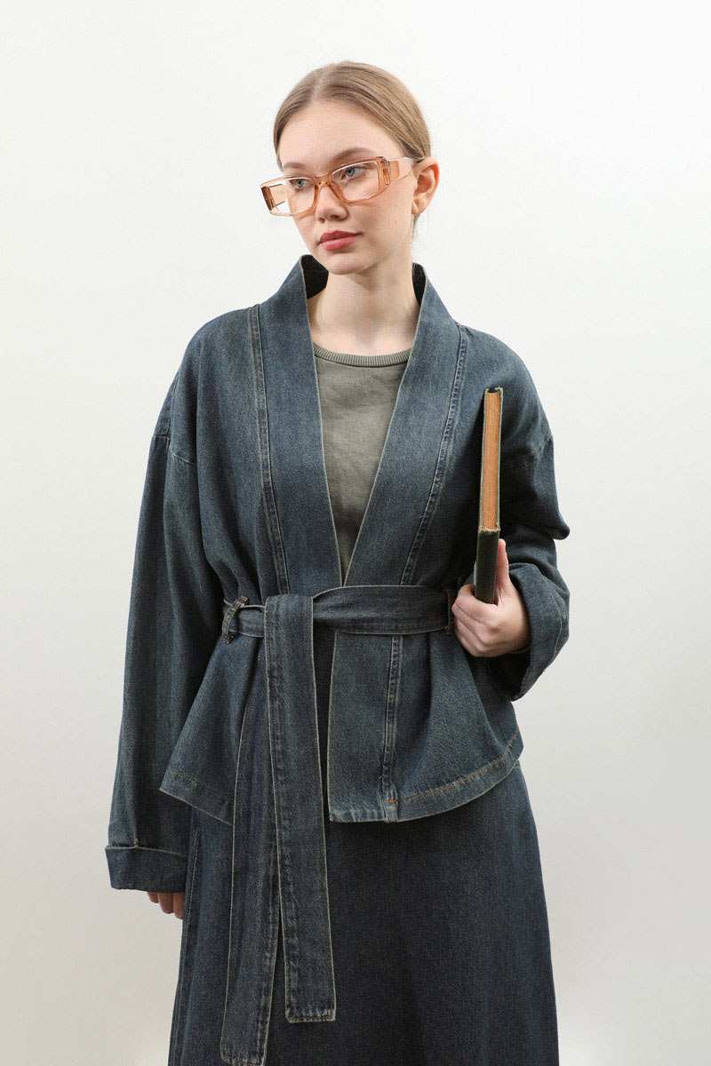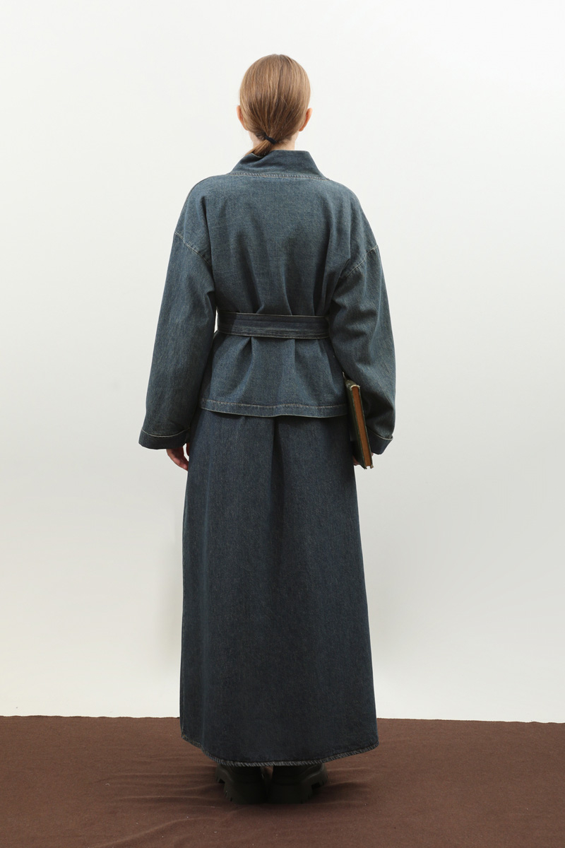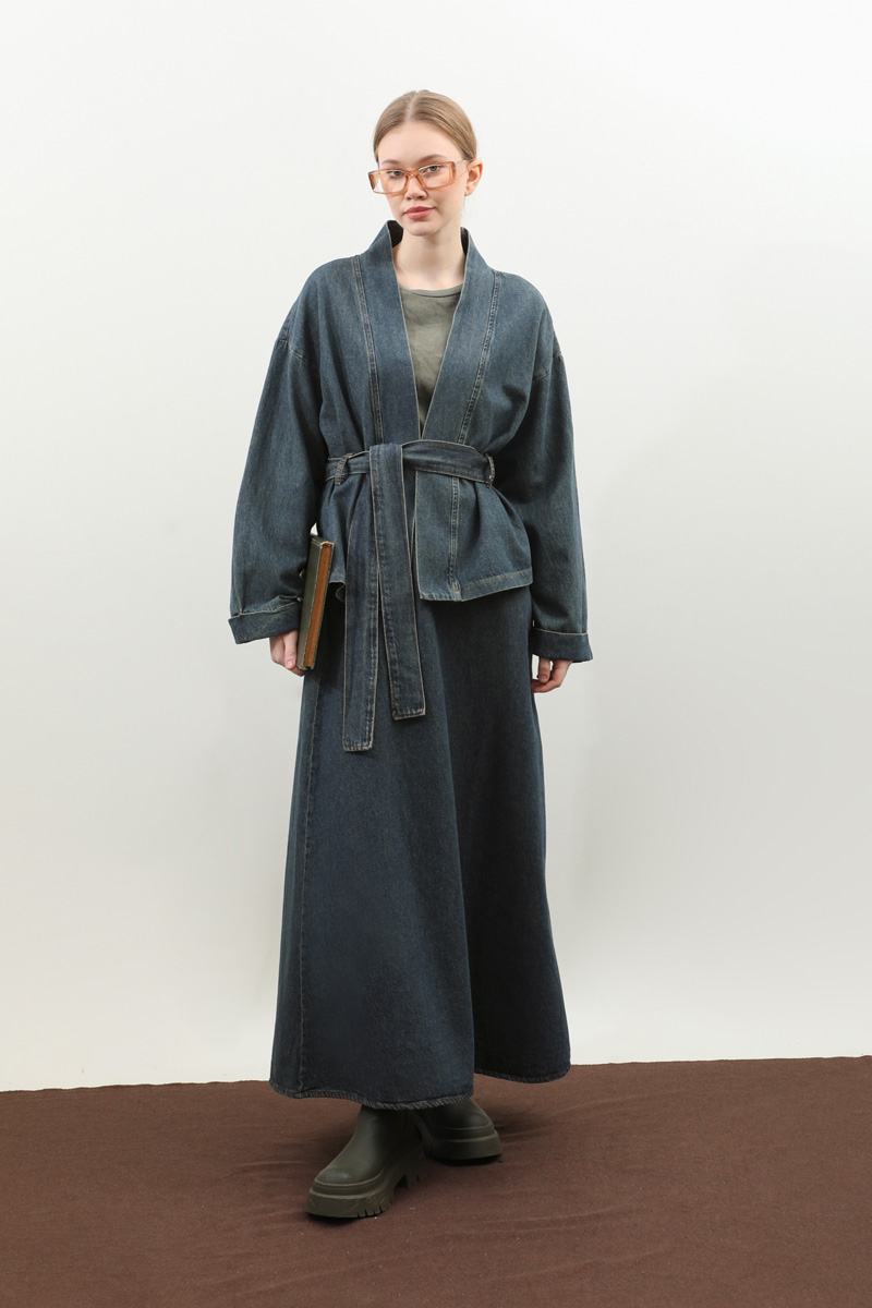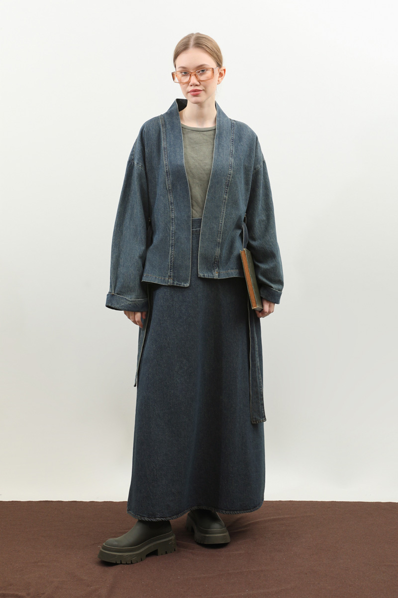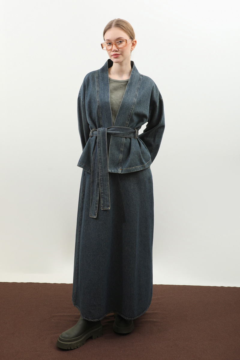 Denim Kimono Etek Takım Mavi. Kruvaze yakadır, düşük omuzludur, kemerlidir, belden kermerlidir, double koldur, etek arka belden lastiklidir, ceplidir, astarlıdır, Günlük kullanım ve özel günlerinizde tercih edebilirsiniz.