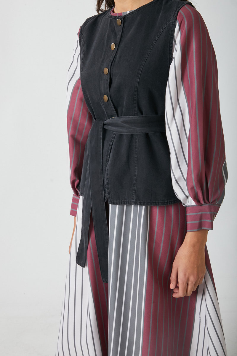 This stylish set features a denim vest with a crew neckline, panel stitch details, front button closure, and a matching belt.