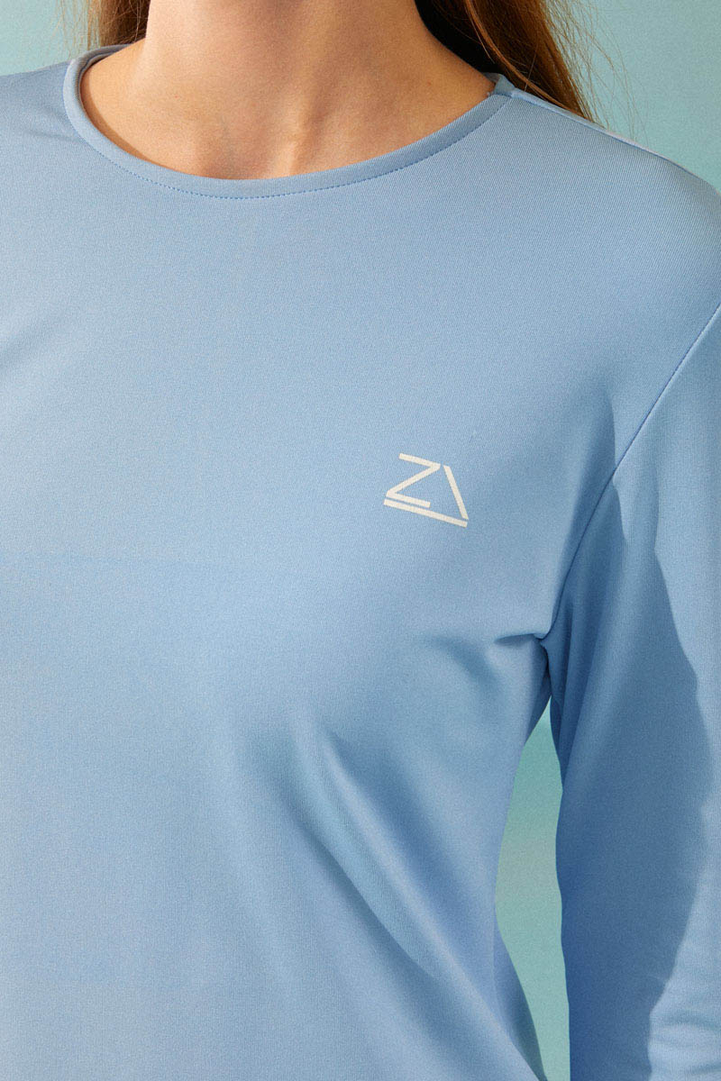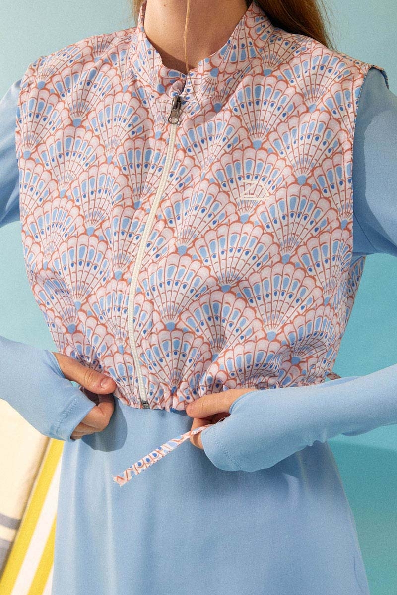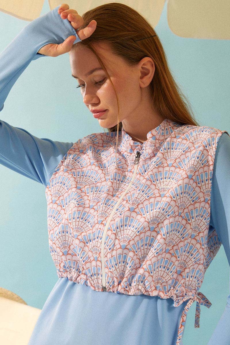 Eteği Katlı Mayo Takımı Bebe Mavisi, Uzun kollu, bisiklet yaka ve basic kesimli mayonun üzerine giyilen, fermuarlı ve alt kısmı büzgülü ayarlanabilir desenli yelek detayı ile hareketli ve şık bir görünüm sunar. Bu şık ve bütünlüklü takım, hem plajda hem de havuz başında mütevazı ve zarif bir görünüm arayan kadınlar için ideal bir seçimdir.