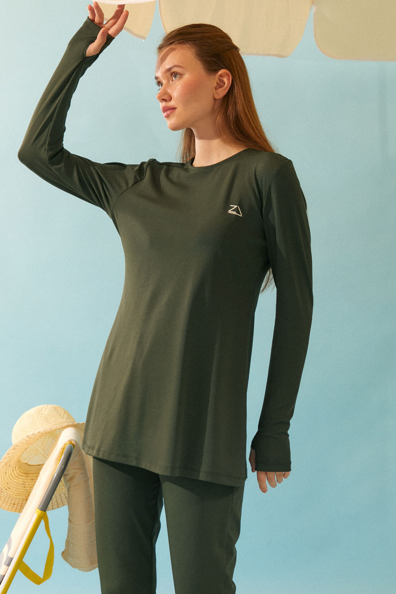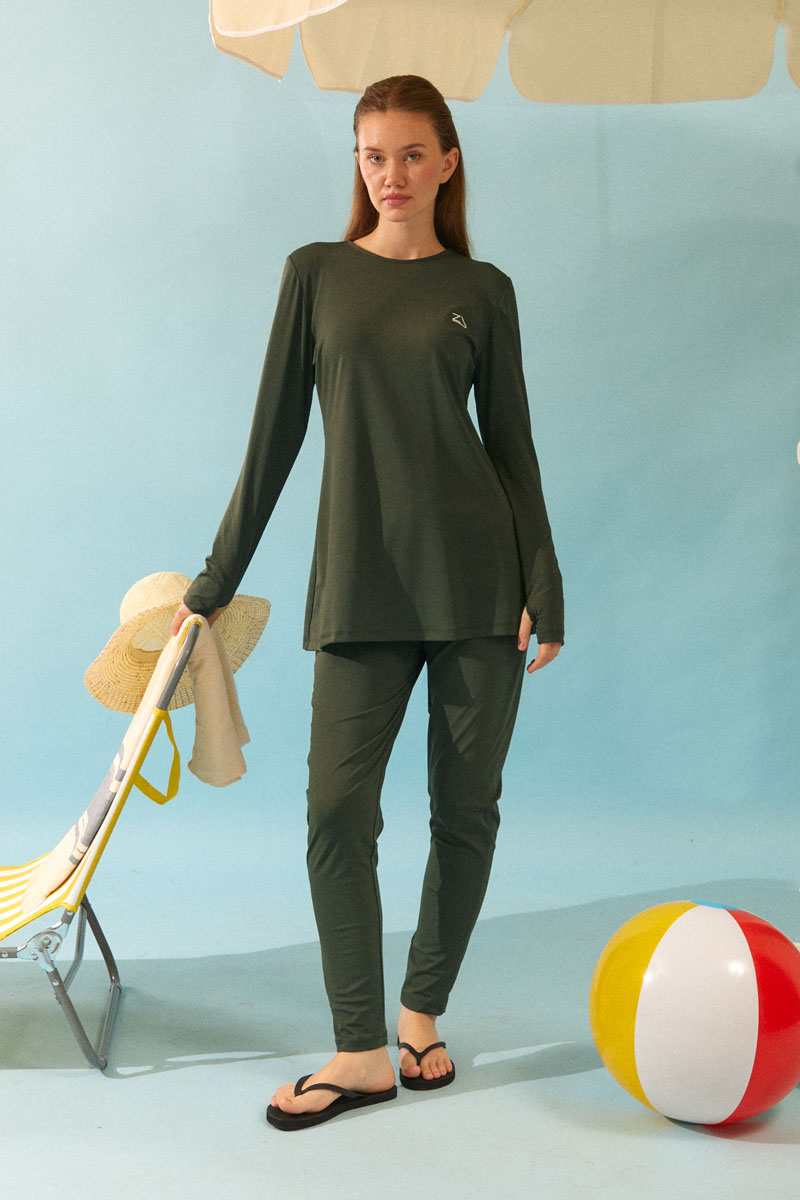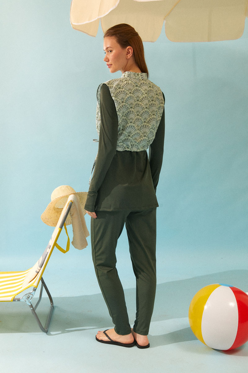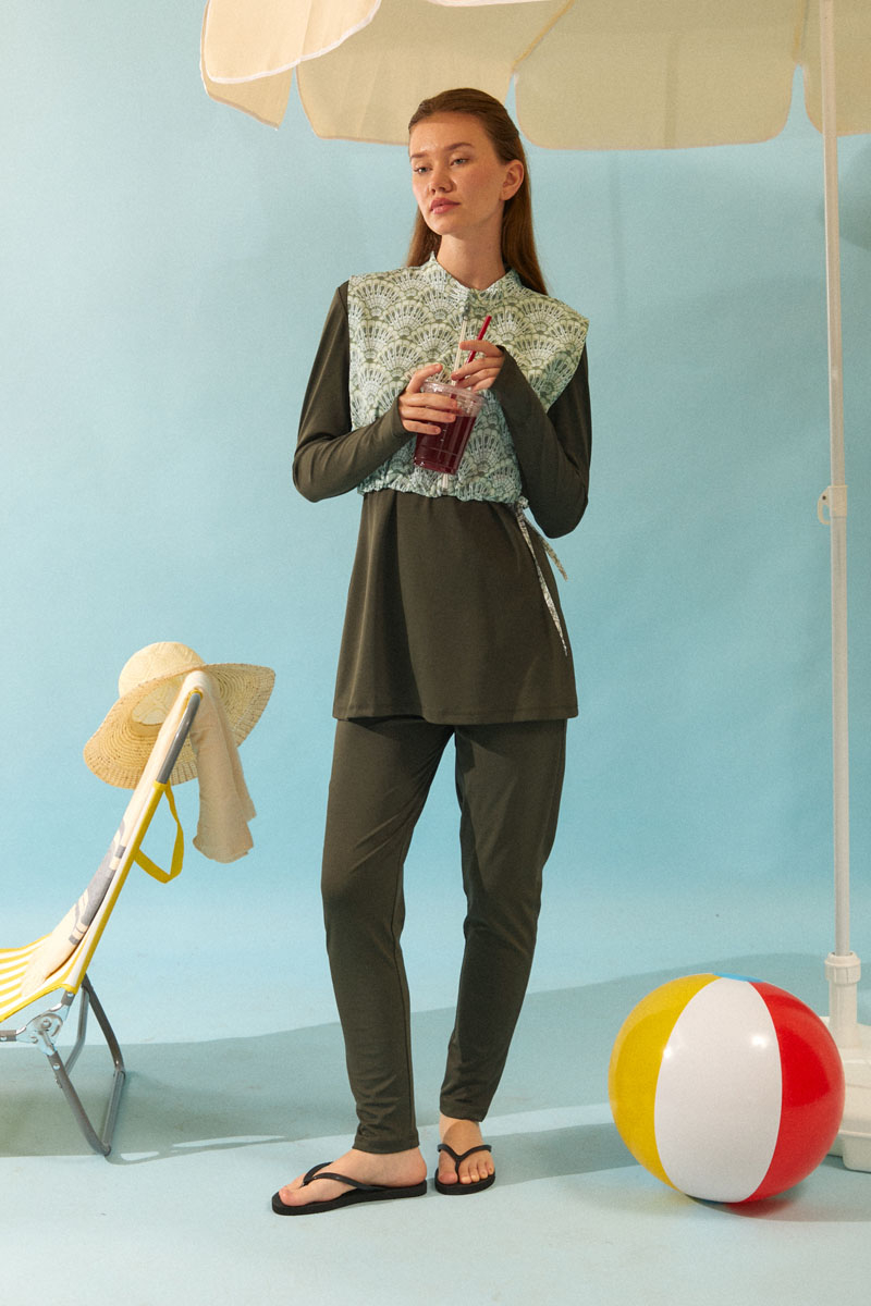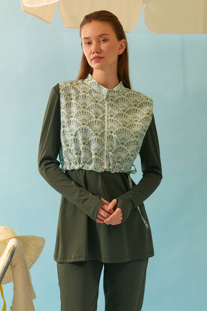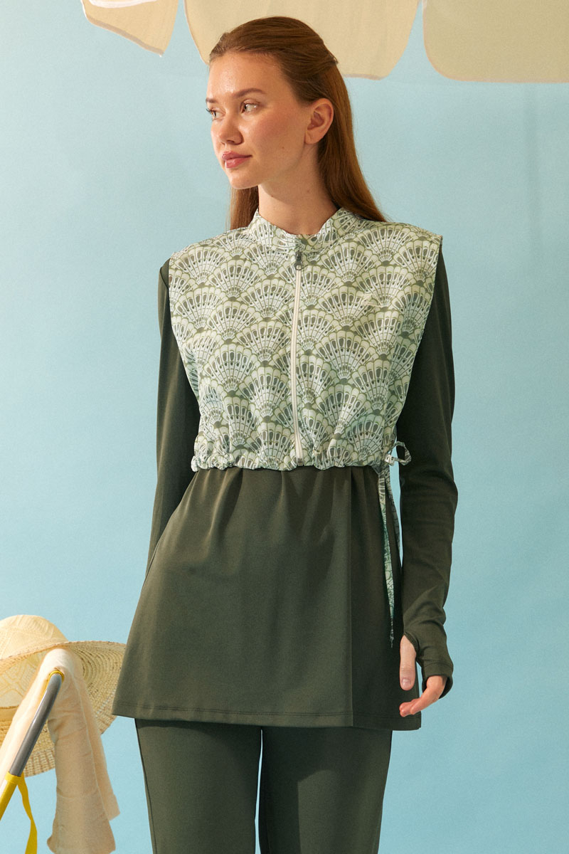 Deniz Kabuğu Desenli Tesettür Mayo Haki