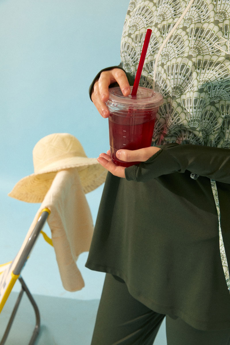 Deniz Kabuğu Desenli Tesettür Mayo Haki, Uzun kollu, bisiklet yaka ve basic kesimli mayonun üzerine giyilen, fermuarlı ve alt kısmı büzgülü ayarlanabilir desenli yelek detayı ile hareketli ve şık bir görünüm sunar. Bu şık ve bütünlüklü takım, hem plajda hem de havuz başında mütevazı ve zarif bir görünüm arayan kadınlar için ideal bir seçimdir.
