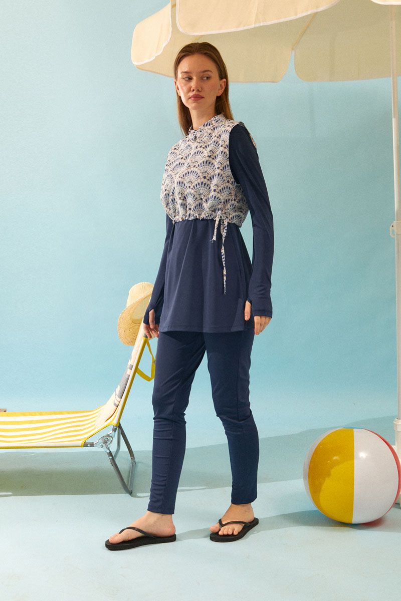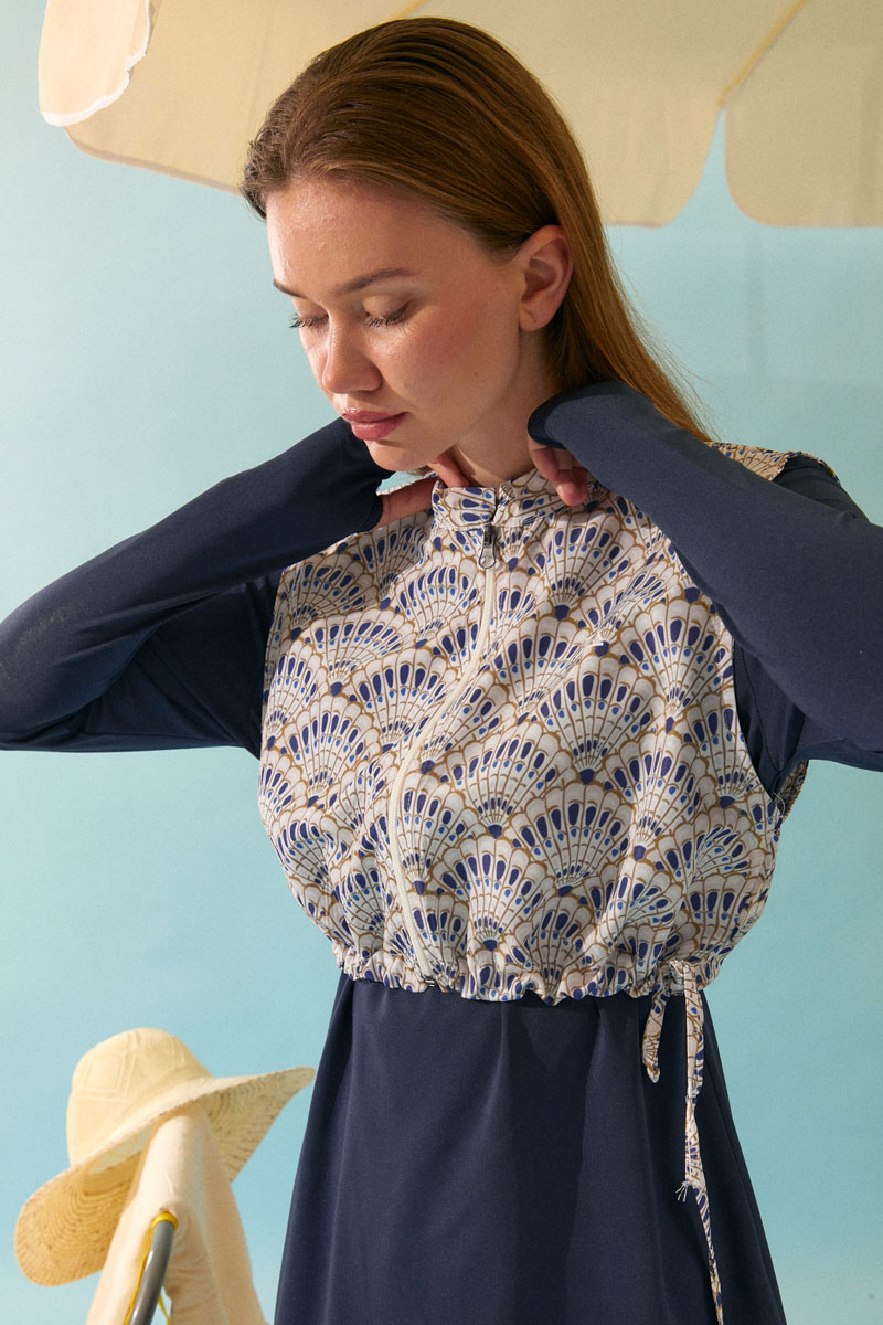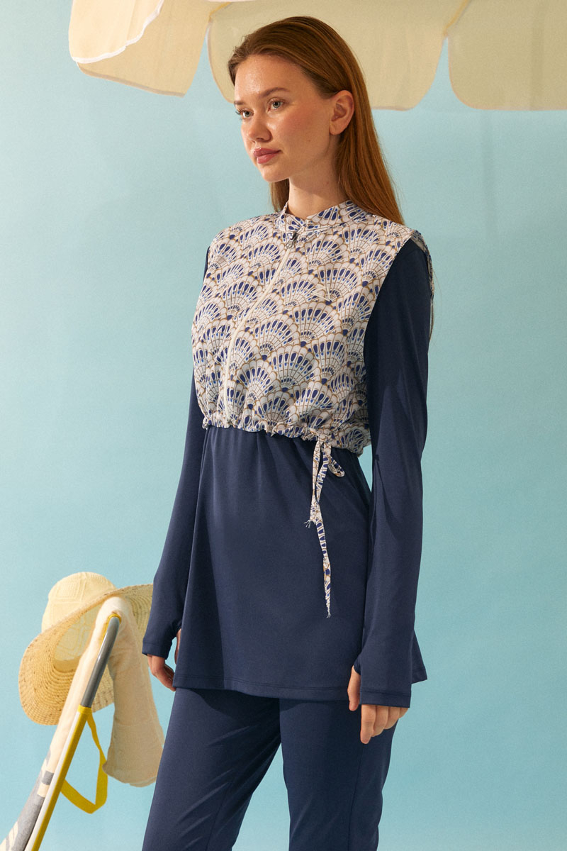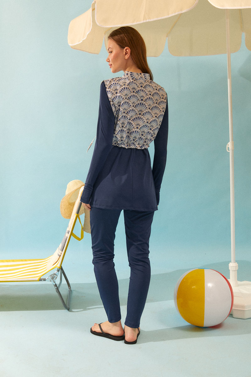 Deniz Kabuğu Desenli Tesettür Mayo Lacivert
