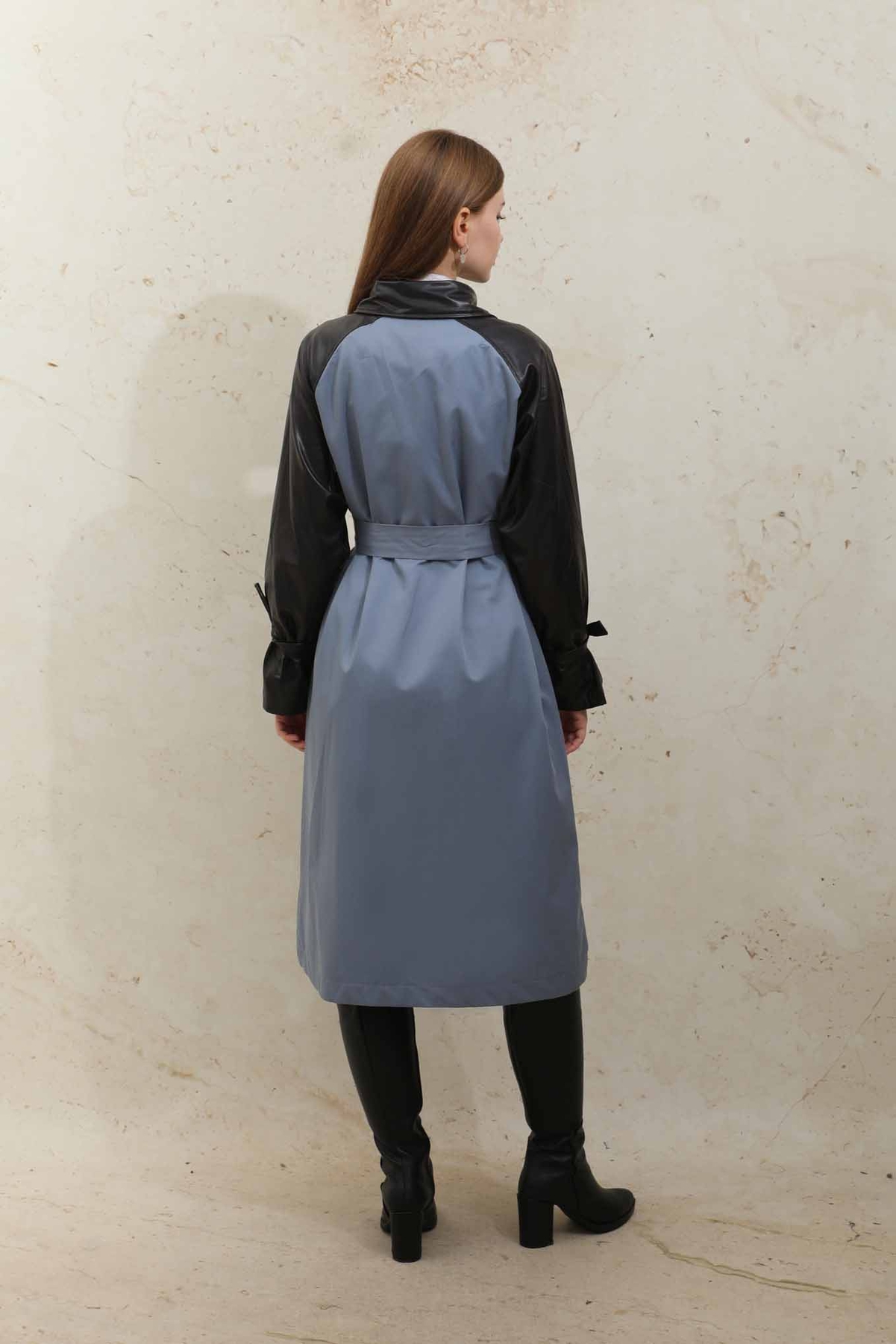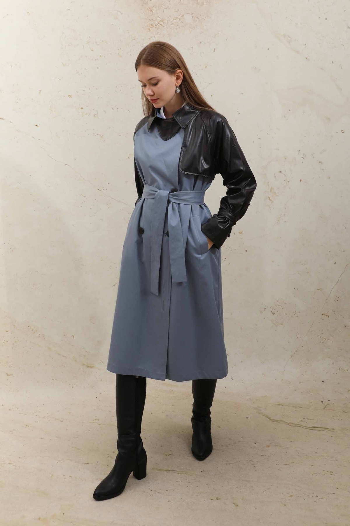 Leather Detailed Trench Coat Blue. Leather details are available. There is a mobile belt from the waist. It is lined. It has two side pockets. It is a double-breasted closure.