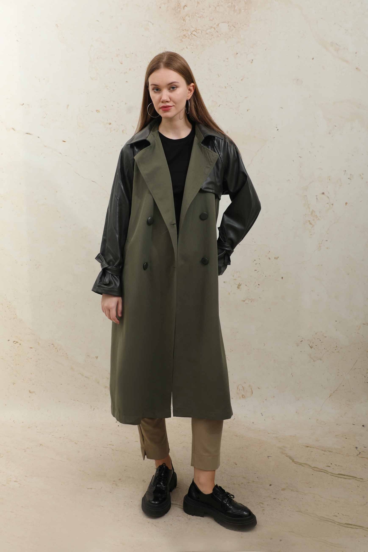 Deri Detaylı Trençkot Haki