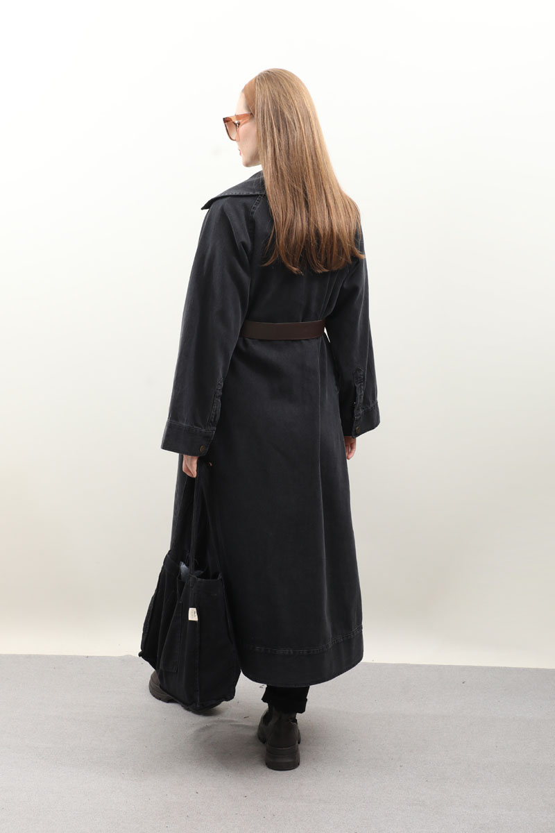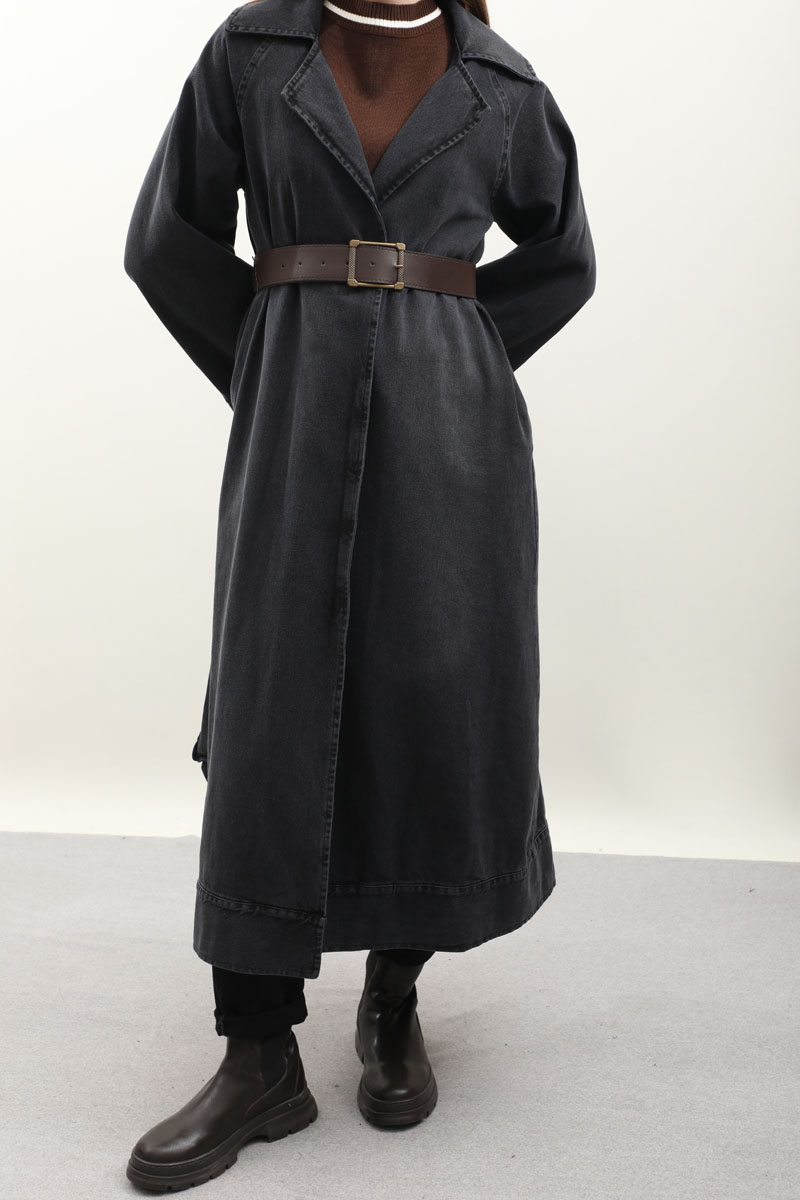 Deri Kemerli Denim Trençkot Siyah