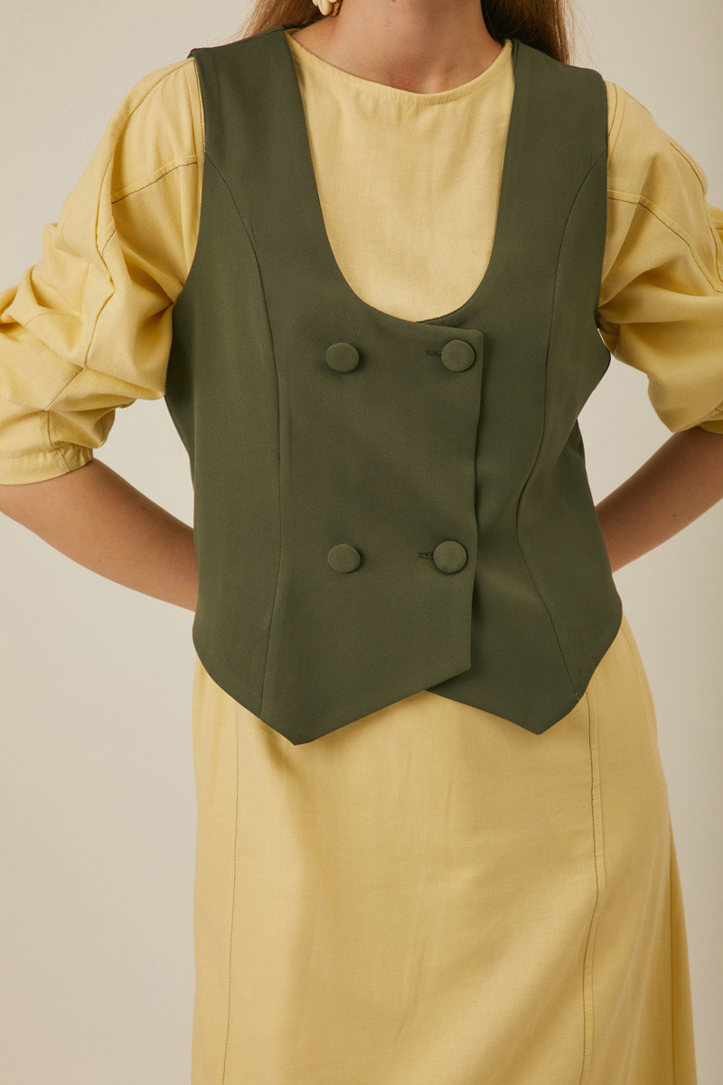 Derin Yaka Yelek Haki. Kruvaze kapamadır. Astarsızdır. Derin U yakalıdır. Kup dikiş detayı vardır. Elbise ve etek kombinlerinizde tercih edebilirsiniz. Mevsimlik üründür.