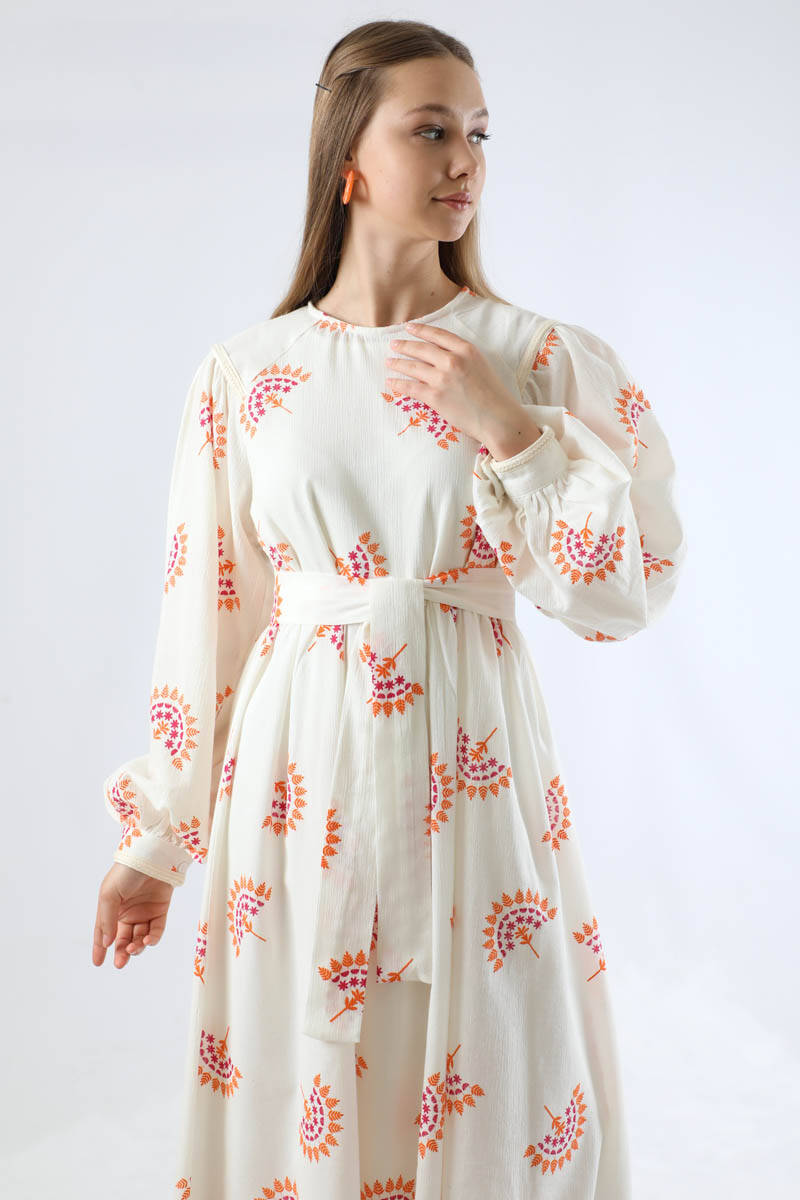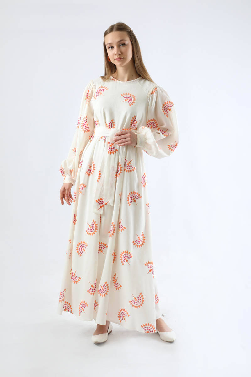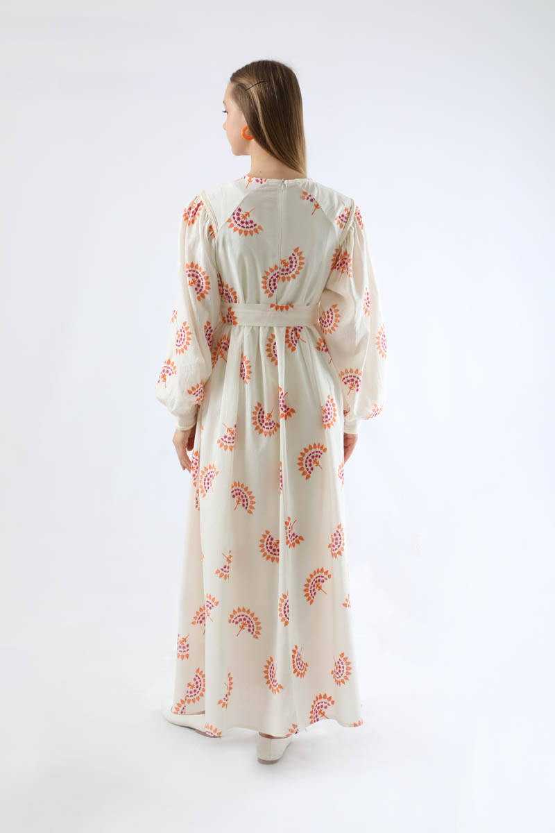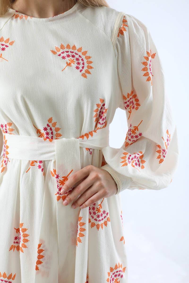 Deseni Nakışlı Elbise Oranj. Balon kolludur. Kolu manşetlidir. Reglan kolludur. Belden kesik detaylıdır. Arkadan fermuarlıdır. Kuşaklıdır. Günlük kullanım ve özel günlerinizde tercih edebilirsiniz.
