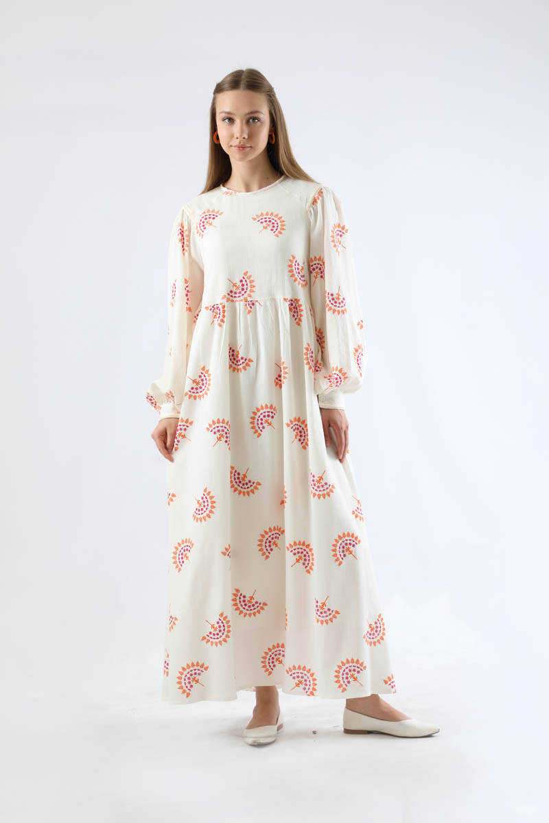 Deseni Nakışlı Elbise Oranj