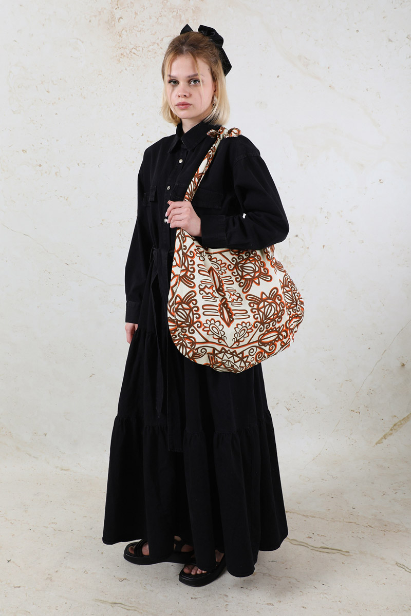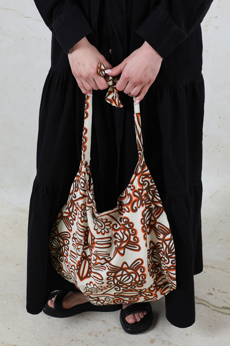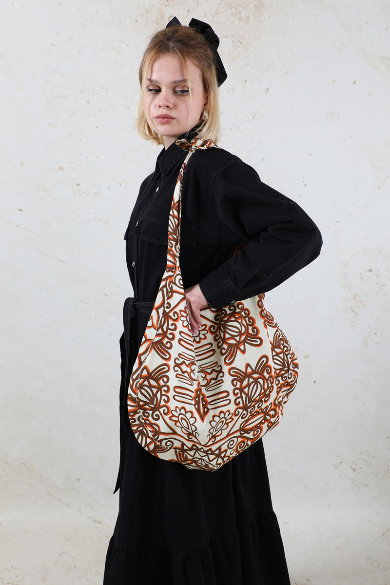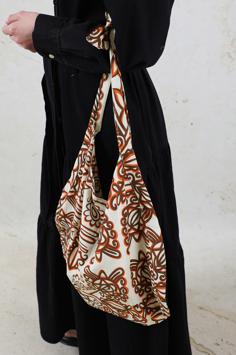Desenli Bağlamalı Çanta Turuncu. Çantanın iki ucu biribirine bağlamalıdır,kapaması çıtçıtlıdır,iç kısmında ekstra olarak küçük cebi mevcuttur.