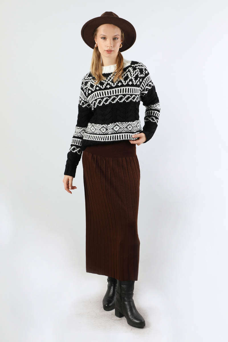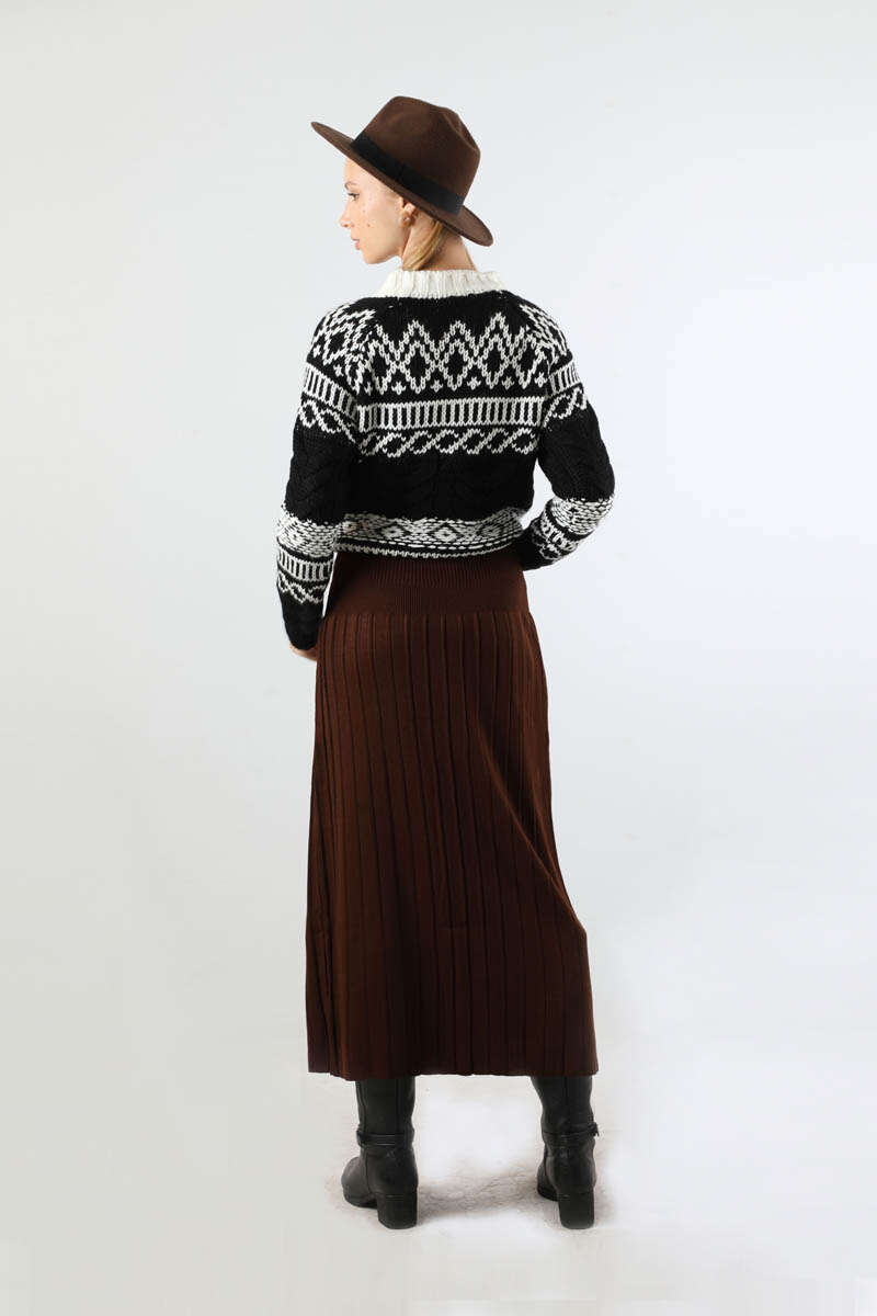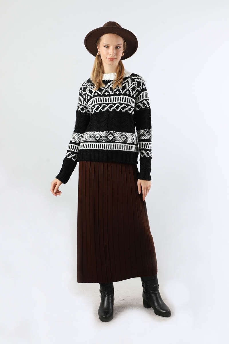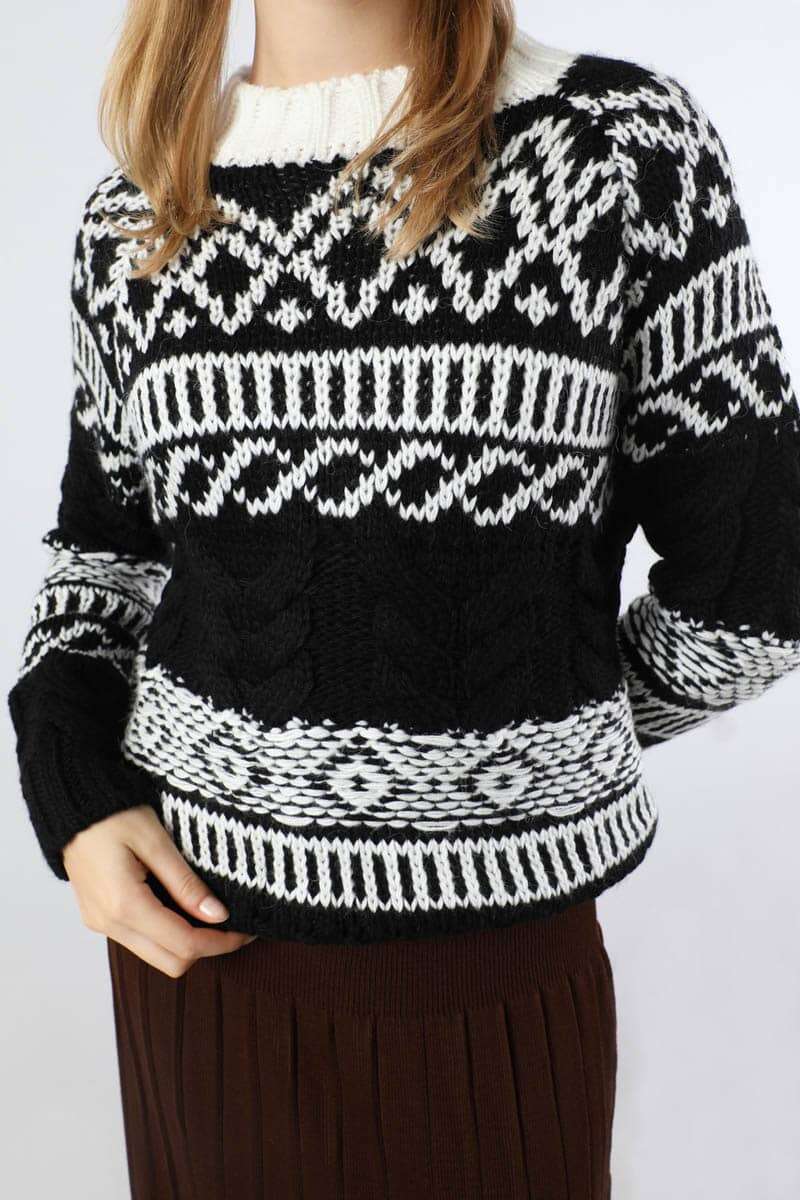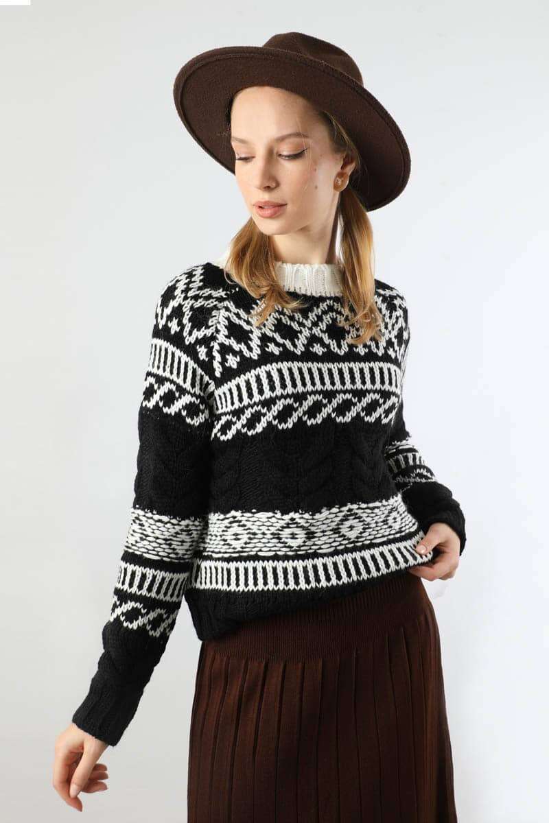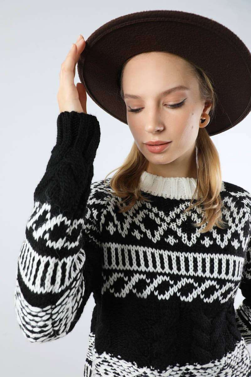 Desenli Kısa Kazak Siyah. Reglan kolludur. Düşük omuzludur. Bisiklet yakalıdır. Günlük kullanım ve özel günlerinizde tercih edebilirsiniz.