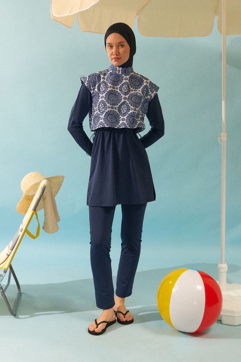 Desenli Klasik Tesettür Mayo Lacivert, Mayo takımı, uzun kollu ve vücuda oturmayan kesimiyle alt tunik, belden lastikli tam boy pantolon oluşmaktadır. Tunik kısmının üst bölümünde yer alan modern desenli detay, tasarıma şık bir dokunuş katmakatadır. Minimalist ve estetik görünümüyle dikkat çeken bu mayo, hem günlük plaj kullanımına hem de tatil kombinlerinize rahatlıkla uyum sağlar.