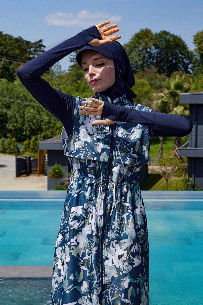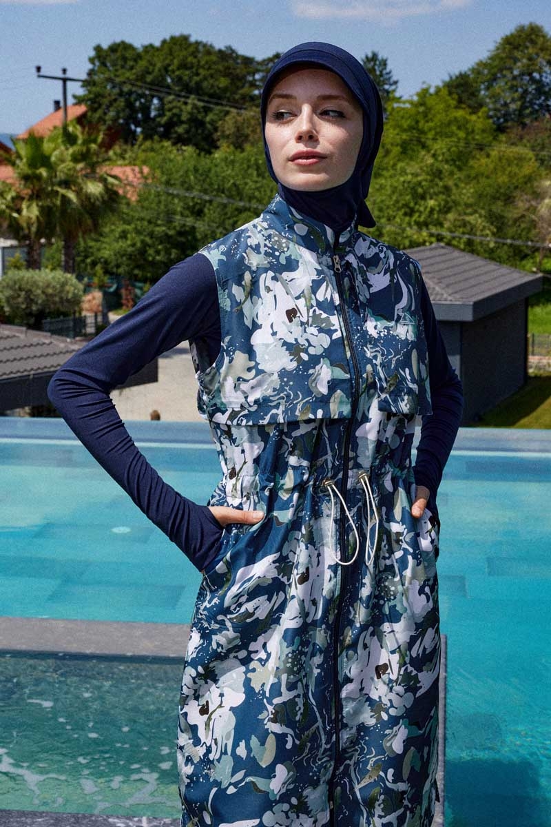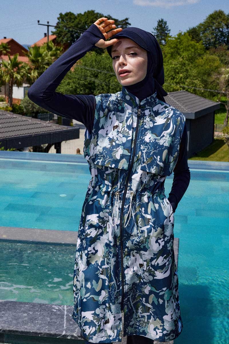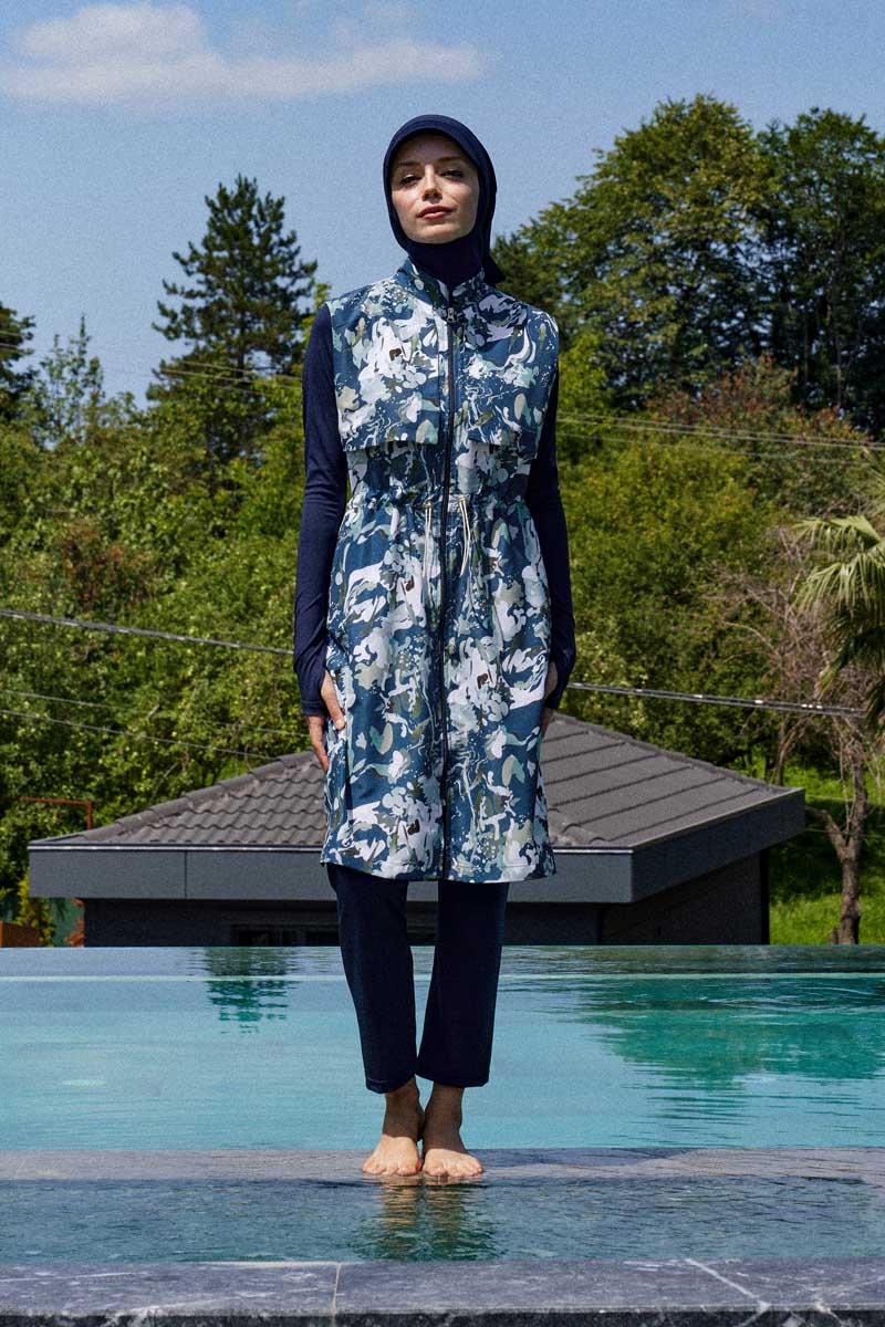 Desenli Yelekli Tesettür Mayo Mavi.Hakim yakalıdır, ürünün bel kısmında ayarlanabilir stoper mevcuttur, rüzgarlıklıdır, yandan kısa yırtmaçlıdır, önden gizli fermuarlıdır, gizli ceptir. İç body bilek kısmı, parmak geçme detayına sahiptir.Sudan çıkıldığında kısa süre içerisinde kurur ve bu sayede ürün üzerinize yapışmaz.Paket İçeriği: İç body, tayt, üst tunik, bonesi ve çantası olarak satılmaktadır. (Şapka takıma dahil değildir.)