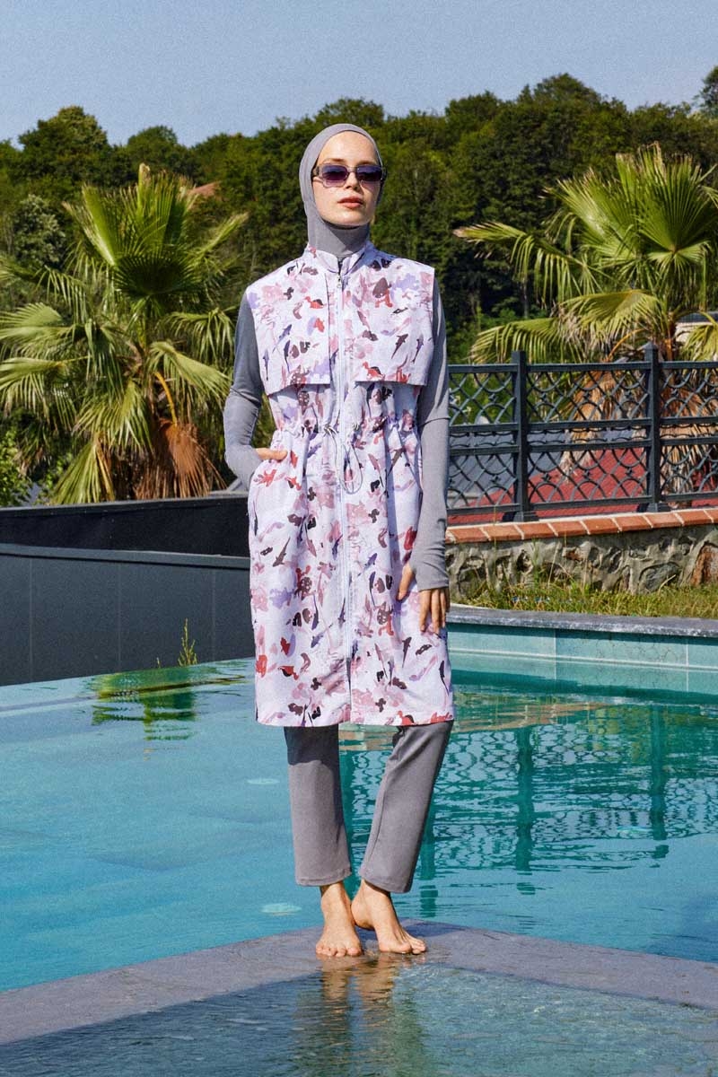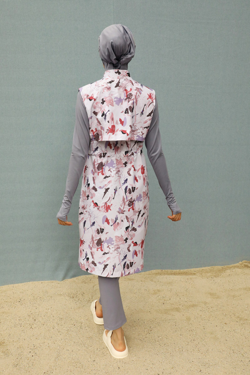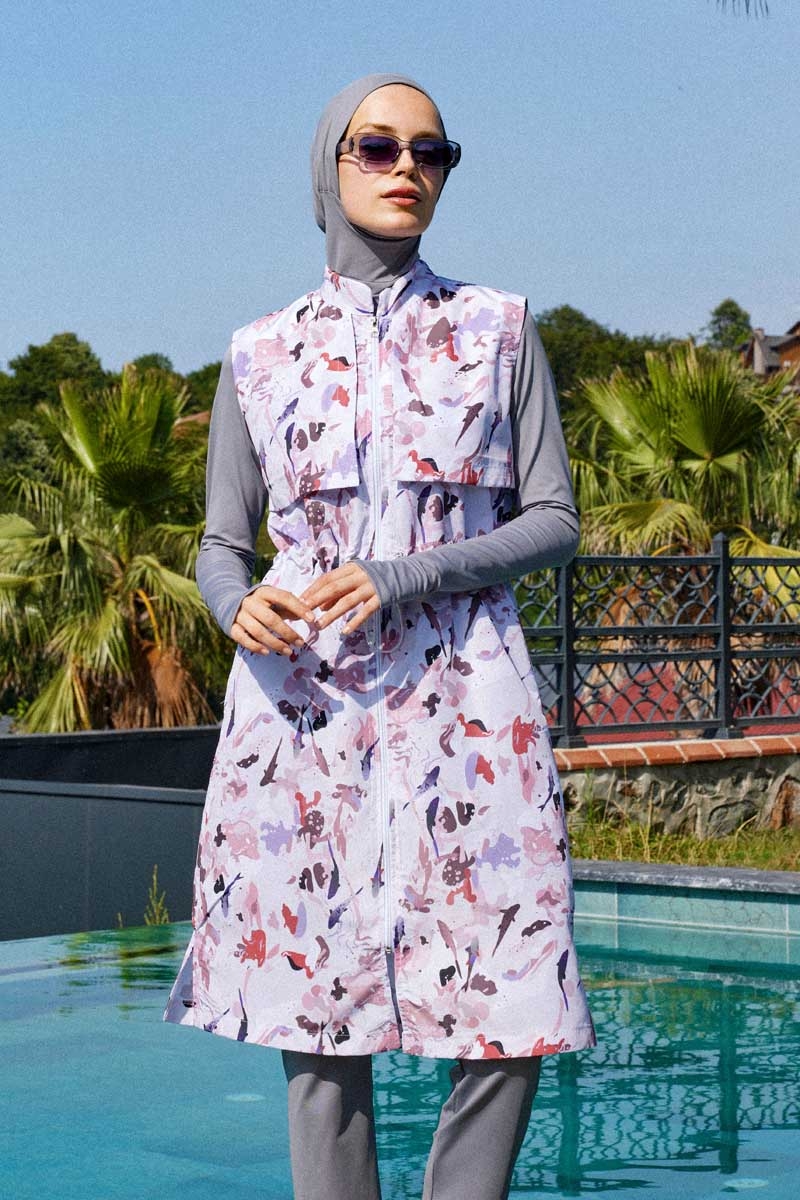Desenli Yelekli Tesettür Mayo Pudra.Hakim yakalıdır, ürünün bel kısmında ayarlanabilir stoper mevcuttur, rüzgarlıklıdır, yandan kısa yırtmaçlıdır, önden gizli fermuarlıdır, gizli ceptir. İç body bilek kısmı, parmak geçme detayına sahiptir.Sudan çıkıldığında kısa süre içerisinde kurur ve bu sayede ürün üzerinize yapışmaz.Paket İçeriği: İç body, tayt, üst tunik, bonesi ve çantası olarak satılmaktadır. (Şapka takıma dahil değildir.)