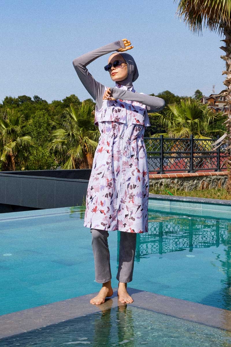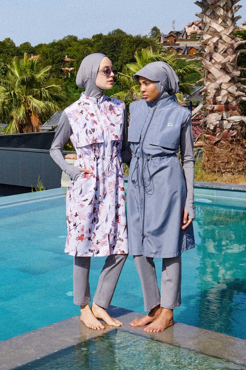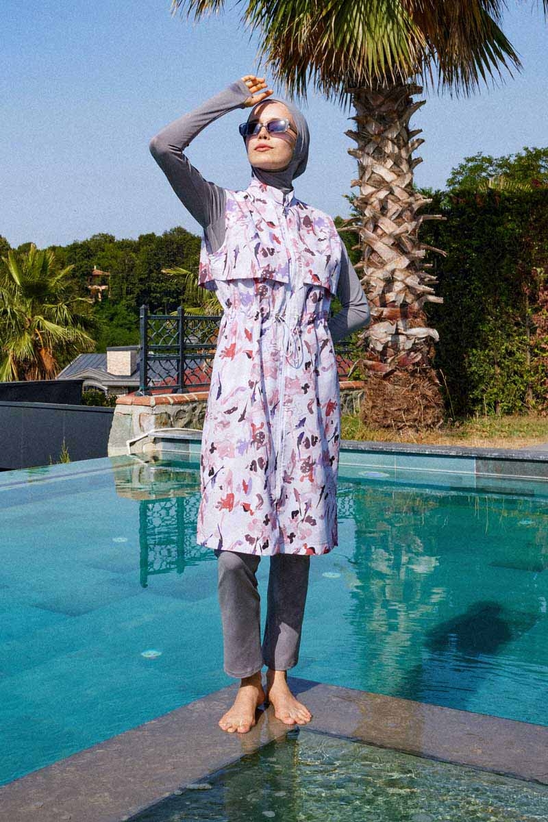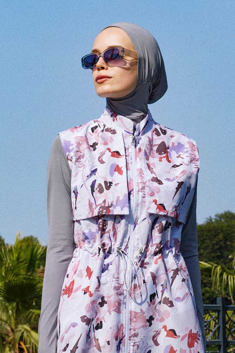 Desenli Yelekli Tesettür Mayo Pudra.Hakim yakalıdır, ürünün bel kısmında ayarlanabilir stoper mevcuttur, rüzgarlıklıdır, yandan kısa yırtmaçlıdır, önden gizli fermuarlıdır, gizli ceptir. İç body bilek kısmı, parmak geçme detayına sahiptir.Sudan çıkıldığında kısa süre içerisinde kurur ve bu sayede ürün üzerinize yapışmaz.Paket İçeriği: İç body, tayt, üst tunik, bonesi ve çantası olarak satılmaktadır. (Şapka takıma dahil değildir.)