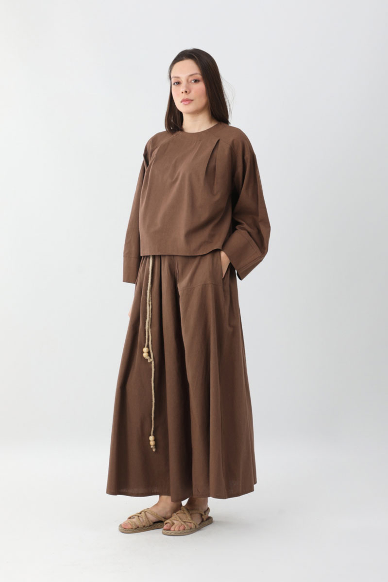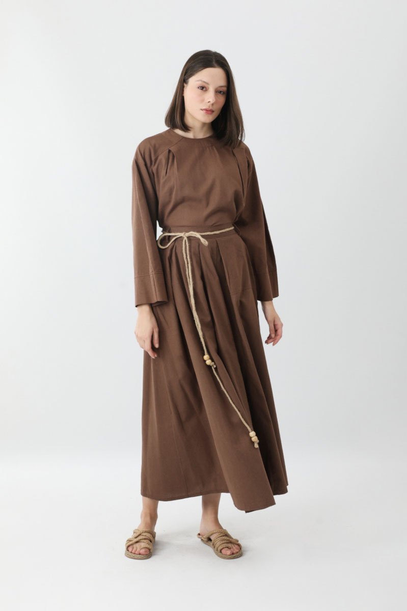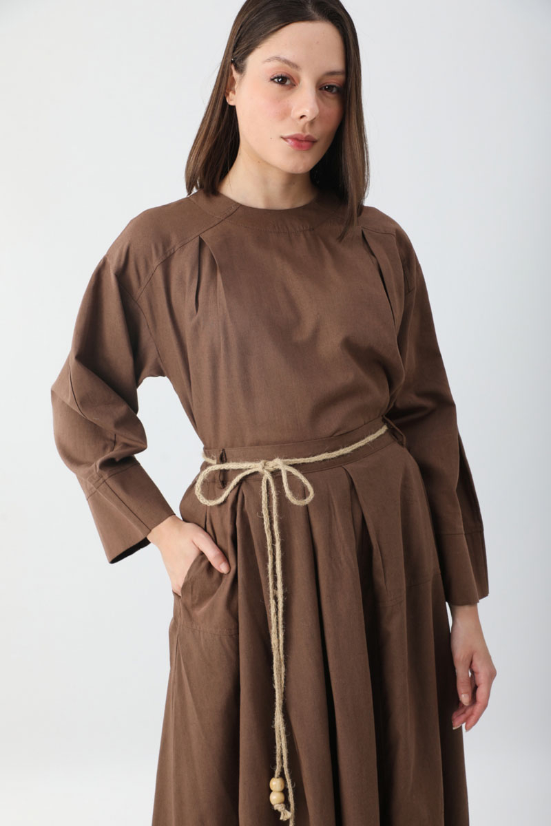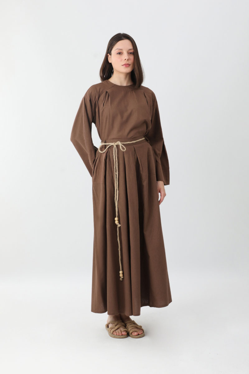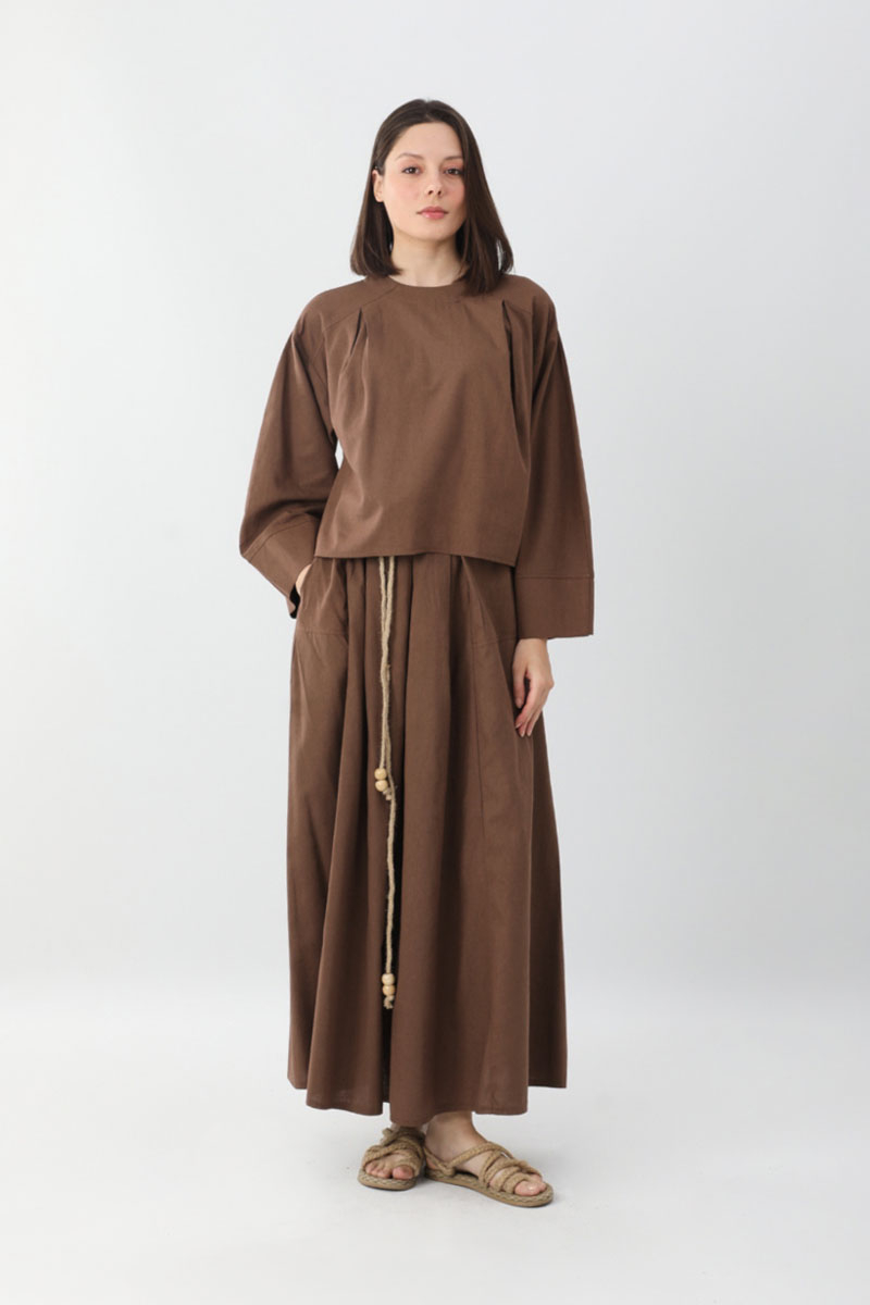 Devin Etek Takım Kahverengi. Bisiklet yakadır, Üst bluz önden pili kaşe detaylıdır, düşük kolludur, bol kalıptır. Etek: Pileli ve korsajlıdır, beli hasır kemer detaylıdır, yandan ceplidir, arka bel lastiklidir, astarsız, Günlük kullanım ve özel günlerinizde tercih edebilirsiniz.