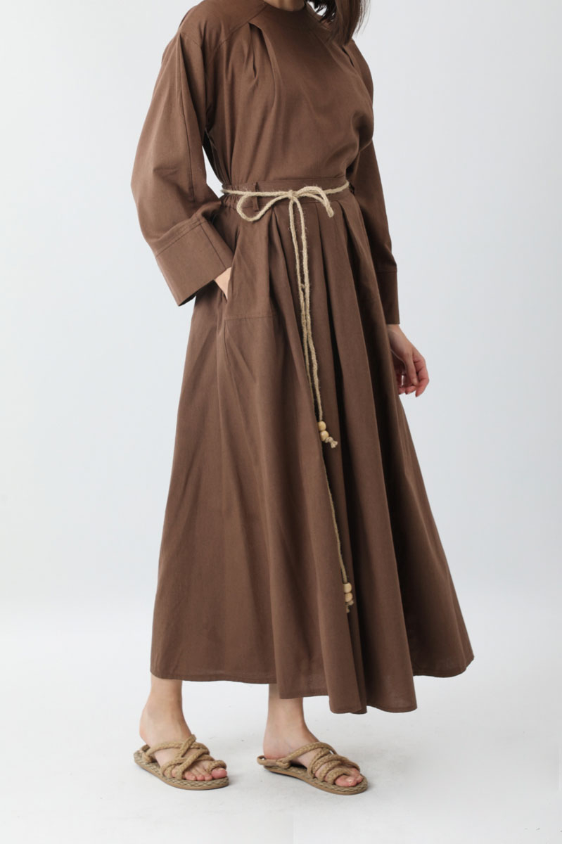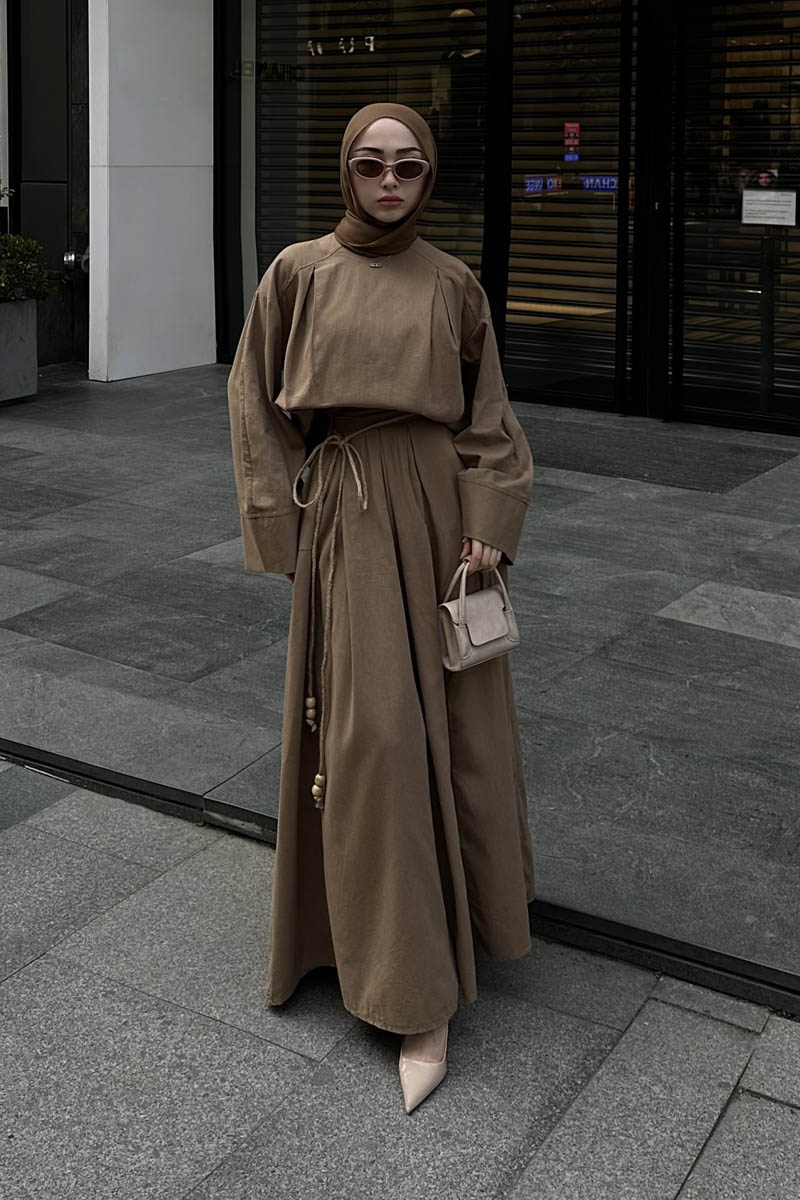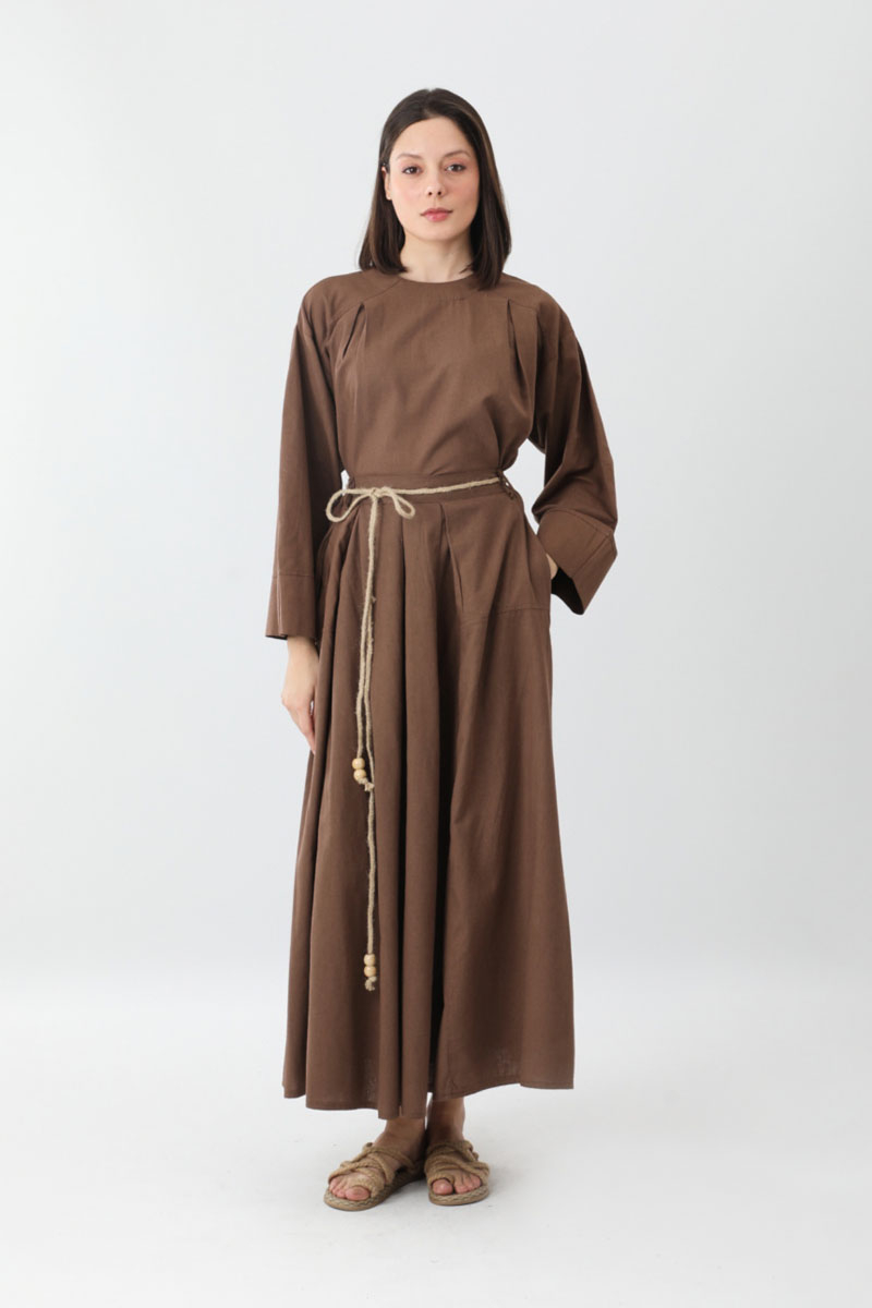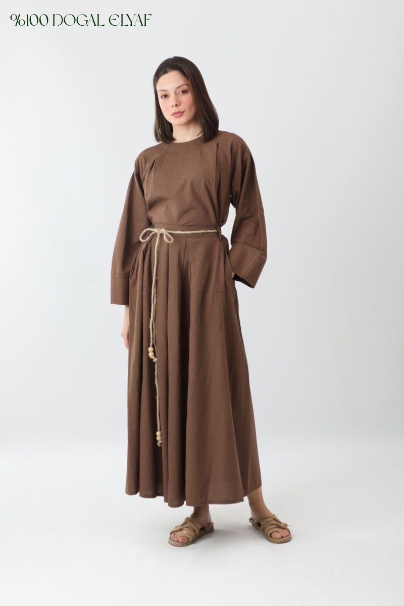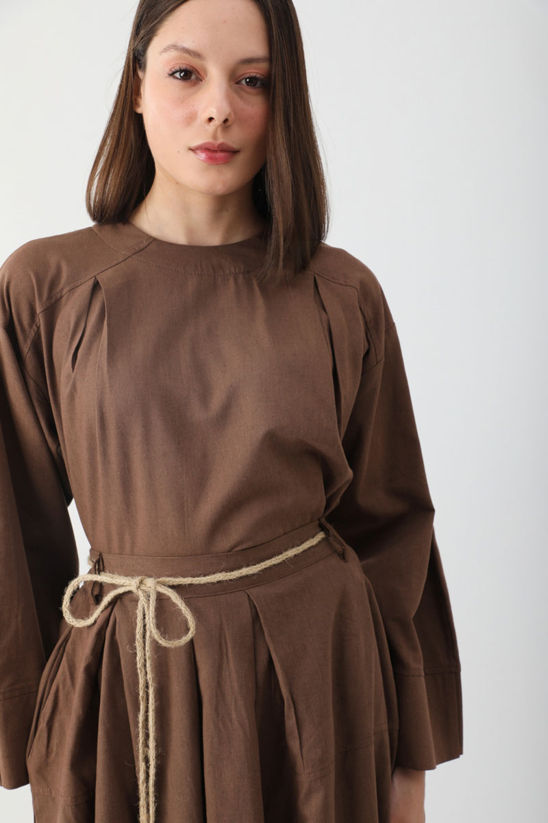Devin Etek Takım Kahverengi. Bisiklet yakadır, Üst bluz önden pili kaşe detaylıdır, düşük kolludur, bol kalıptır. Etek: Pileli ve korsajlıdır, beli hasır kemer detaylıdır, yandan ceplidir, arka bel lastiklidir, astarsız, Günlük kullanım ve özel günlerinizde tercih edebilirsiniz.