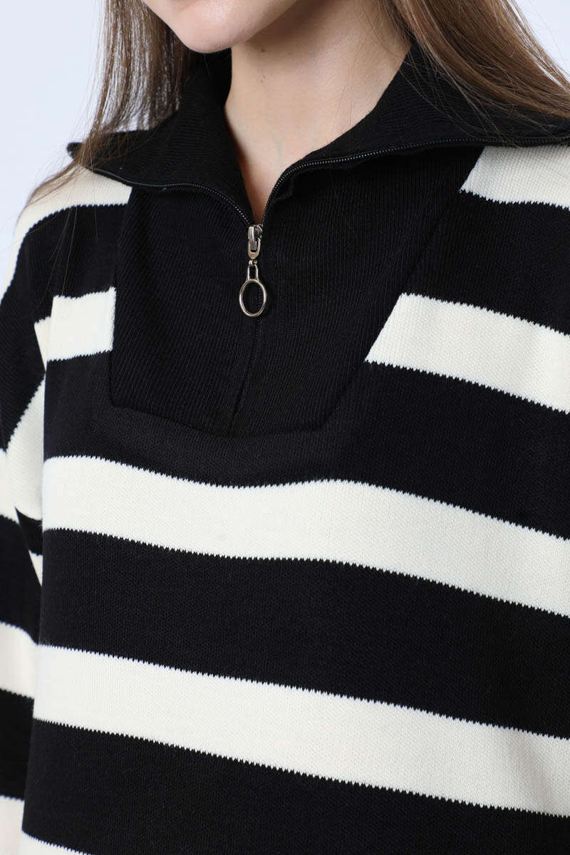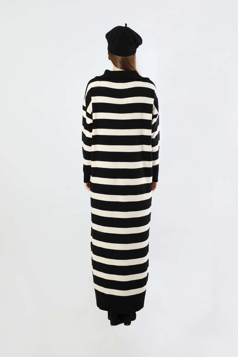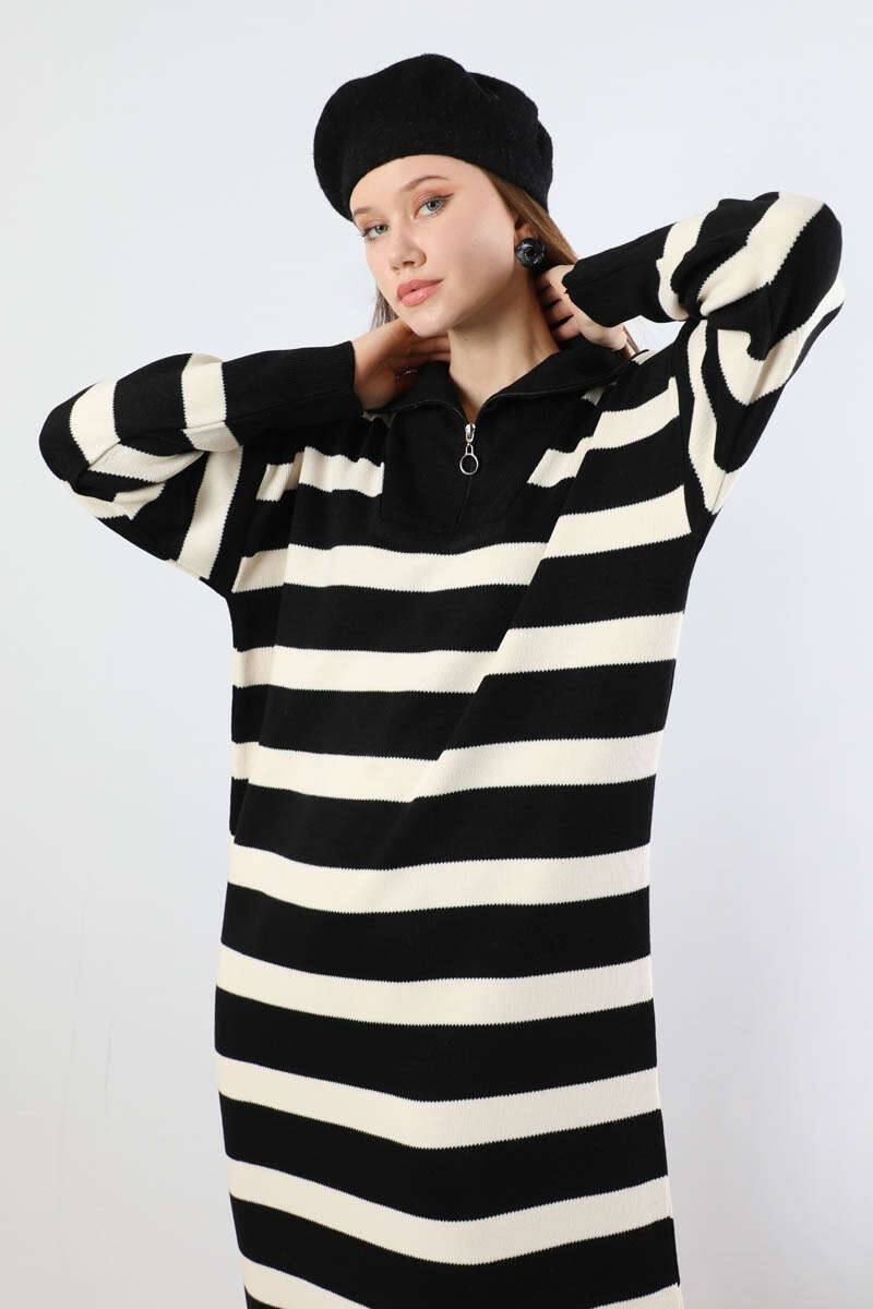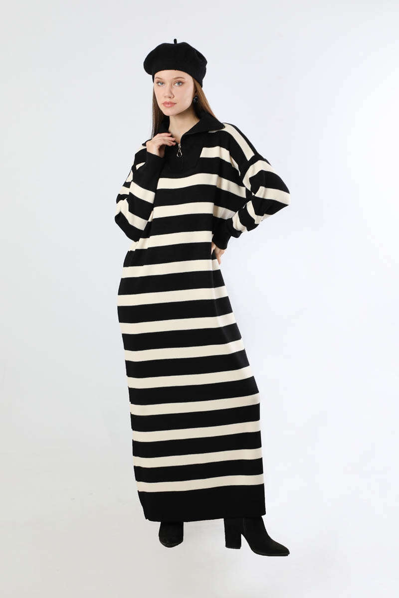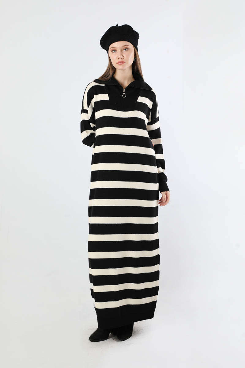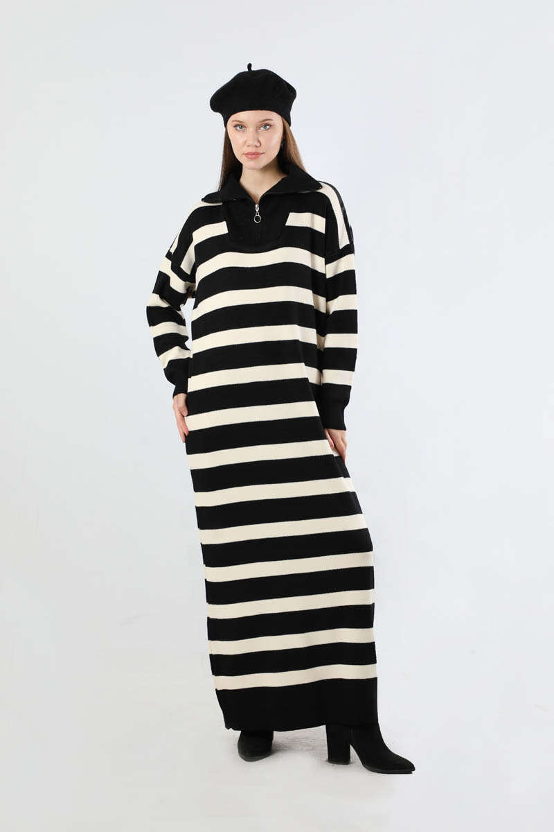 Dik Yaka Çizgili Triko Elbise Siyah. Yaka robalı ve fermuar detaylıdır. Düşük omuzludur. Etek ucu trikoludur. Günlük kullanım ve özel günlerinizde tercih edebilirsiniz.