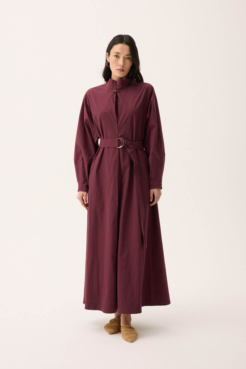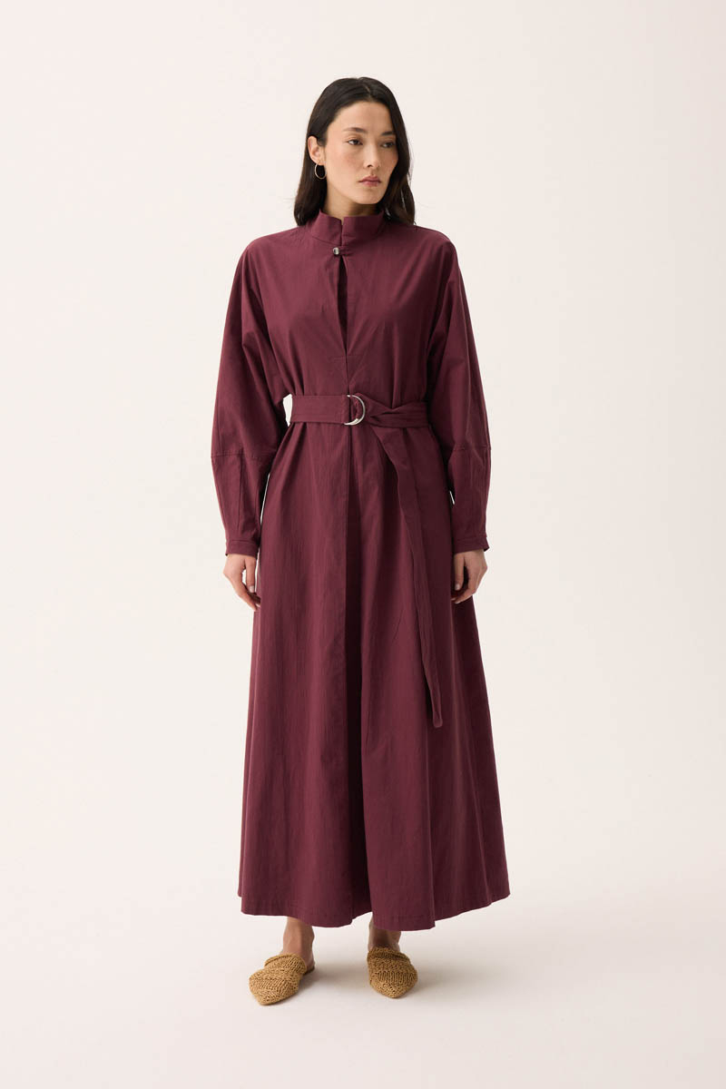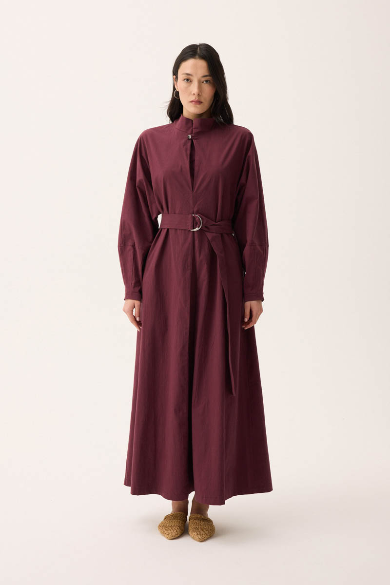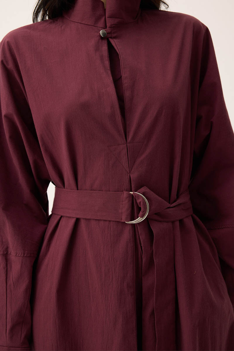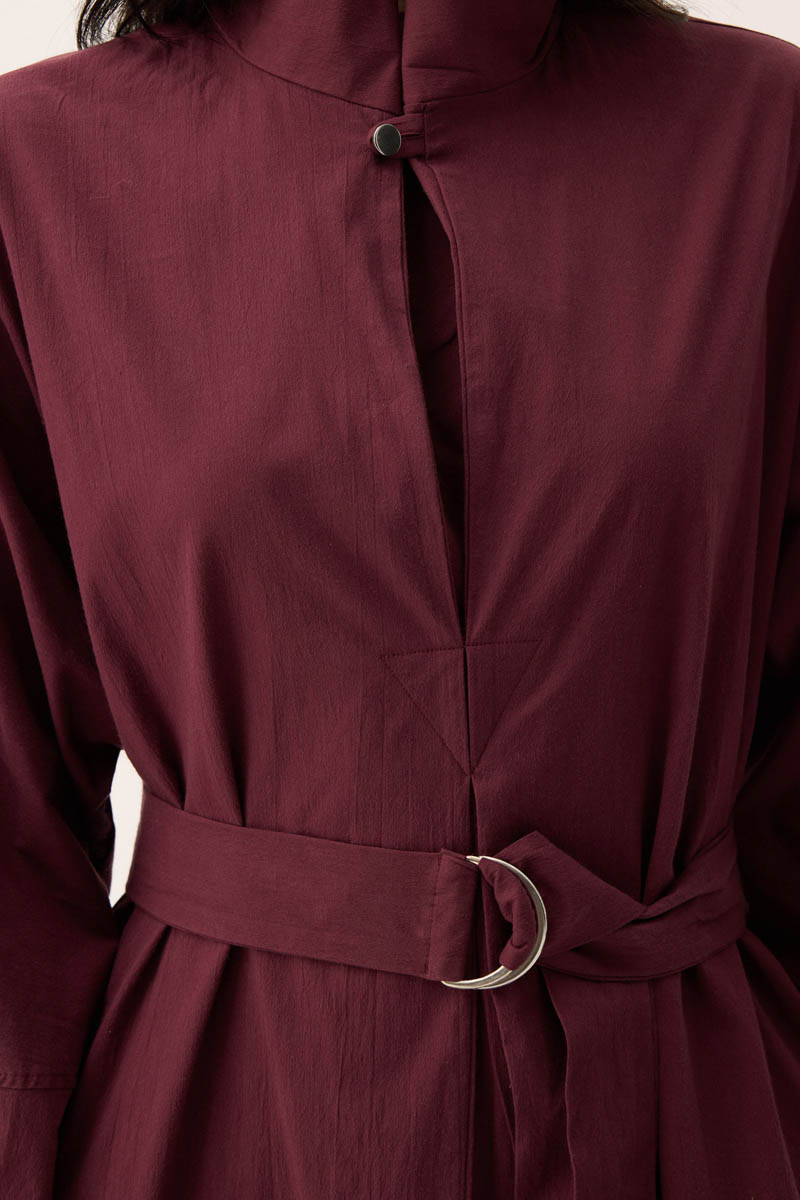 Dik Yaka Düğmeli Elbise Bordo. Dik yakadır, yakada önden a pile tasarım olup brit ilik ve metal düğme detaylıdır, düşük omuzludur kolludur, astarlıdır, yandan ceplidir, metal toka kuşaklıdır, Günlük kullanım ve özel günlerinizde tercih edebilirsiniz.