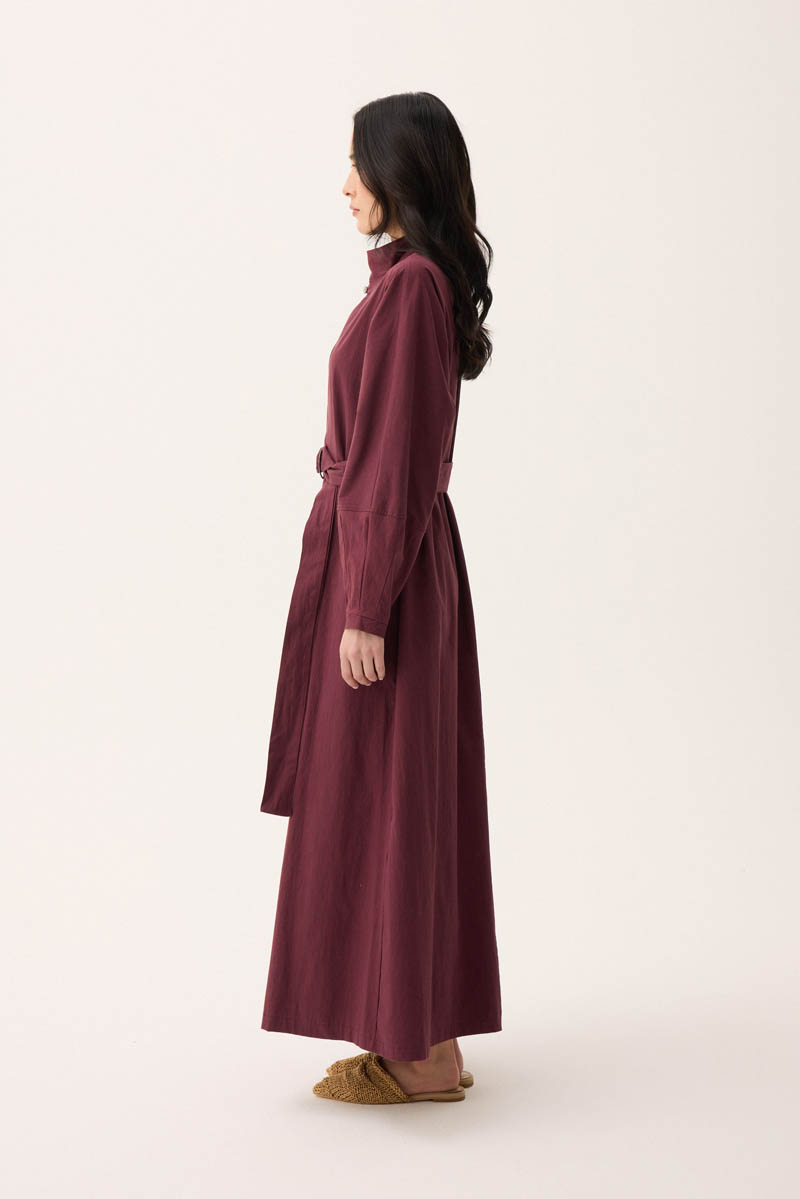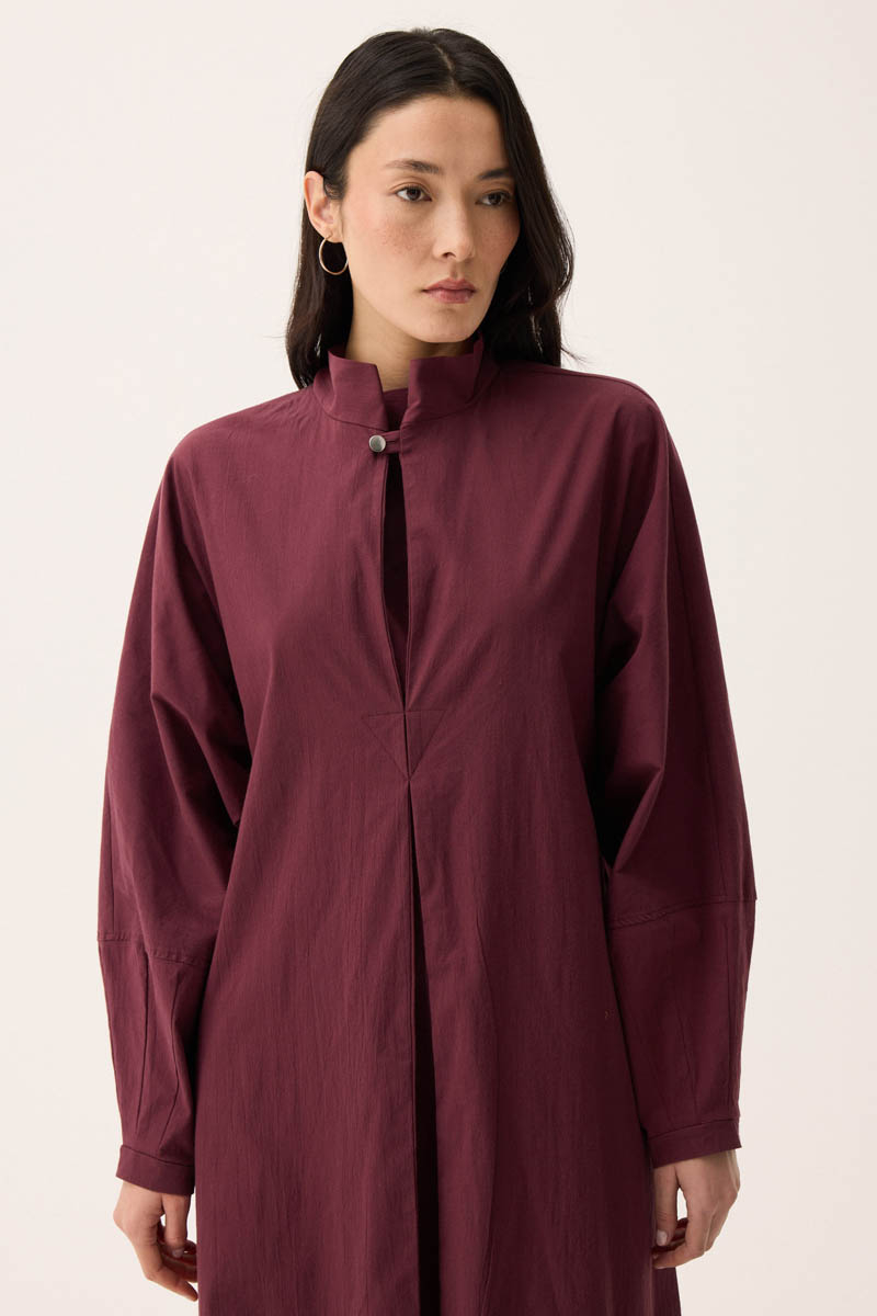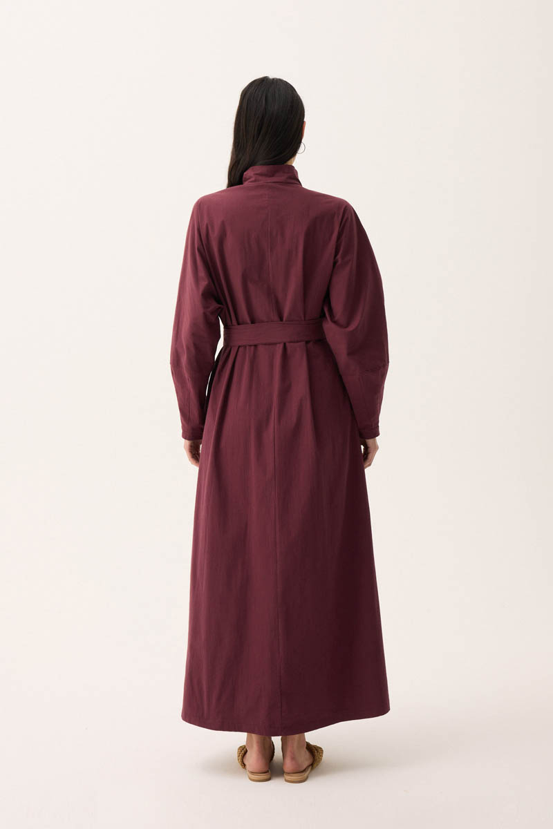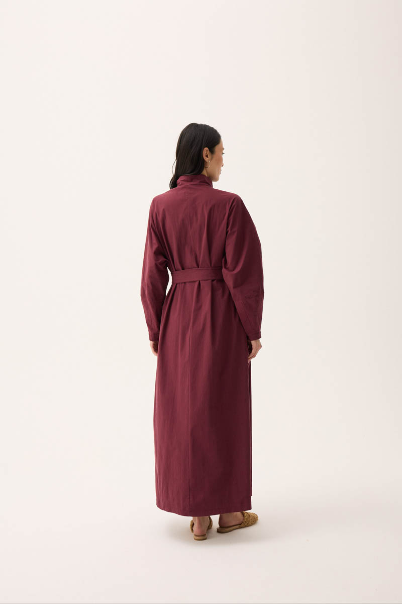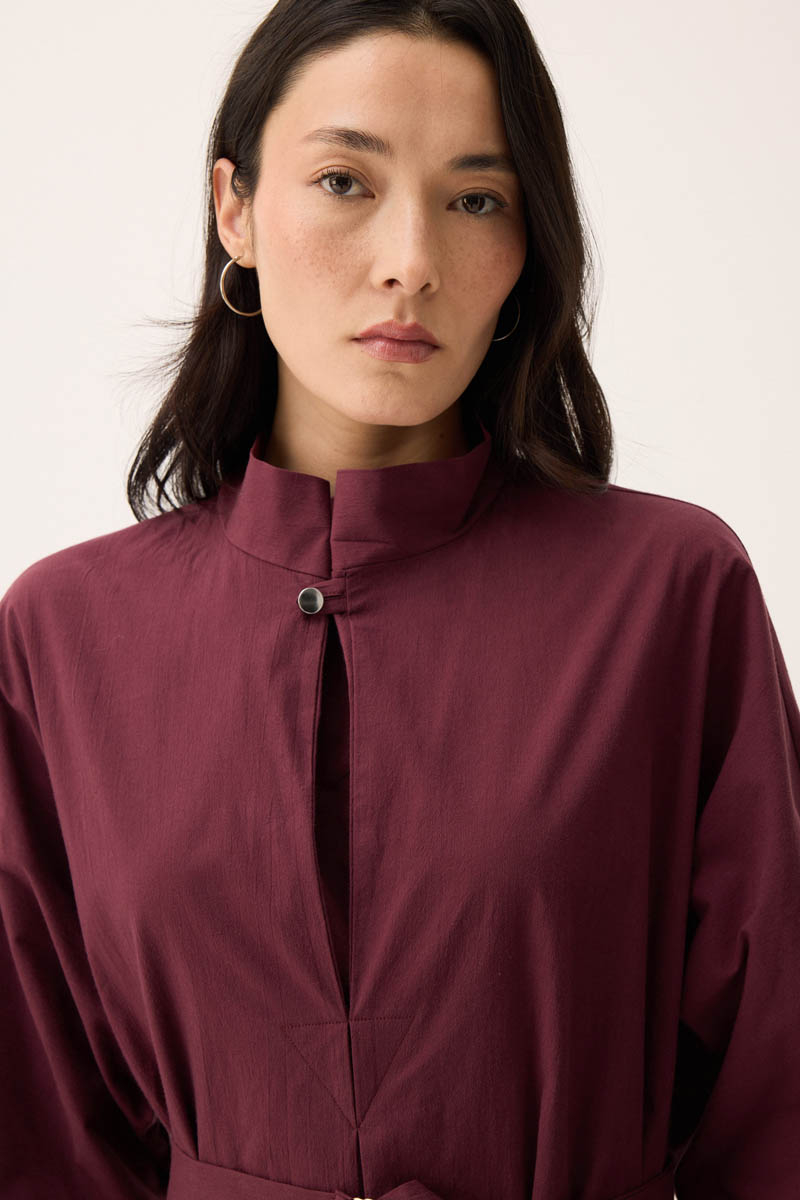 Dik Yaka Düğmeli Elbise Bordo. Dik yakadır, yakada önden a pile tasarım olup brit ilik ve metal düğme detaylıdır, düşük omuzludur kolludur, astarlıdır, yandan ceplidir, metal toka kuşaklıdır, Günlük kullanım ve özel günlerinizde tercih edebilirsiniz.