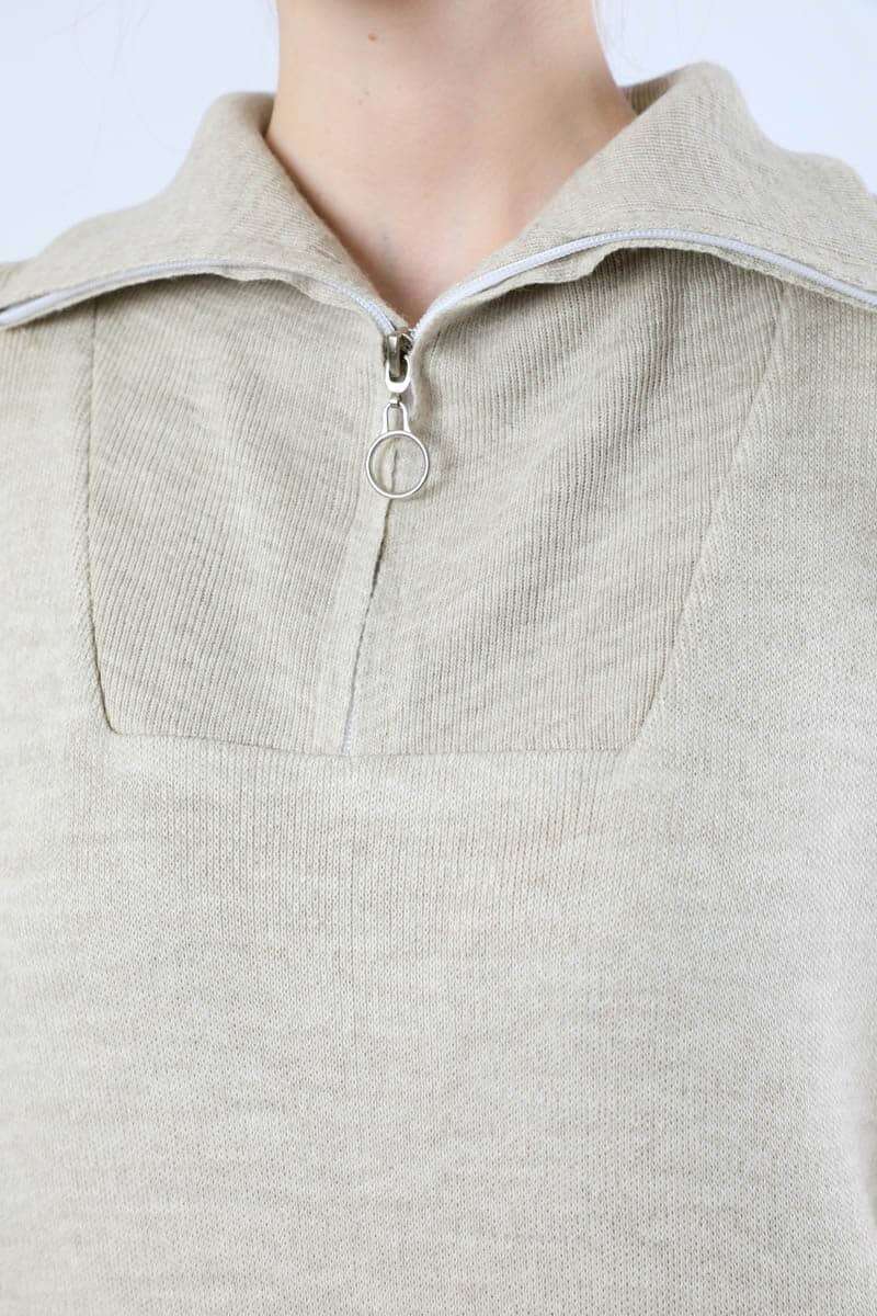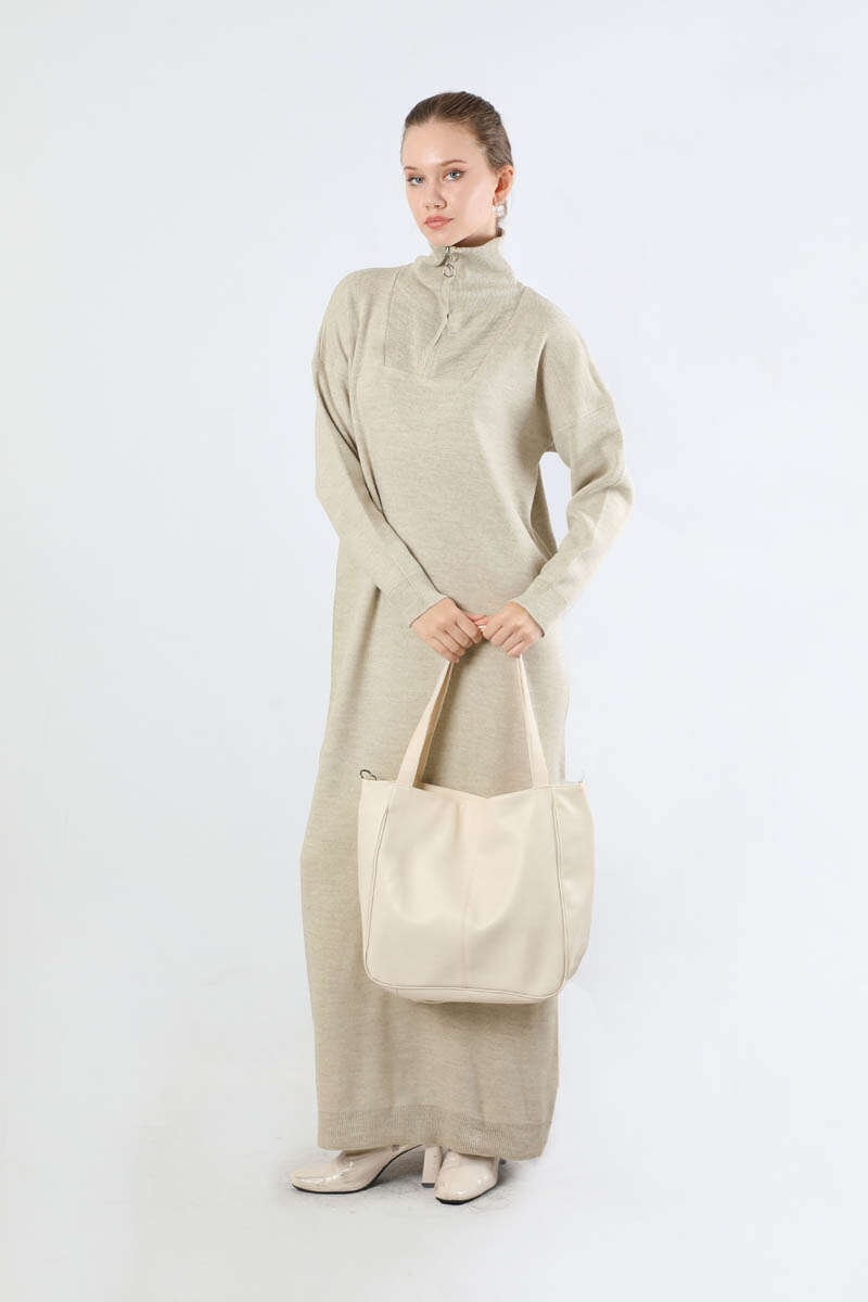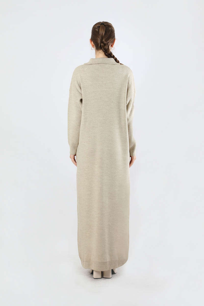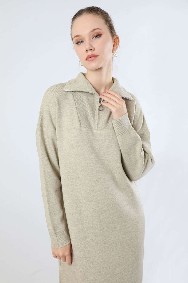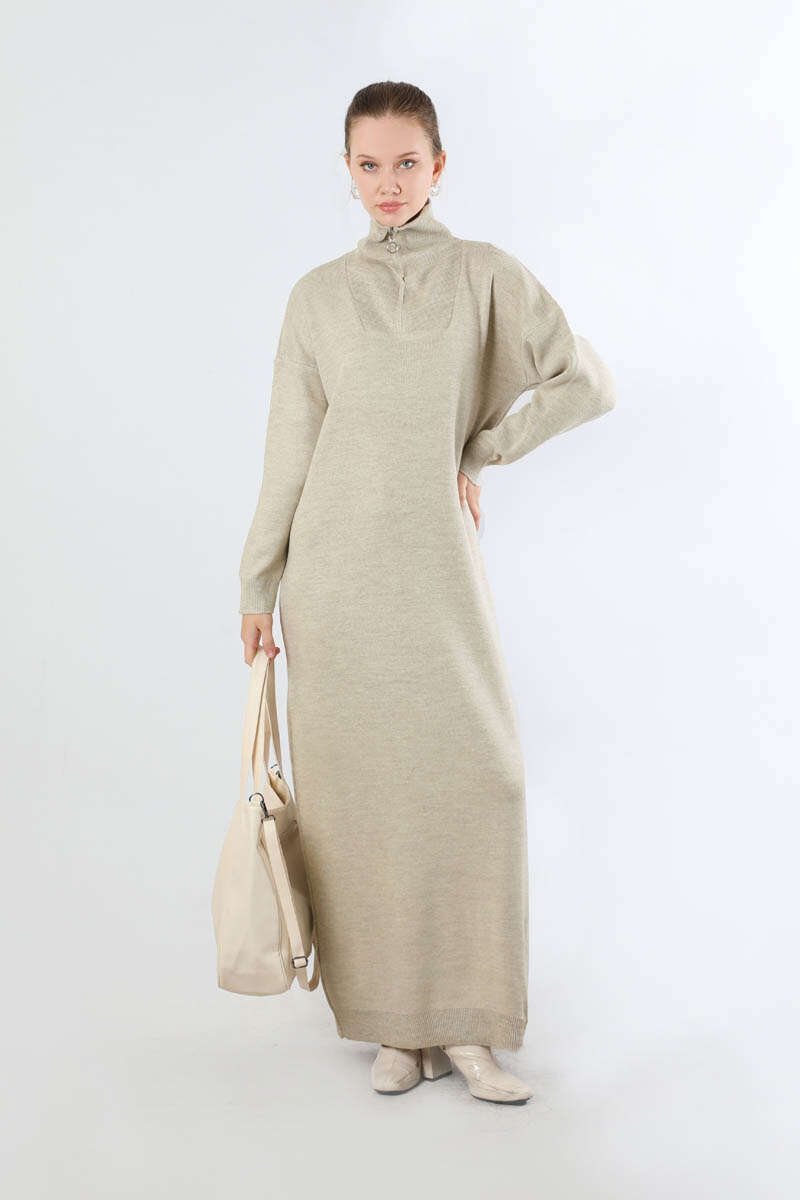 Dik Yaka Fermuarlı Triko Elbise Taş