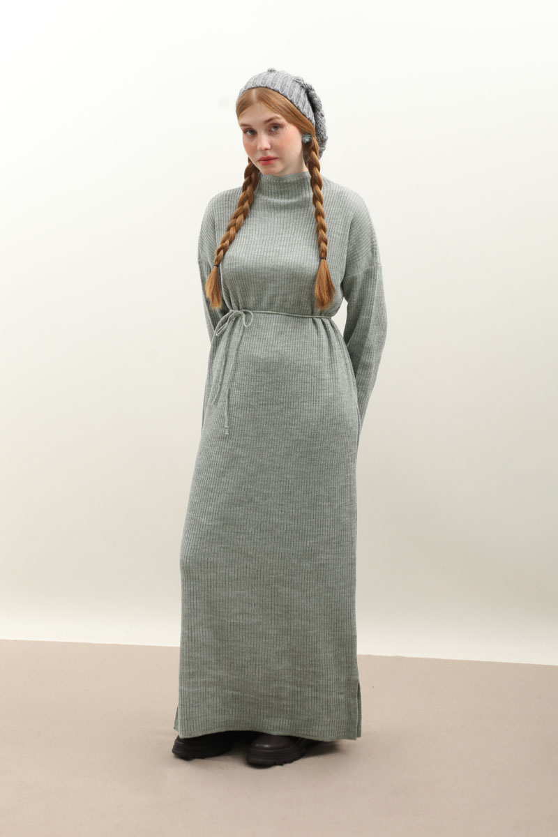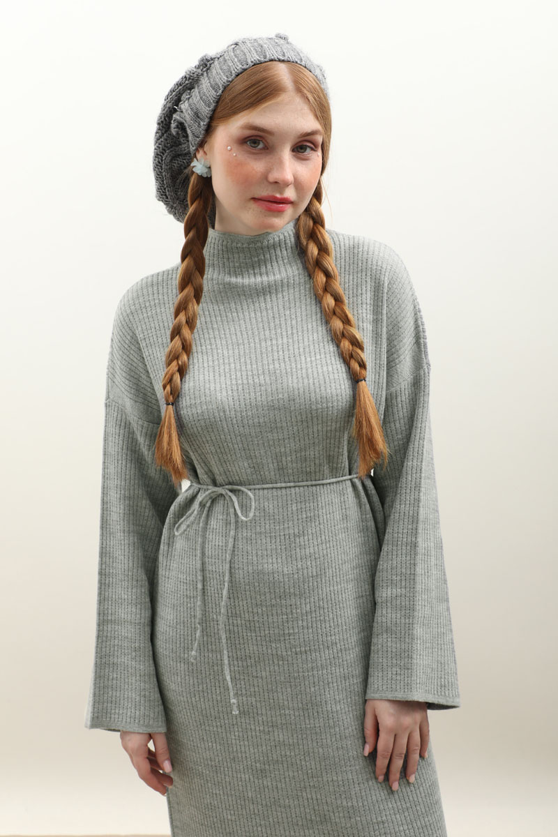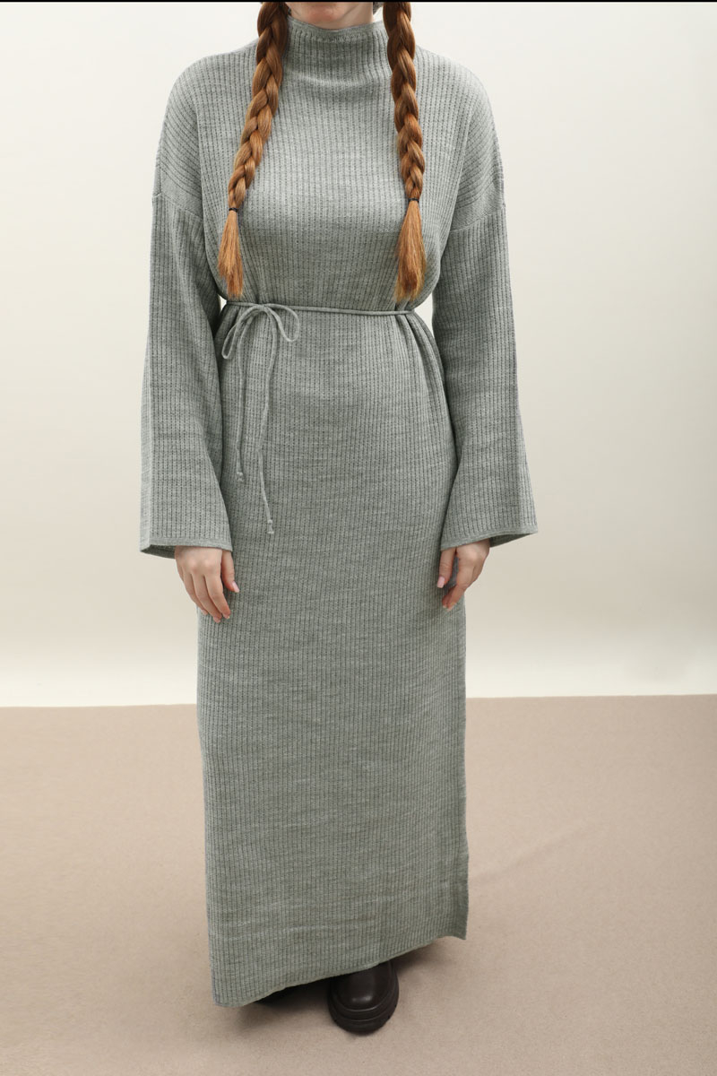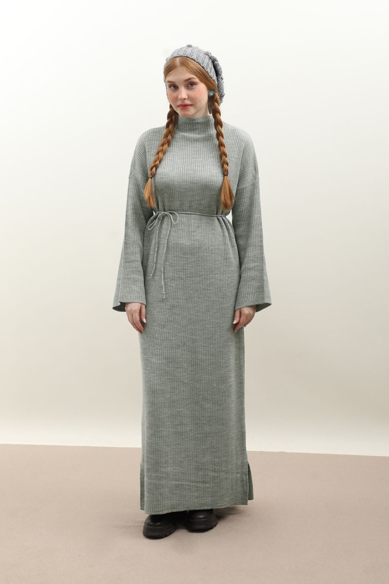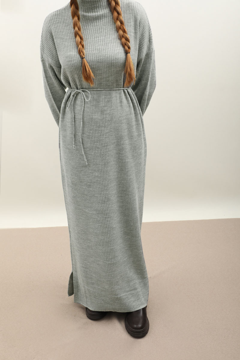 Dik Yaka Triko Elbise Gri. dik yakadır, düşük omuzludur, etek ucu yırtmaçlıdır, ince biye kuşaklıdır, cepsizdir, astarsızdır. Günlük kullanım için uygundur.