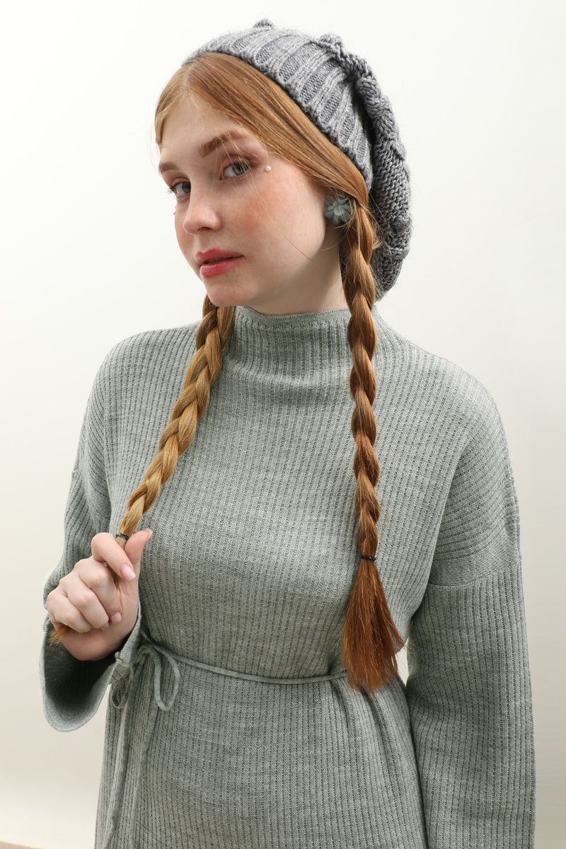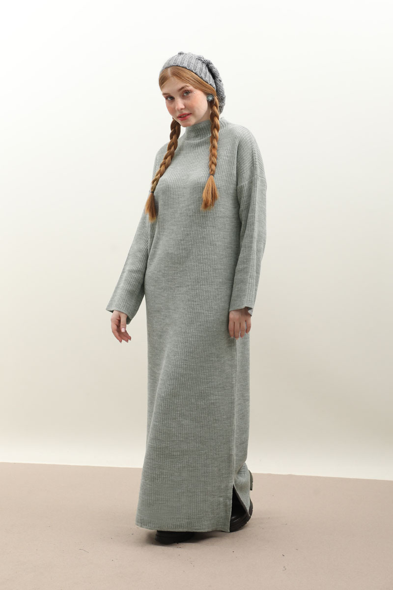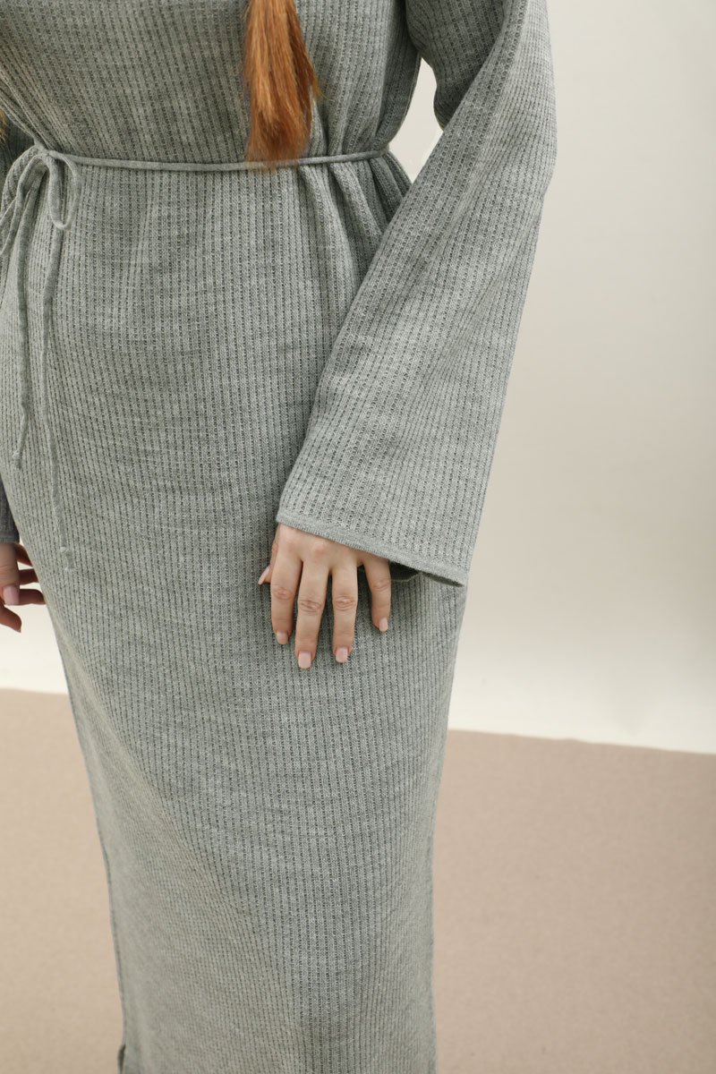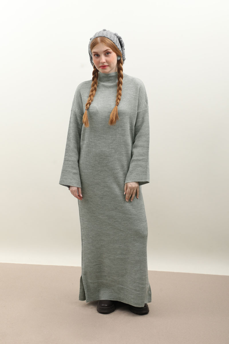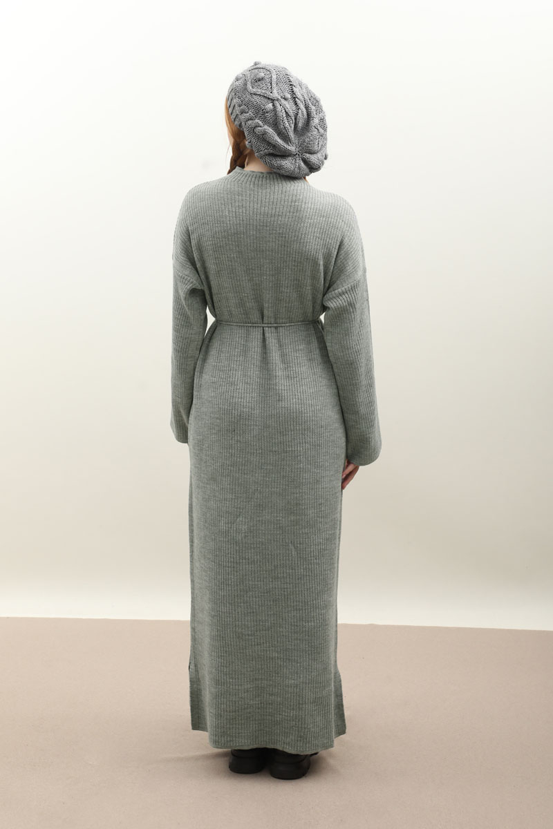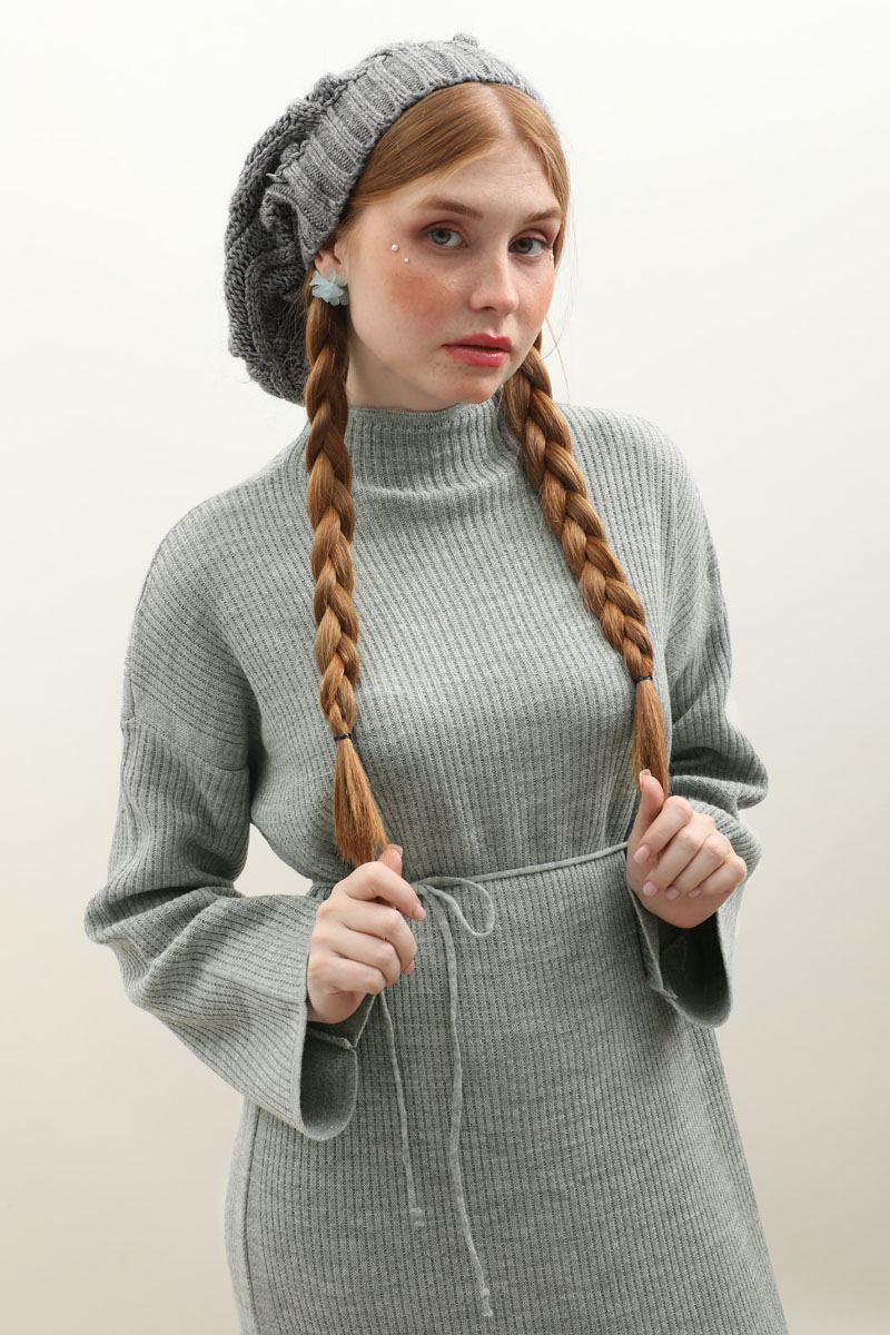 Dik Yaka Triko Elbise Gri. dik yakadır, düşük omuzludur, etek ucu yırtmaçlıdır, ince biye kuşaklıdır, cepsizdir, astarsızdır. Günlük kullanım için uygundur.