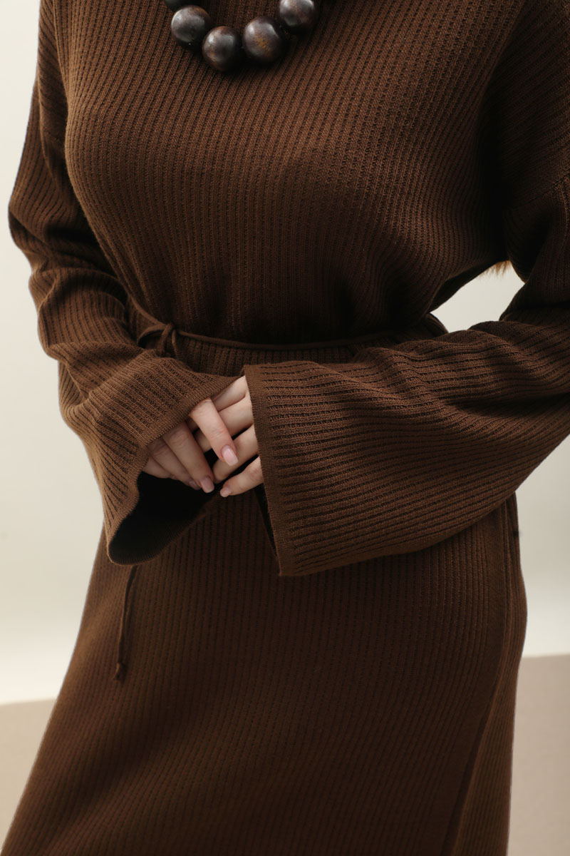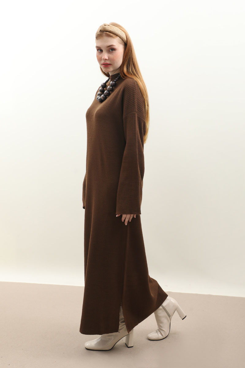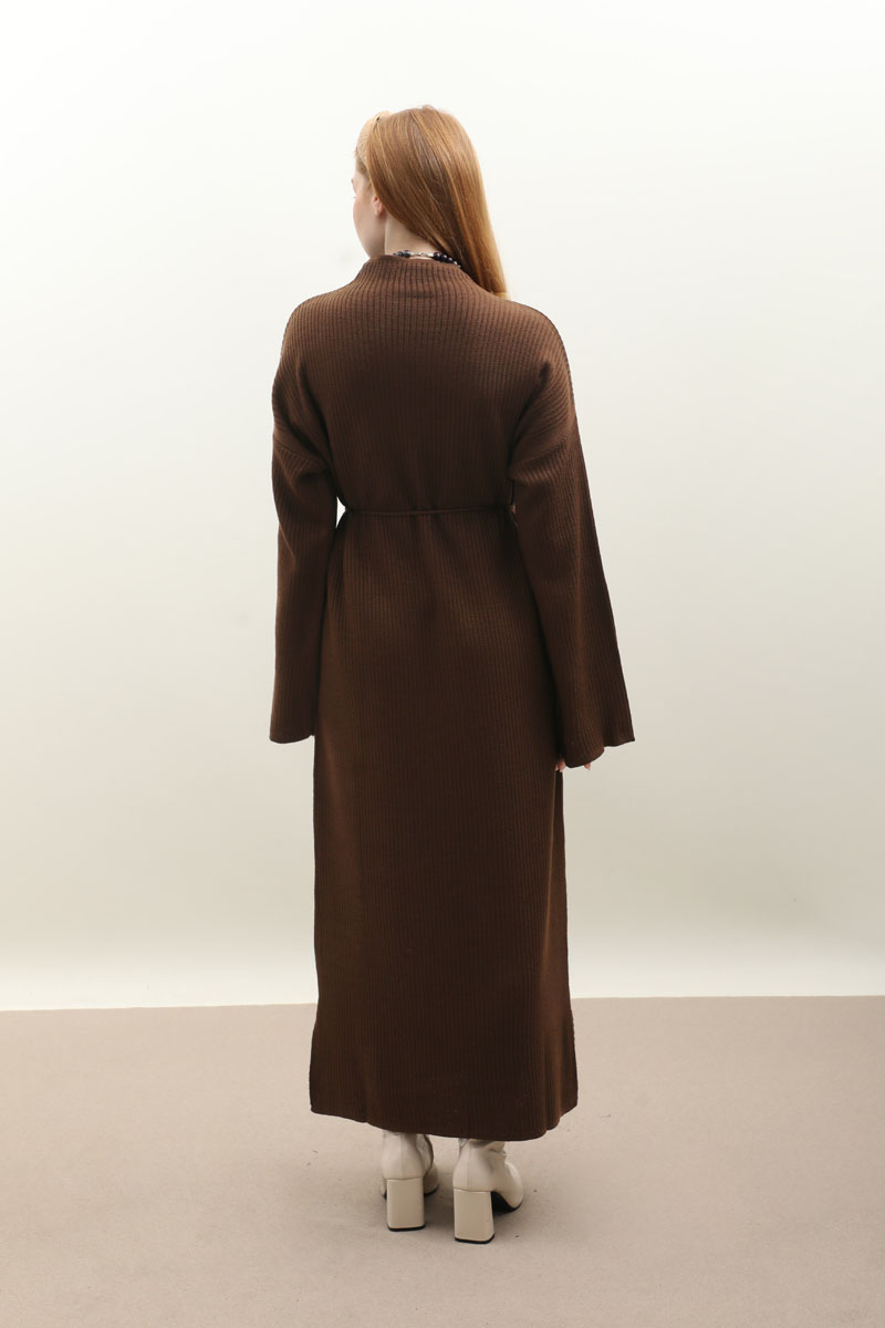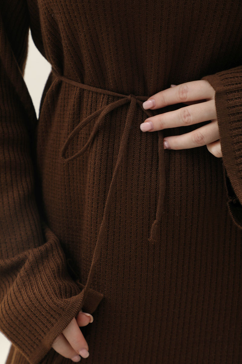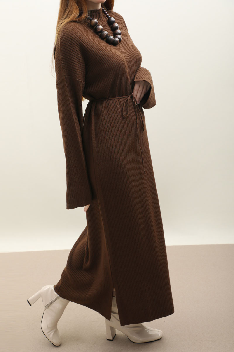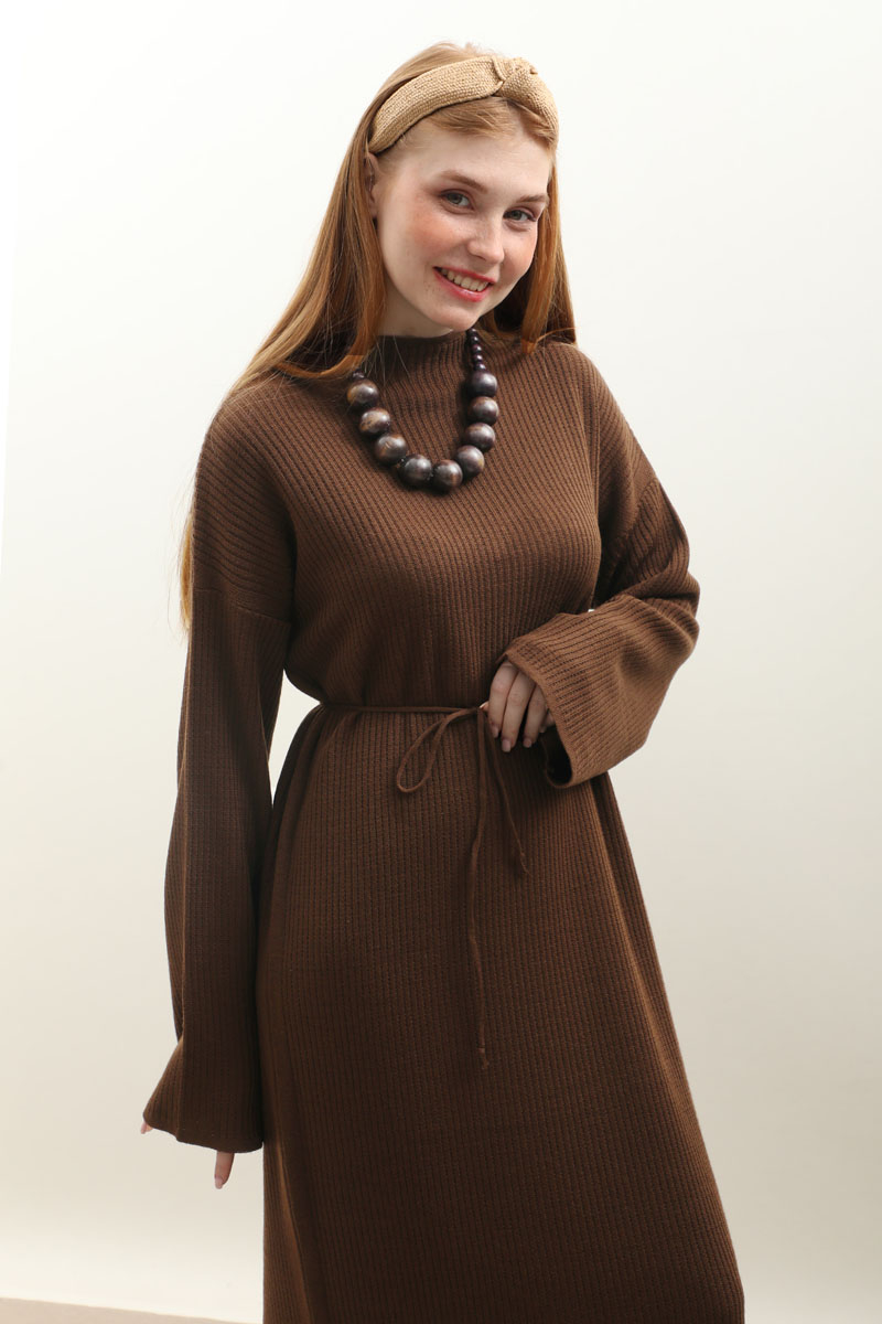 Dik Yaka Triko Elbise Kahverengi. dik yakadır, düşük omuzludur, etek ucu yırtmaçlıdır, ince biye kuşaklıdır, cepsizdir, astarsızdır. Günlük kullanım için uygundur.