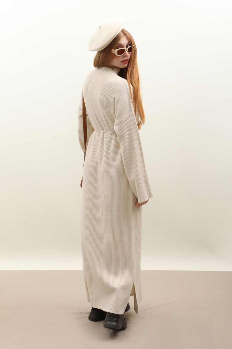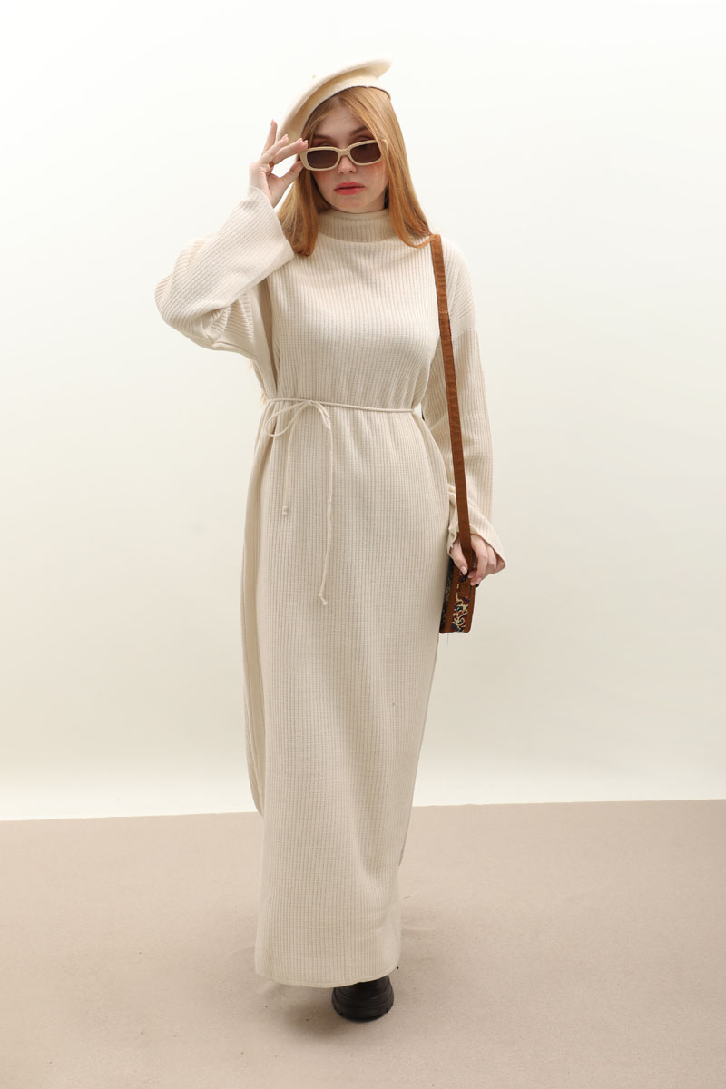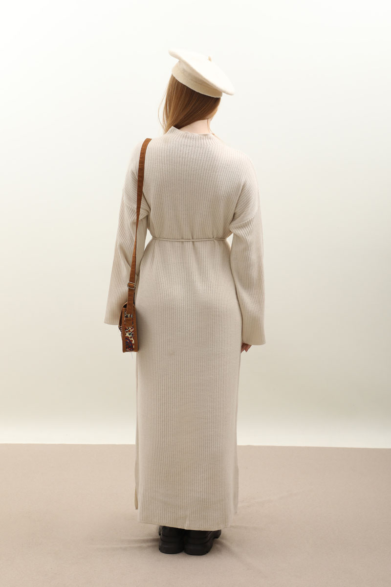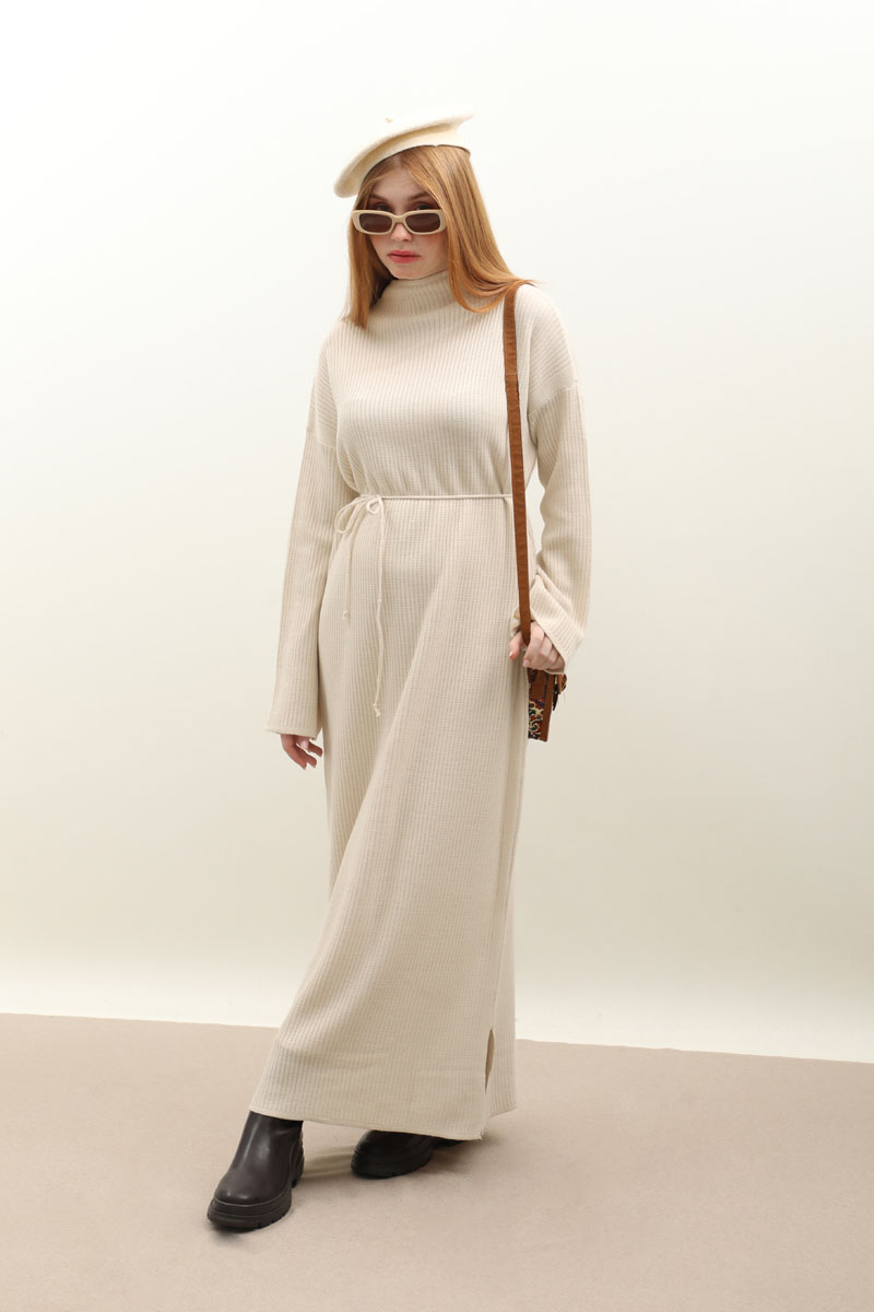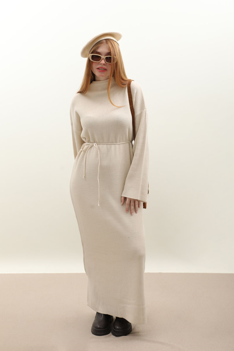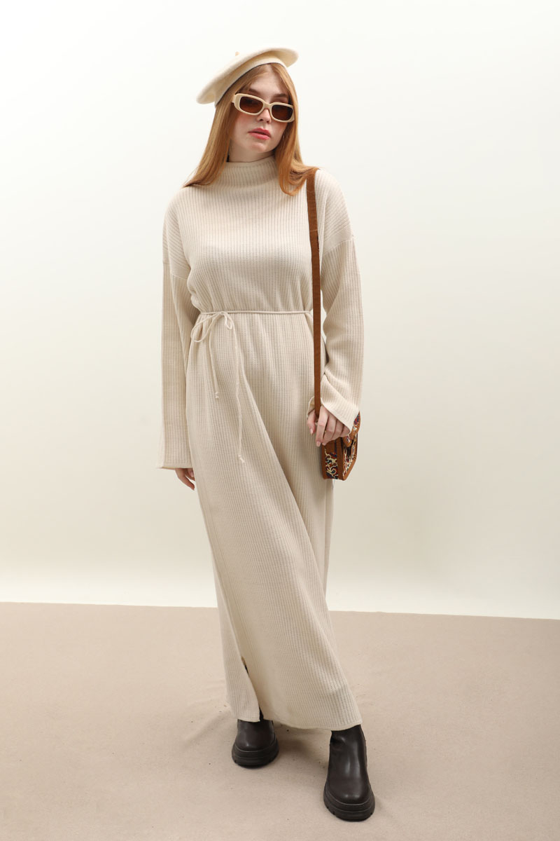 Dik Yaka Triko Elbise Taş. dik yakadır, düşük omuzludur, etek ucu yırtmaçlıdır, ince biye kuşaklıdır, cepsizdir, astarsızdır. Günlük kullanım için uygundur.
