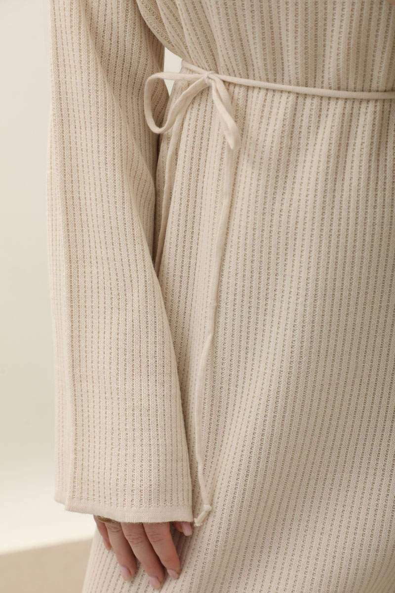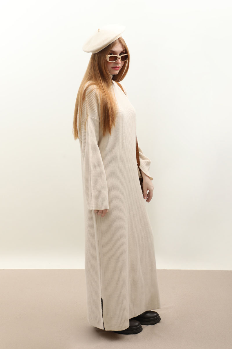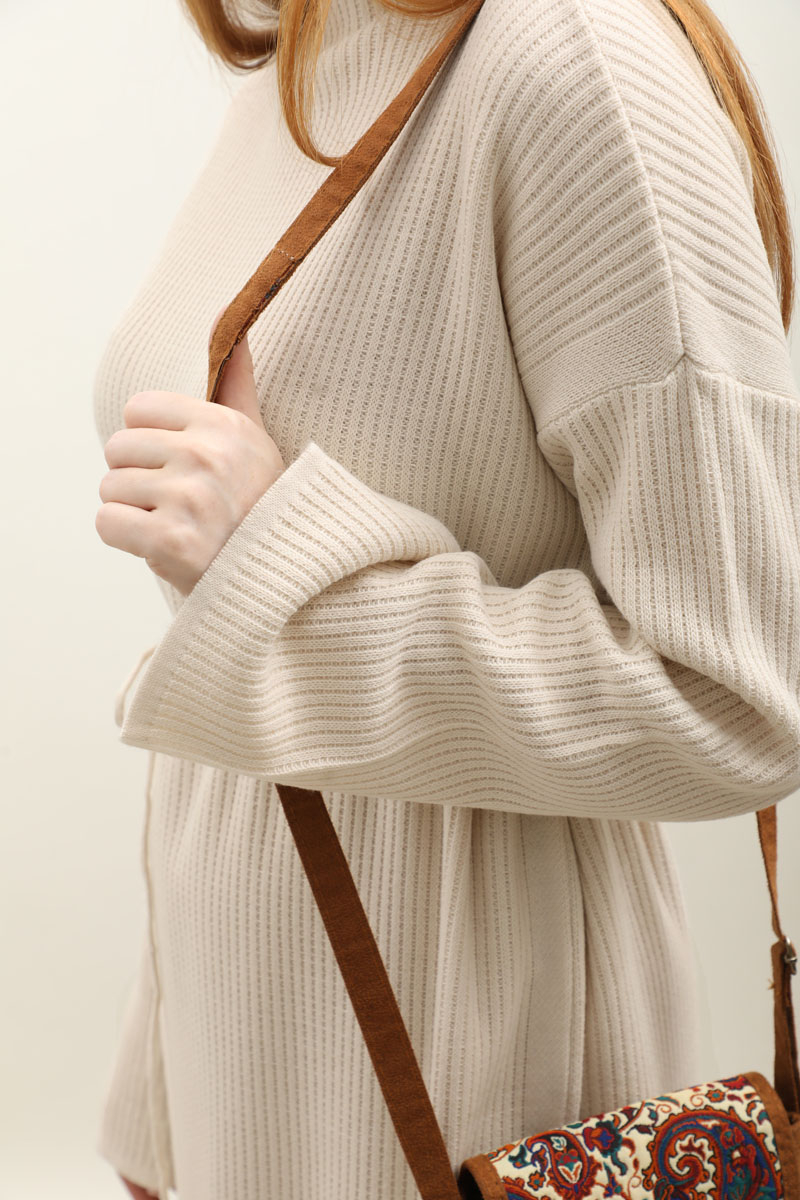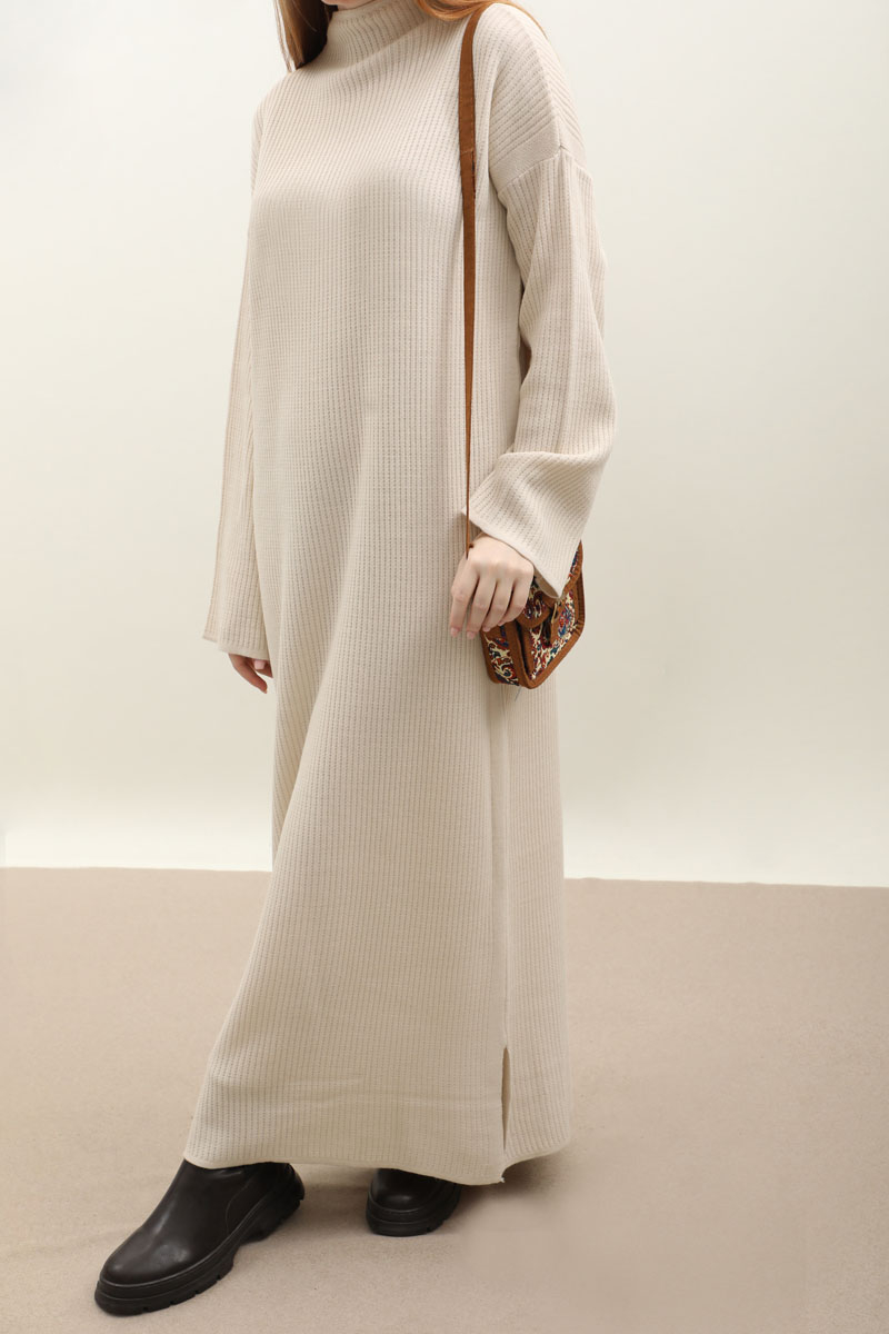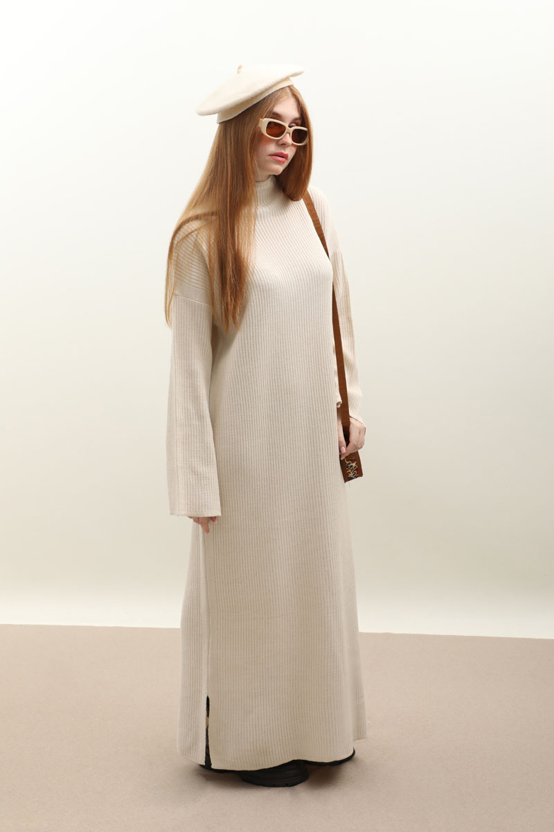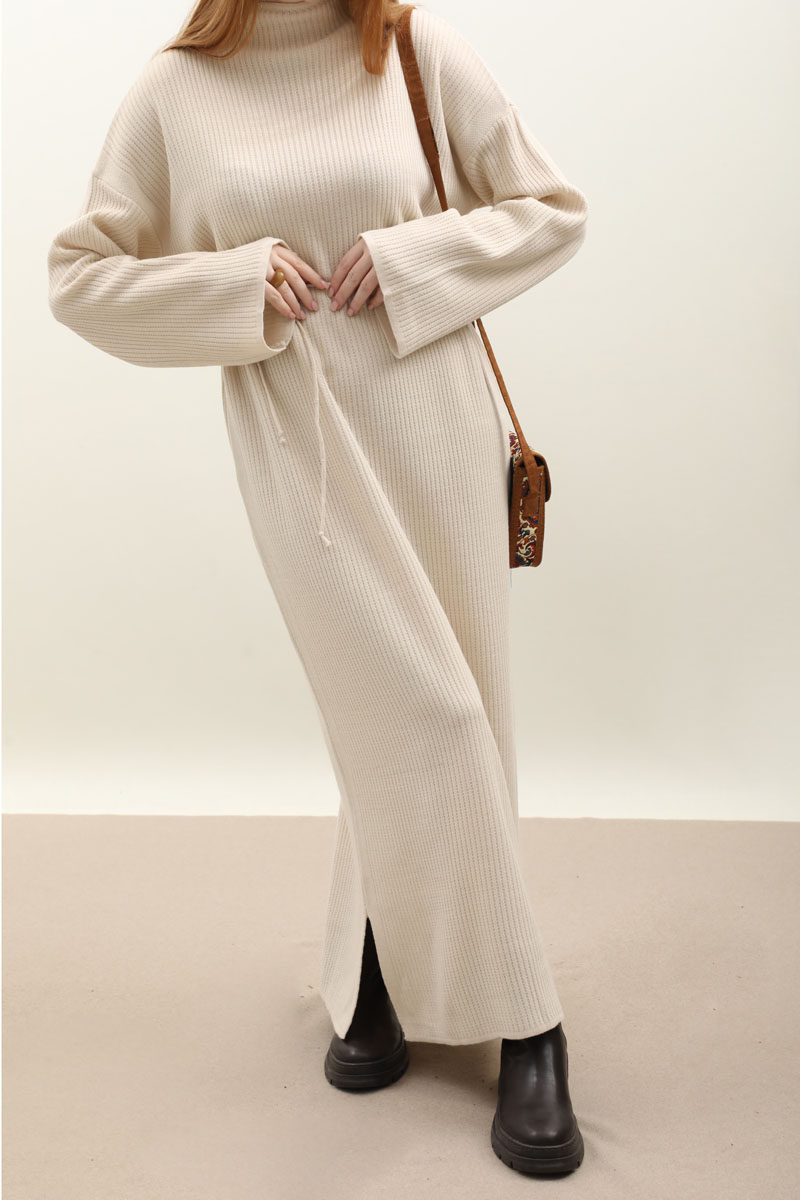 Dik Yaka Triko Elbise Taş. dik yakadır, düşük omuzludur, etek ucu yırtmaçlıdır, ince biye kuşaklıdır, cepsizdir, astarsızdır. Günlük kullanım için uygundur.