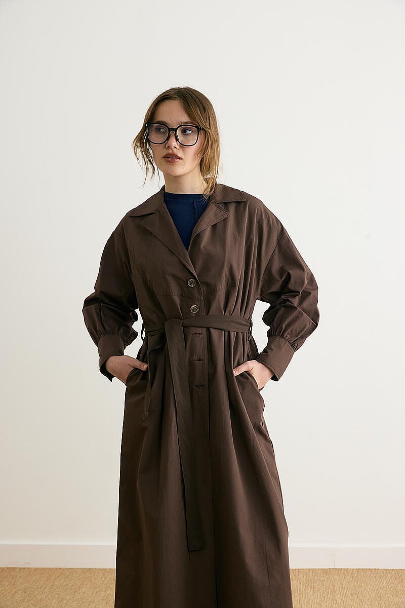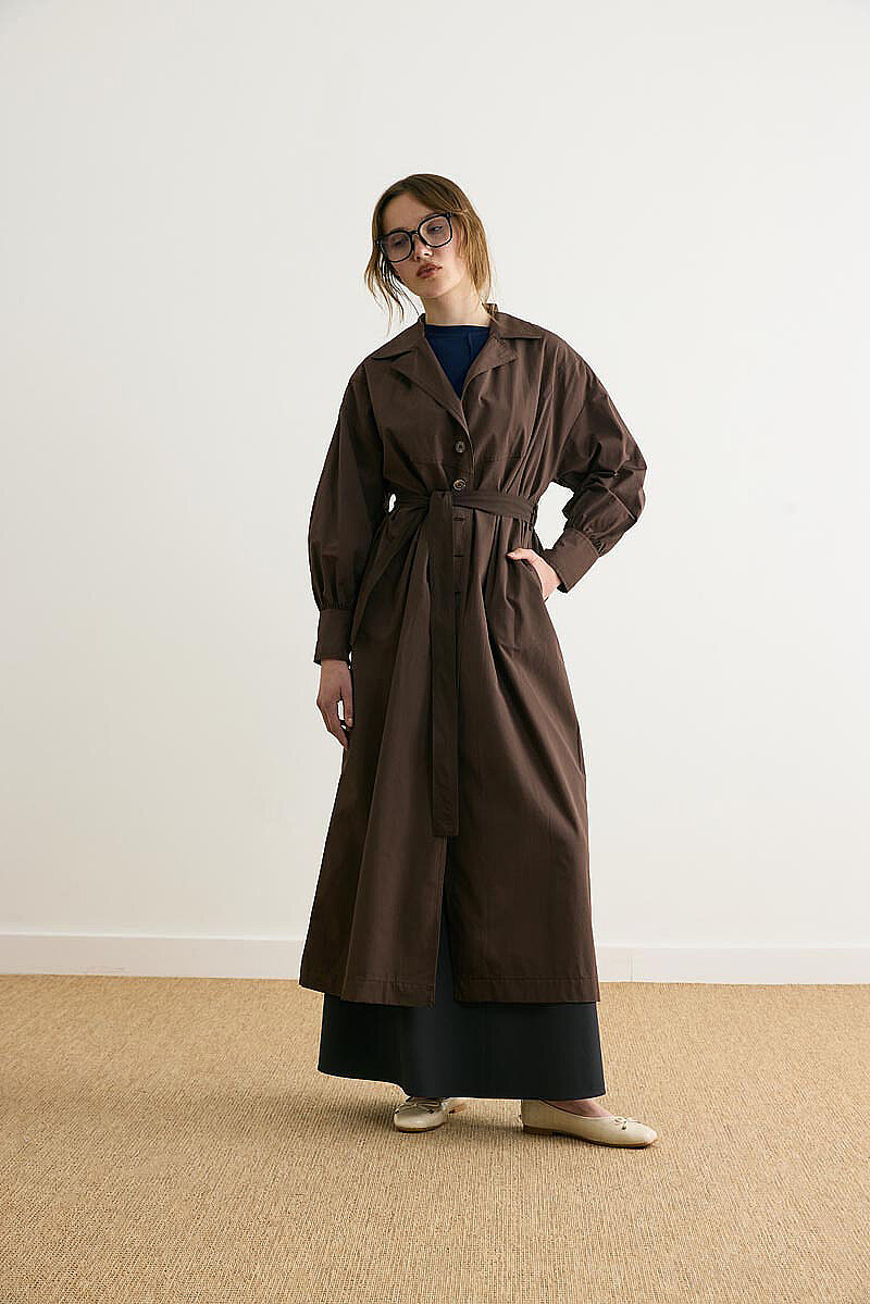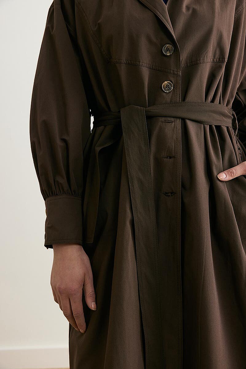 Net hatları ve güçlü formuyla öne çıkan Dikişli Düğmeli Trençkot, klasik trençkot çizgisini modern detaylarla buluşturur. Ceket yaka formu tasarıma dengeli bir duruş kazandırırken, balon kol ve geniş manşet detayları modele karakterli bir görünüm katar. Önden düğmeli yapısı pratik kullanım sunarken, rahat kesimiyle gün boyu konfor sağlar. Günlük şehir stilinden daha düzenli kombinlere kadar geniş bir kullanım alanına sahiptir.