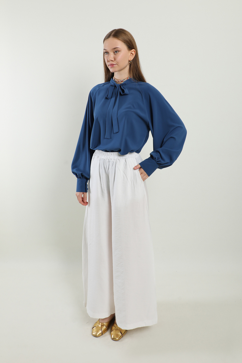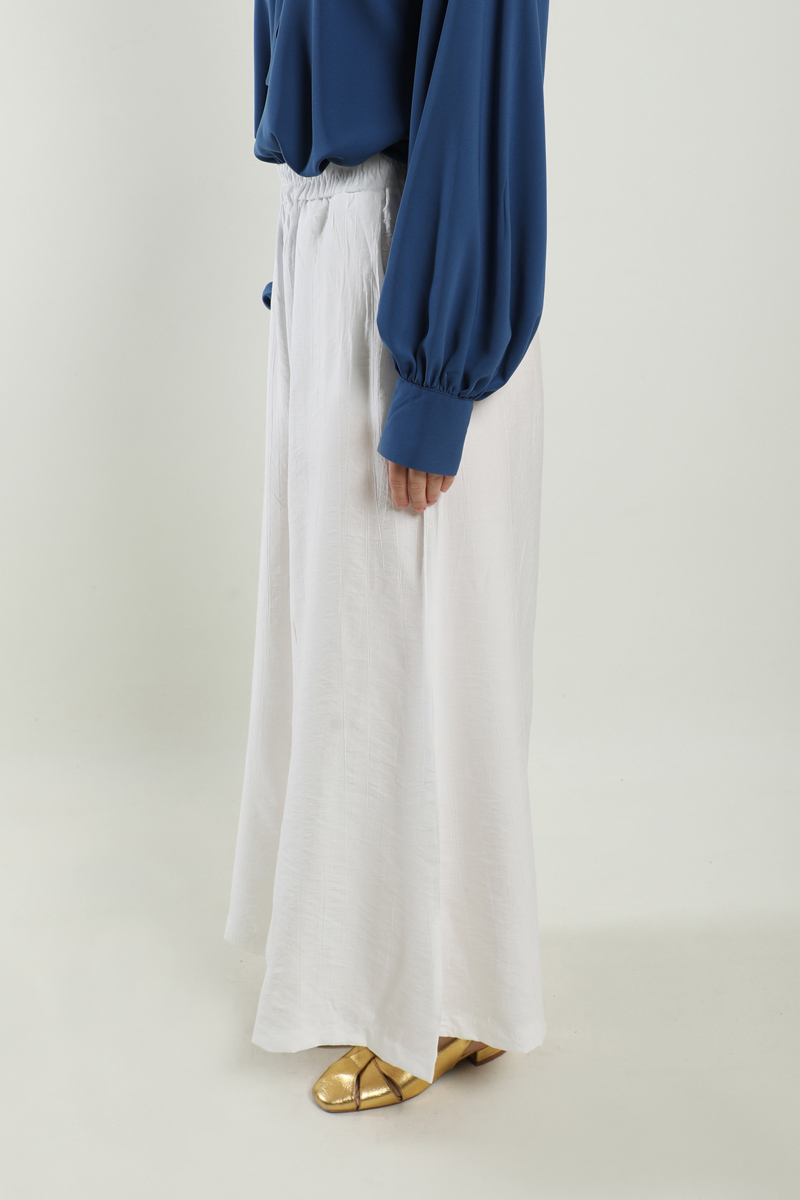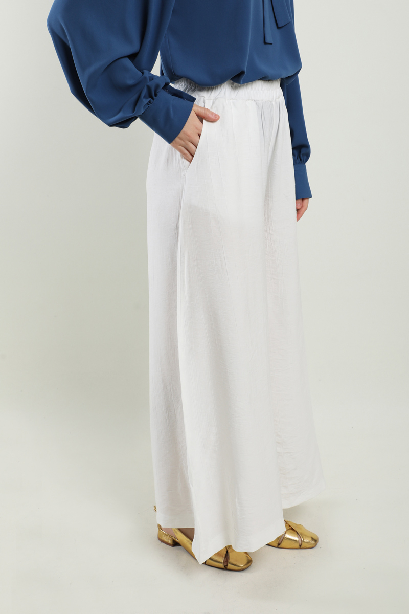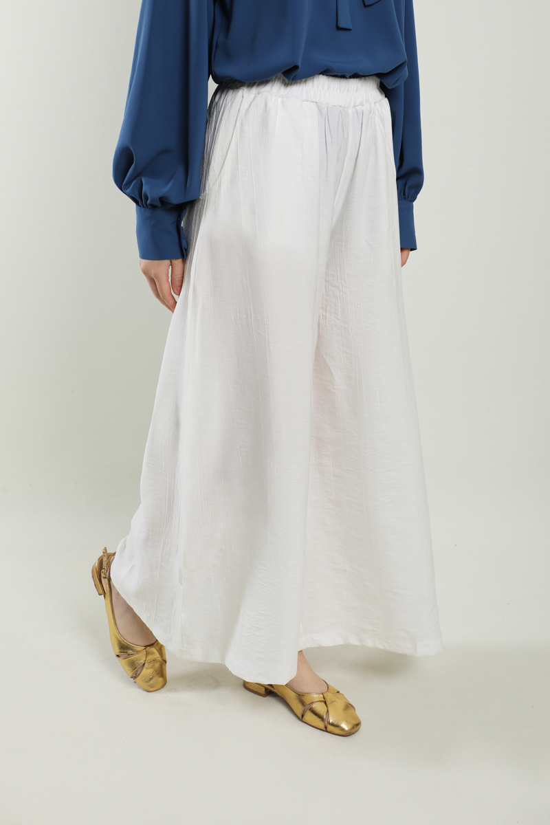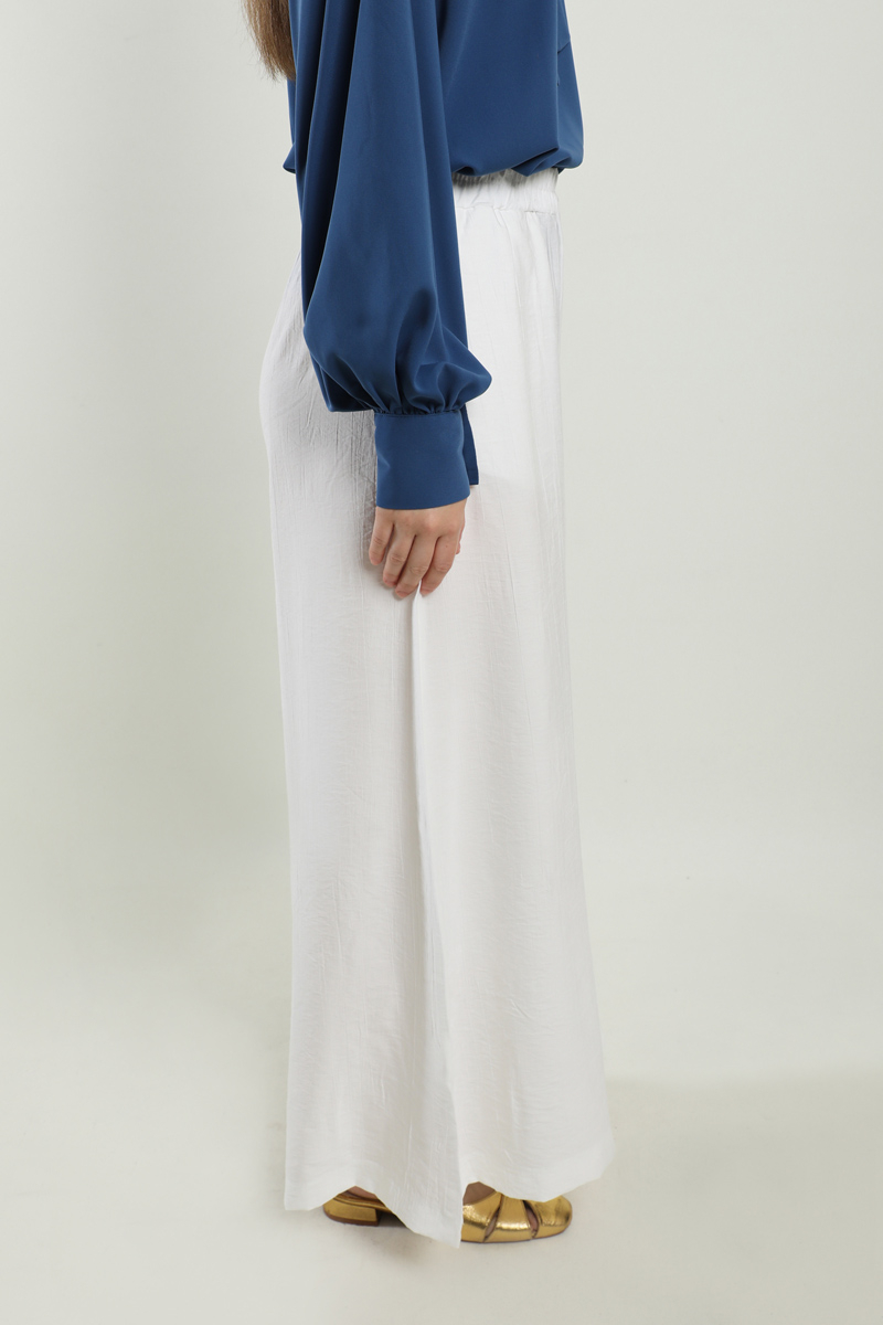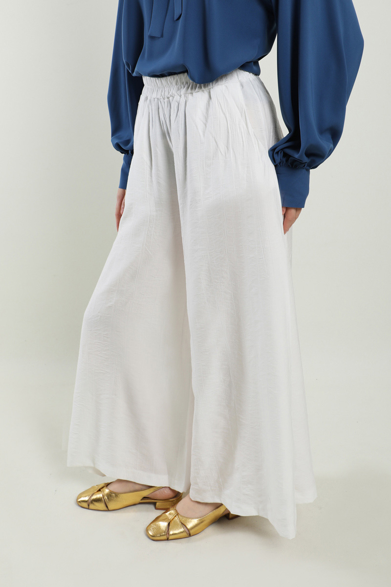 Dokulu Bol Paça Pantolon Beyaz. Beli lastiklidir, yandan ceplidir, geniş paçalıdır, astarsızdır, günlük kullanıma uygundur.