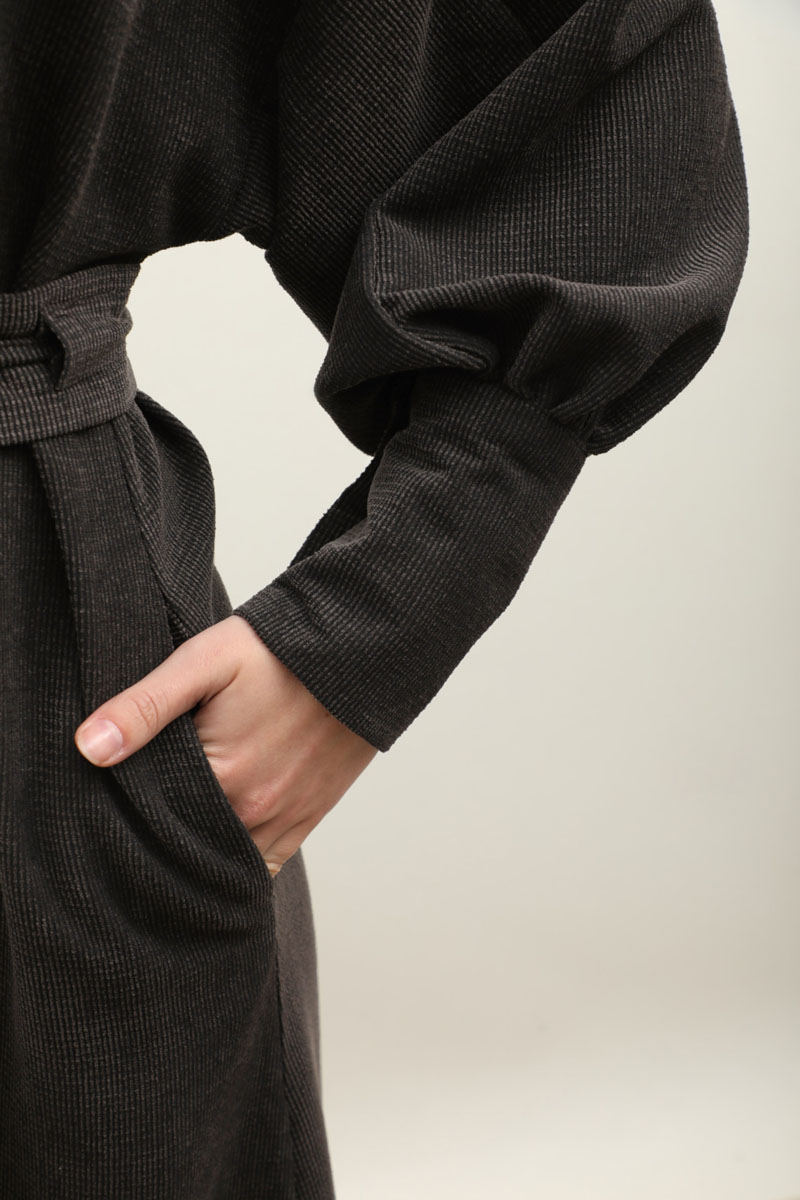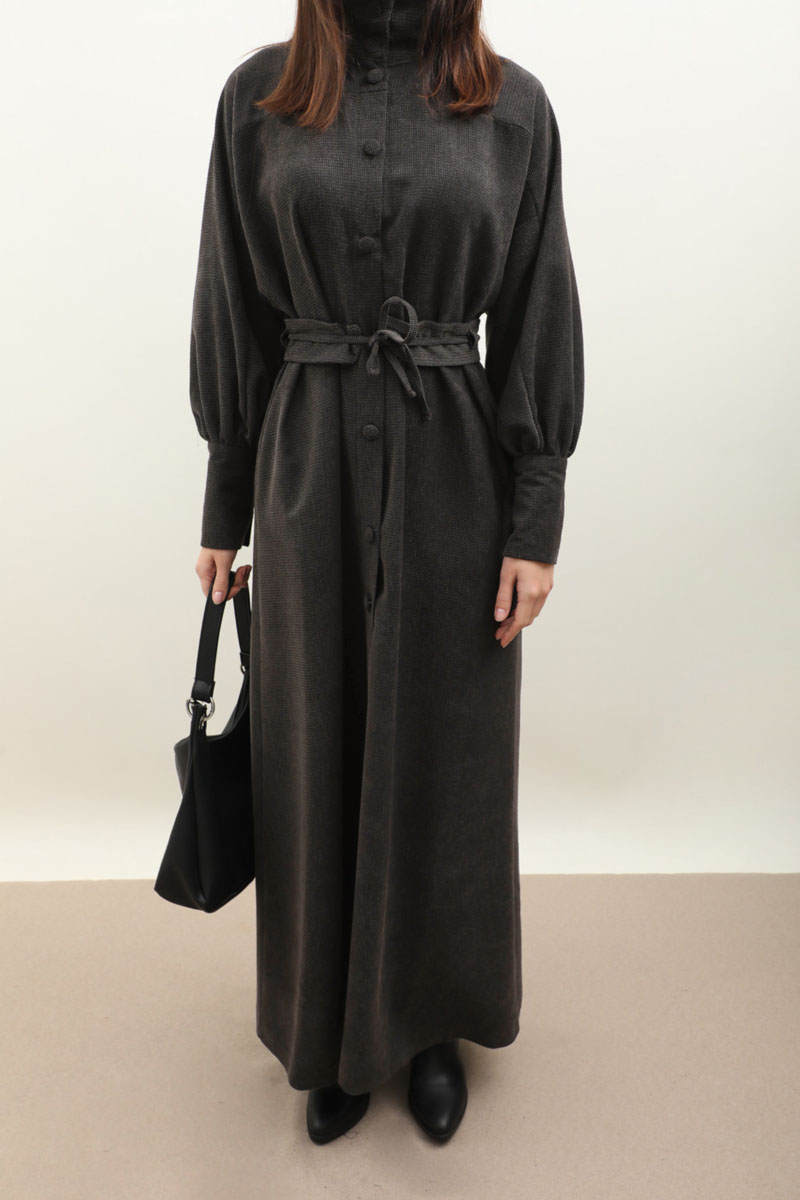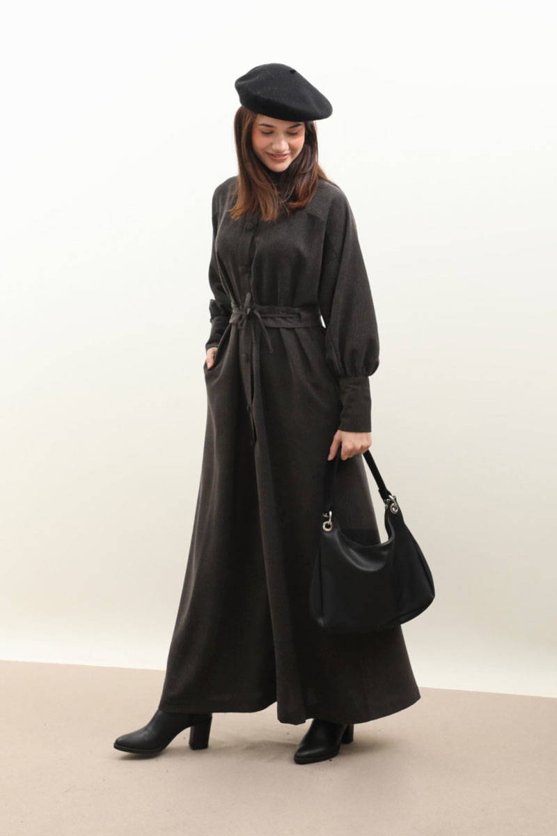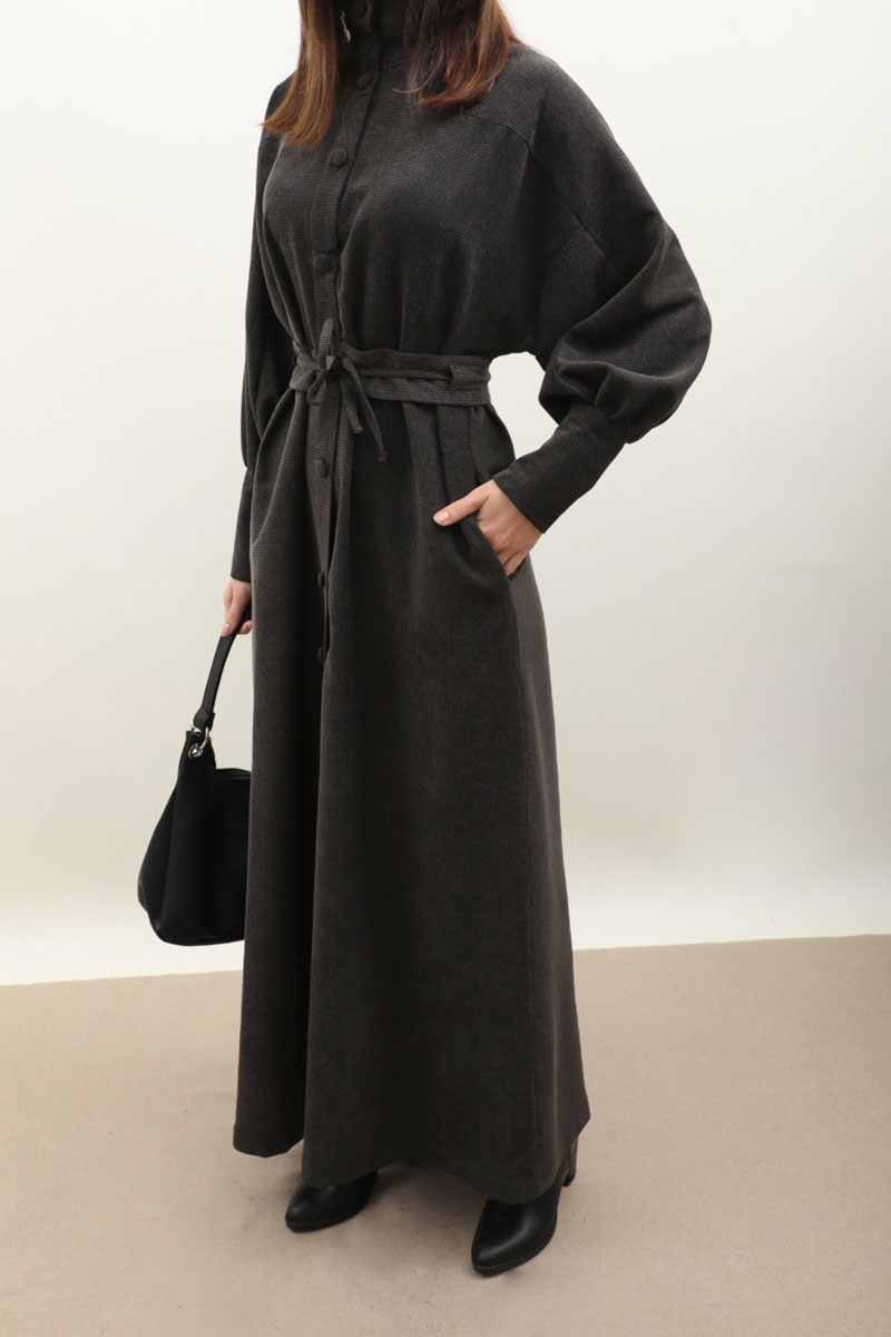 Dokulu Vintage Elbise Antrasit. Yüksek hakim yakadır, önden kapama düğmeli, düşük omuzludur, uzun manşeti ve düğmelidir, yandan gizli cepli, biye tünel tasarım kuşaklıdır, astarsızdır. Günlük kullanım için uygundur.