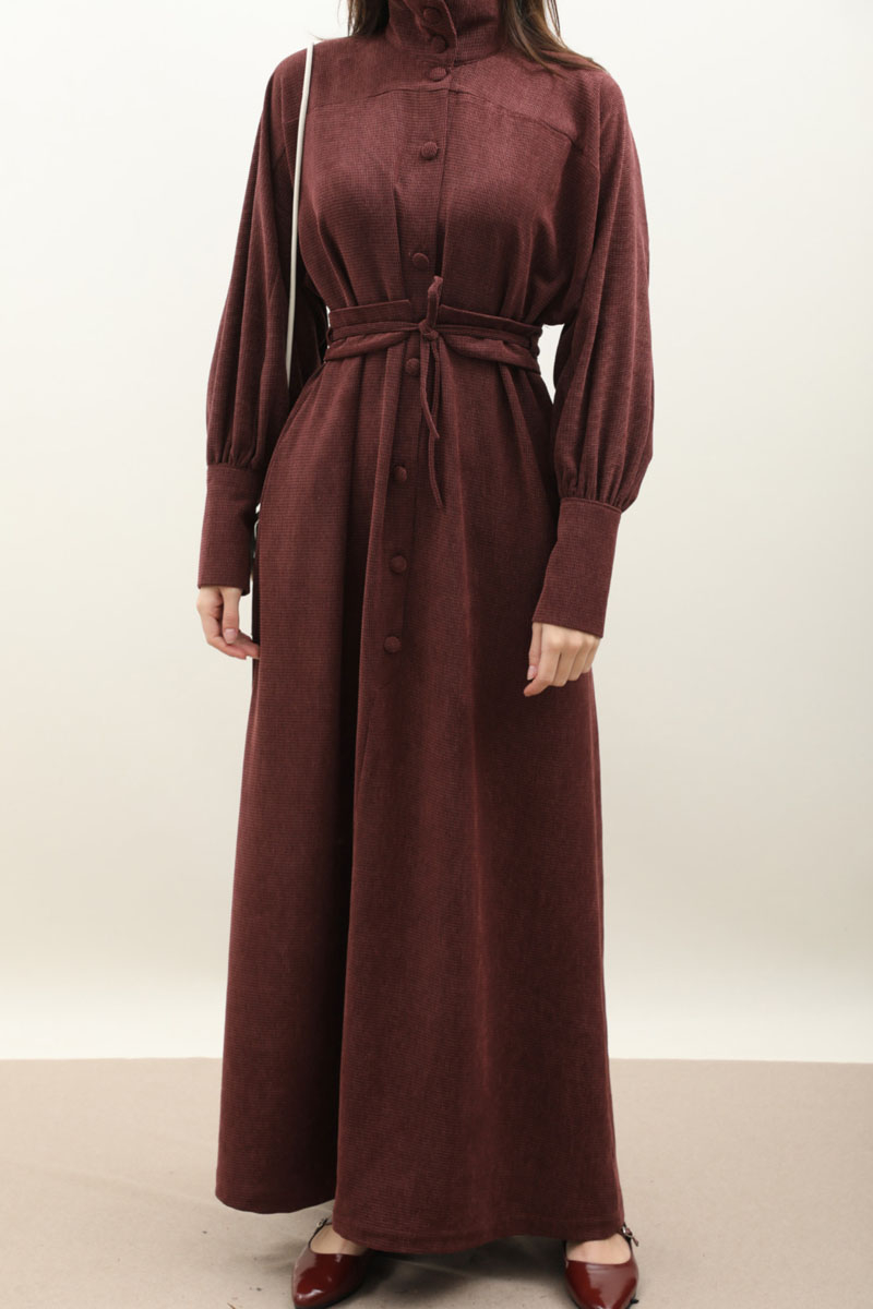 Dokulu Vintage Elbise Bordo. Yüksek hakim yakadır, önden kapama düğmeli, düşük omuzludur, uzun manşeti ve düğmelidir, yandan gizli cepli, biye tünel tasarım kuşaklıdır, astarsızdır. Günlük kullanım için uygundur.
