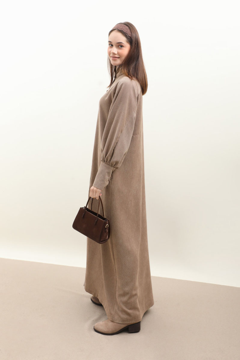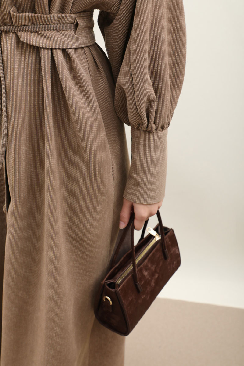 Dokulu Vintage Elbise Vizon. Yüksek hakim yakadır, önden kapama düğmeli, düşük omuzludur, uzun manşeti ve düğmelidir, yandan gizli cepli, biye tünel tasarım kuşaklıdır, astarsızdır. Günlük kullanım için uygundur.