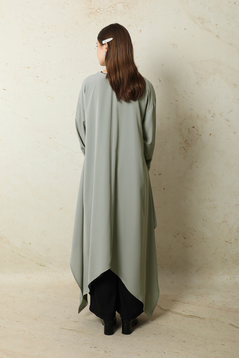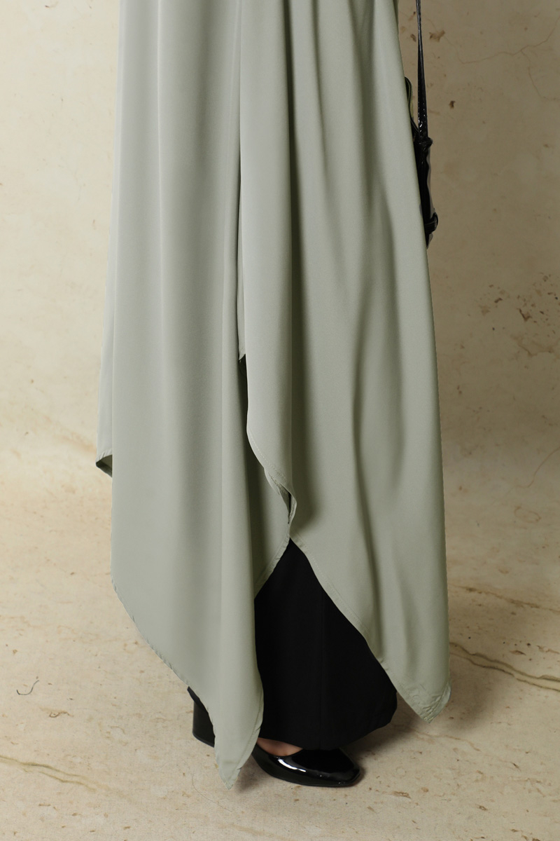 Dökümlü Abaya Gri. Düşük omuzludur. Duble koldur. Eteği asimetriktir. Takım değildir,sadece üsttür.