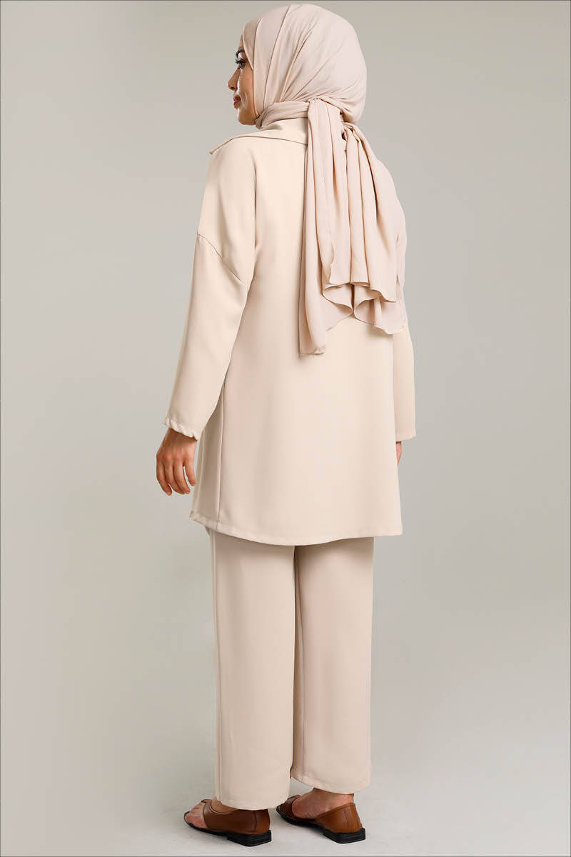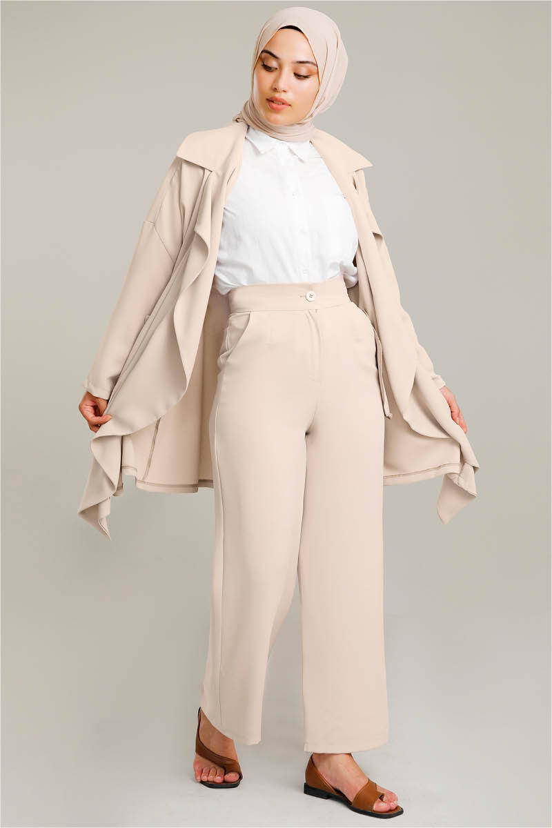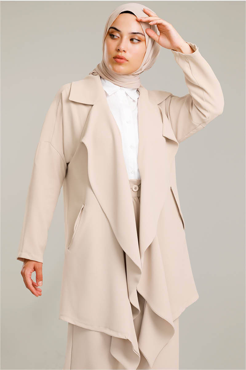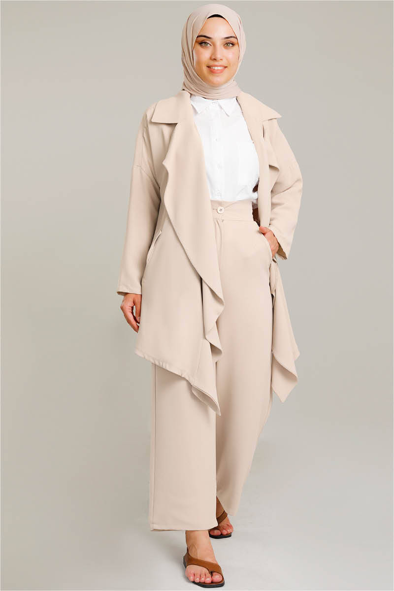 Wide draped collar. Low shoulder. The jacket is buttonless. The jacket has pockets on the sides. The trousers must be buttoned. Wide leg trousers. It is full mold. It is a cottage.