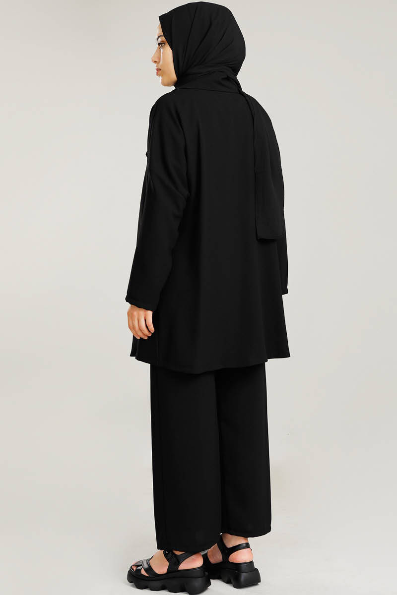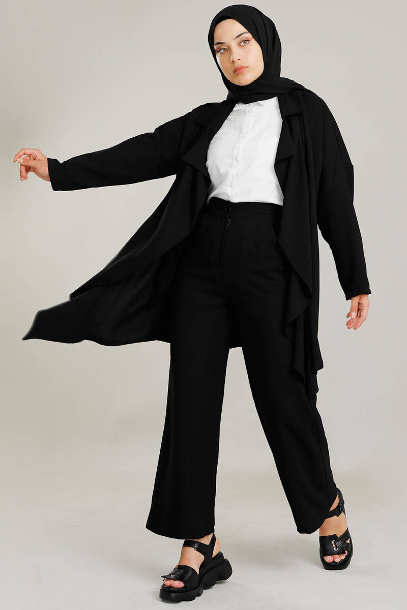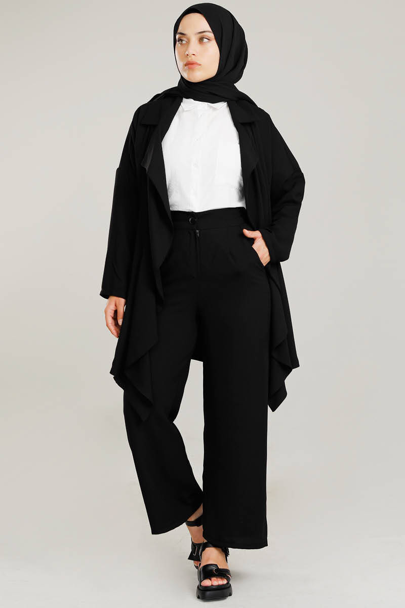 Geniş dökümlü yaka. Düşük omuz. Ceket düğmesizdir. Ceketin yanlarında cepleri mevcuttur. Pantolon düğmelidir. Geniş paça pantolondur. Tam kalıptır. Yazlıktır.